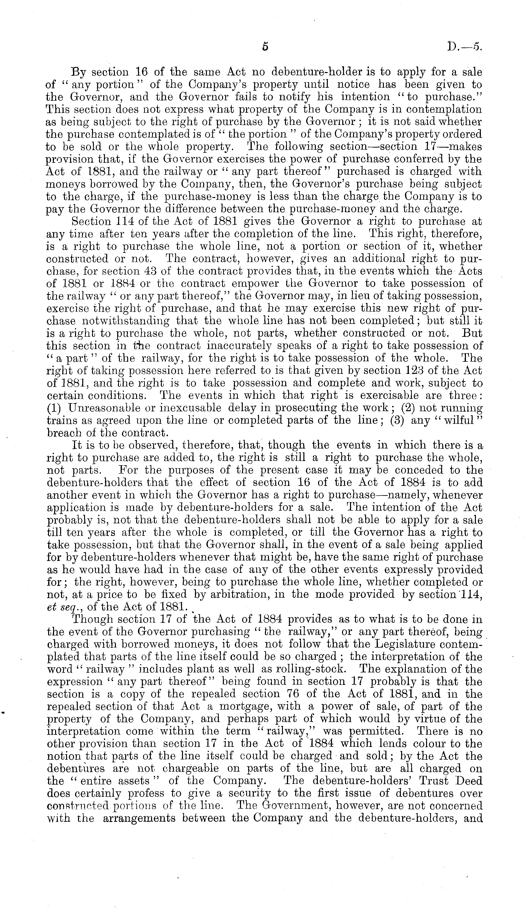 By section 16 of the same Act no debenture-holder is to apply for a sale of " any portion " of the Company's property until notice has been given to the Governor, and the Governor fails to notify his intention "to purchase." This section does not express what property of the Company is in contemplation as being subject to the right of purchase by the Governor ; it is not said whether the purchase contemplated is of " the portion " of the Company's property ordered to be sold or the whole property. The following section—-section 17—makes provision that, if the Governor exercises the power of purchase conferred by the Act of 1881, and the railway or " any part thereof" purchased is charged with moneys borrowed by the Company, then, the Governor's purchase being subject to the charge, if the purchase-money is less than the charge the Company is to pay the Governor the difference between the purchase-money and the charge. Section 114 of the Act of 1881 gives the Governor a right to purchase at any time after ten years after the completion of the line. This right, therefore, is a right to purchase the whole line, not a portion or section of it, whether constructed or not. The contract, however, gives an additional right to purchase, for section 43 of the contract provides that, in the events which the Acts of 1881 or 1884 or the contract empower the Governor to take possession of the railway " or any part thereof," the Governor may, in lieu of taking possession, exercise the right of purchase, and that he may exercise this new right of purchase notwithstanding that the whole line has not been completed; but still it is a right to purchase the whole, not parts, whether constructed or not. But this section in the contract inaccurately speaks of a right to take possession of " a part "of the railway, for the right is to take possession of the whole. The right of taking possession here referred to is that given by section 123 of the Act of 1881, and the right is to take possession and complete and work, subject to certain conditions. The events in which that right is exercisable are three: (1) Unreasonable or inexcusable delay in prosecuting the work ; (2) not running trains as agreed upon the line or completed parts of the line; (3) any "wilful" breach of the contract. It is to be observed, therefore, that, though the events in which there is a right to purchase are added to, the right is still a right to purchase the whole, not parts. For the purposes of the present case it may be conceded to the debenture-holders that the effect of section 16 of the Act of 1884 is to add another event in which the Governor has a right to purchase—namely, whenever application is made by debenture-holders for a sale. The intention of the Act probably is, not that the debenture-holders shall not be able to apply for a sale till ten years after the whole is completed, or till the Governor has a right to take possession, but that the Governor shall, in the event of a sale being applied for by debenture-holders whenever that might be, have the same right of purchase as he would have had in the case of any of the other events expressly provided for; the right, however, being to purchase the whole line, whether completed or not, at a price to be fixed by arbitration, in the mode provided by section 114, et seq., of the Act of 1881. m Though section 17 of the Act of 1884 provides as to what is to be done in the event of the Governor purchasing " the railway," or any part thereof, being charged with borrowed moneys, it does not follow that the Legislature contemplated that parts of the line itself could be so charged ; the interpretation of the word " railway " includes plant as well as rolling-stock. The explanation of the expression " any part thereof" being found in section 17 probably is that the section is a copy of the repealed section 76 of the Act of 1881, and in the repealed section of that Act a mortgage, with a power of sale, of part of the property of the Company, and perhaps part of which would by virtue of the interpretation come within the term "railway," was permitted. There is no other provision than section 17 in the Act of 1884 which lends colour to the notion that parts of the line itself could be charged and sold; by the Act the debentures are not chargeable on parts of the line, but are all charged on the " entire assets " of the Company. The debenture-holders' Trust Deed does certainly profess to give a security to the first issue of debentures over constructed portions of the line. The Government, however, are not concerned with the arrangements between the Company and the debenture-holders, and