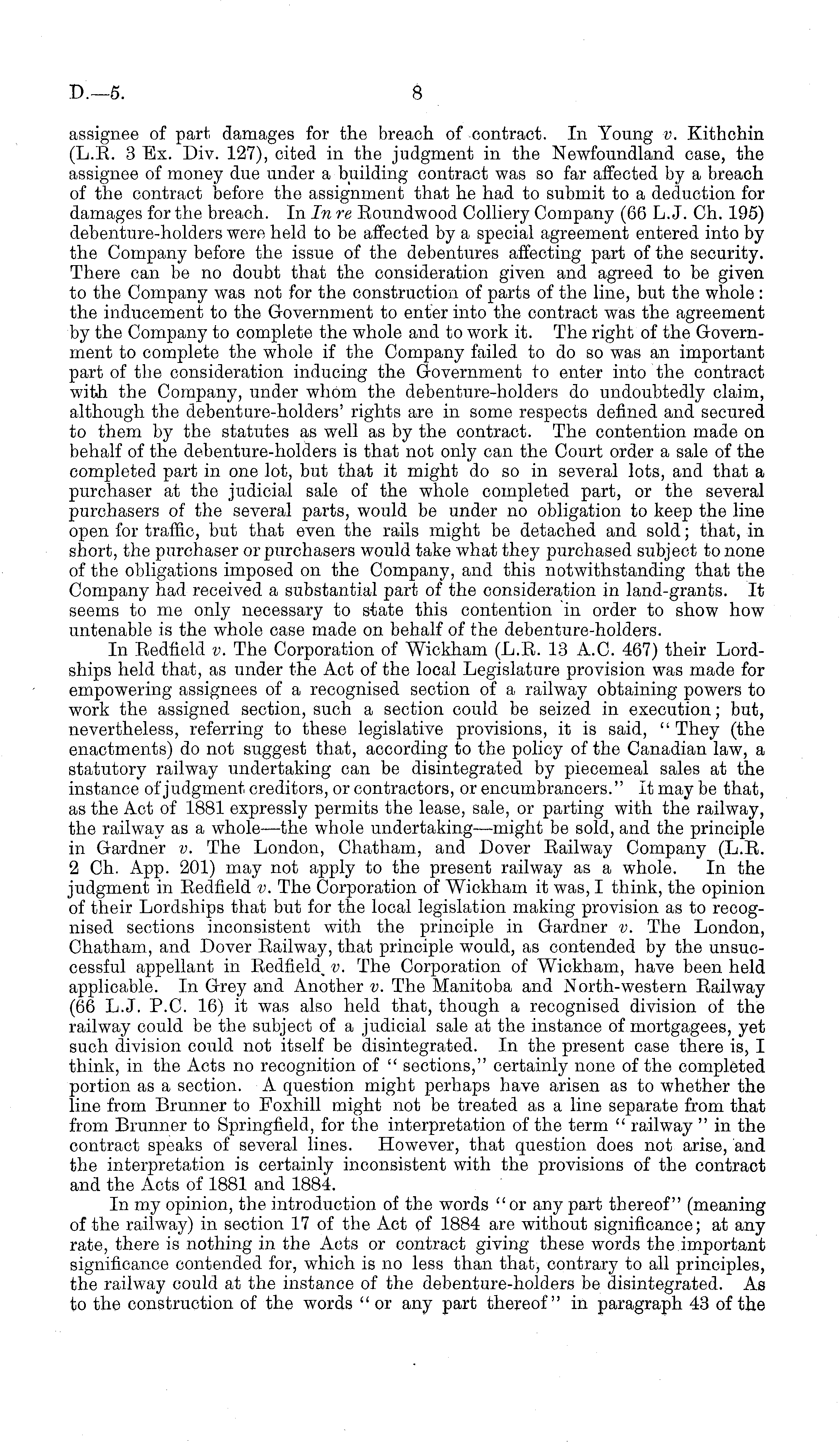 assignee of part damages for the breach of contract. In Young v. Kithchin (L.E. 3 Ex. Div. 127), cited in the judgment in the Newfoundland case, the assignee of money due under a building contract was so far affected by a breach of the contract before the assignment that he had to submit to a deduction for damages for the breach. In In re Eoundwood Colliery Company (66 L.J. Ch. 195) debenture-holders were held to be affected by a special agreement entered into by the Company before the issue of the debentures affecting part of the security. There can be no doubt that the consideration given and agreed to be given to the Company was not for the construction of parts of the line, but the whole : the inducement to the Government to enter into the contract was the agreement by the Company to complete the whole and to work it. The right of the Government to complete the whole if the Company failed to do so was an important part of the consideration inducing the Government to enter into the contract with the Company, under whom the debenture-holders do undoubtedly claim, although the debenture-holders' rights are in some respects defined and secured to them by the statutes as well as by the contract. The contention made on behalf of the debenture-holders is that not only can the Court order a sale of the completed part in one lot, but that it might do so in several lots, and that a purchaser at the judicial sale of the whole completed part, or the several purchasers of the several parts, would be under no obligation to keep the line open for traffic, but that even the rails might be detached and sold; that, in short, the purchaser or purchasers would take what they purchased subject to none of the obligations imposed on the Company, and this notwithstanding that the Company had received a substantial part of the consideration in land-grants. It seems to me only necessary to state this contention in order to show how untenable is the whole case made on behalf of the debenture-holders. In Eedfield v. The Corporation of Wickham (L.E. 13 A.C. 467) their Lordships held that, as under the Act of the local Legislature provision was made for empowering assignees of a recognised section of a railway obtaining powers to work the assigned section, such a section could be seized in execution; but, nevertheless, referring to these legislative provisions, it is said, " They (the enactments) do not suggest that, according to the policy of the Canadian law, a statutory railway undertaking can be disintegrated by piecemeal sales at the instance of judgment creditors, or contractors, or encumbrancers." It may be that, as the Act of 1881 expressly permits the lease, sale, or parting with the railway, the railway as a whole—the whole undertaking—might be sold, and the principle in Gardner v. The London, Chatham, and Dover Eailway Company (L.E. 2 Ch. App. 201) may not apply to the present railway as a whole. In the judgment in Eedfield v. The Corporation of Wickham it was, I think, the opinion of their Lordships that but for the local legislation making provision as to recognised sections inconsistent with the principle in Gardner v. The London, Chatham, and Dover Eailway, that principle would, as contended by the unsuccessful appellant in Eedfield, v. The Corporation of Wickham, have been held applicable. In Grey and Another v. The Manitoba and North-western Eailway (66 L.J. P.C. 16) it was also held that, though a recognised division of the railway could be the subject of a judicial sale at the instance of mortgagees, yet such division could not itself be disintegrated. In the present case there is, I think, in the Acts no recognition of " sections," certainly none of the completed portion as a section. A question might perhaps have arisen as to whether the line from Brunner to Foxhill might not be treated as a line separate from that from Brunner to Springfield, for the interpretation of the term " railway " in the contract speaks of several hnes. However, that question does not arise, and the interpretation is certainly inconsistent with the provisions of the contract and the Acts of 1881 and 1884. In my opinion, the introduction of the words "or any part thereof" (meaning of the railway) in section 17 of the Act of 1884 are without significance; at any rate, there is nothing in the Acts or contract giving these words the important significance contended for, which is no less than that, contrary to all principles, the railway could at the instance of the debenture-holders be disintegrated. As to the construction of the words " or any part thereof" in paragraph 43 of the