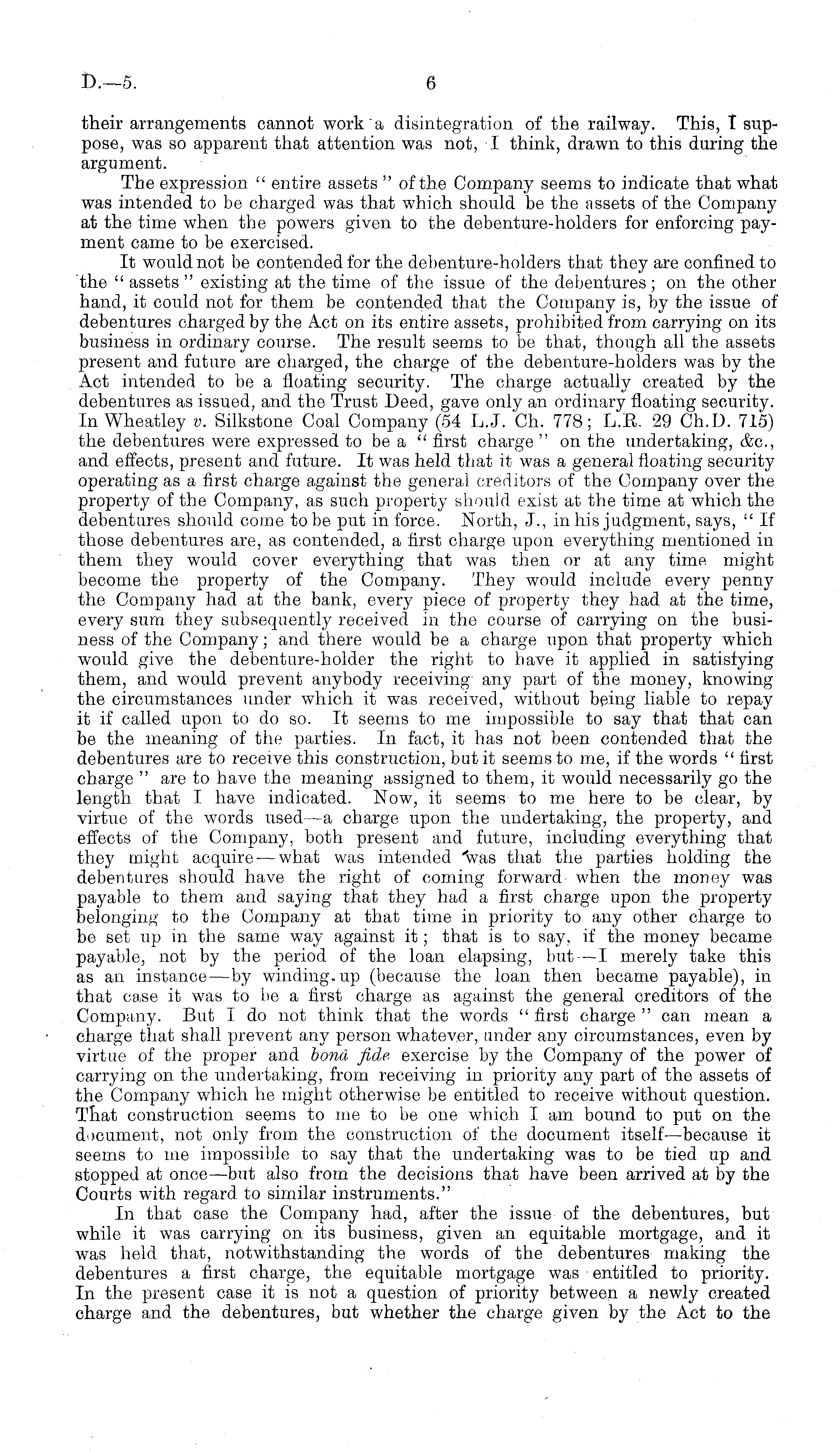 their arrangements cannot work a disintegration of the railway. This, I suppose, was so apparent that attention was not, I think, drawn to this during the argument. The expression " entire assets " of the Company seems to indicate that what was intended to be charged was that which should be the assets of the Company at the time when the powers given to the debenture-holders for enforcing payment came to be exercised. It would not be contended for the debenture-holders that they are confined to the " assets " existing at the time of the issue of the debentures; on the other hand, it could not for them be contended that the Company is, by the issue of debentures charged by the Act on its entire assets, prohibited from carrying on its business in ordinary course. The result seems to be that, though all the assets present and future are charged, the charge of the debenture-holders was by the Act intended to be a floating security. The charge actually created by the debentures as issued, and the Trust Deed, gave only an ordinary floating security. In Wheatley v. Silkstone Coal Company (54 L.J. Ch. 778; L.E. 29 Ch.D. 715) the debentures were expressed to be a " first charge " on the undertaking, &c, and effects, present and future. It was held that it was a general floating security operating as a first charge against the general creditors of the Company over the property of the Company, as such property should exist at the time at which the debentures should come to be put in force. North, J., in his judgment, says, "If those debentures are, as contended, a first charge upon everything mentioned in them they would cover everything that was then or at any time might become the property of the Company. They would include every penny the Company had at the bank, every piece of property they had at the time, every sum they subsequently received in the course of carrying on the business of the Company; and there would be a charge upon that property which would give the debenture-holder the right to have it applied in satisfying them, and would prevent anybody receiving any part of the money, knowing the circumstances under which it was received, without being liable to repay it if called upon to do so. It seems to me impossible to say that that can be the meaning of the parties. In fact, it has not been contended that the debentures are to receive this construction, but it seems to me, if the words " first charge " are to have the meaning assigned to them, it would necessarily go the length that I have indicated. Now, it seems to me here to be clear, by virtue of the words used —a charge upon the undertaking, the property, and effects of the Company, both present and future, including everything that they might acquire — what was intended 'was that the parties holding the debentures should have the right of coming forward when the money was payable to them and saying that they had a first charge upon the property belonging to the Company at that time in priority to any other charge to be set up in the same way against it; that is to say, if the money became payable, not by the period of the loan elapsing, but—l merely take this as an instance —by winding-up (because the loan then became payable), in that case it was to be a first charge as against the general creditors of the Company. But I do not think that the words " first charge " can mean a charge that shall prevent any person whatever, under any circumstances, even by virtue of the proper and bond fide exercise by the Company of the power of carrying on the undertaking, from receiving in priority any part of the assets of the Company which he might otherwise be entitled to receive without question. That construction seems to me to be one which I am bound to put on the document, not only from the construction of the document itself —because it seems to me impossible to say that the undertaking was to be tied up and stopped at onee —but also from the decisions that have been arrived at by the Courts with regard to similar instruments." In that case the Company had, after the issue of the debentures, but while it was carrying on its business, given an equitable mortgage, and it was held that, notwithstanding the words of the debentures making the debentures a first charge, the equitable mortgage was entitled to priority. In the present case it is not a question of priority between a newly created charge and the debentures, but whether the charge given by the Act to the