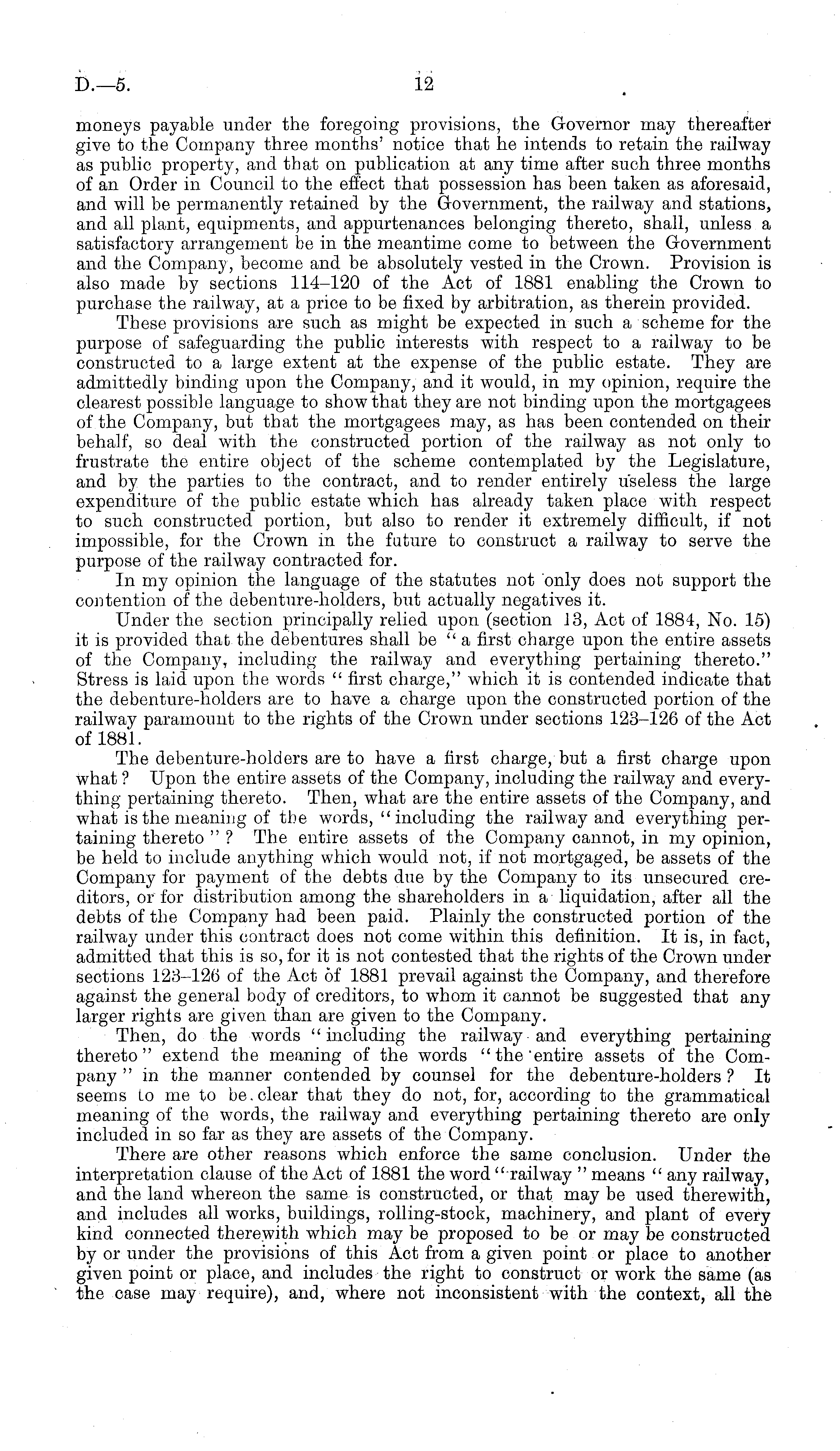 moneys payable under the foregoing provisions, the Governor may thereafter give to the Company three months' notice that he intends to retain the railway as public property, and that on publication at any time after such three months of an Order in Council to the effect that possession has been taken as aforesaid, and will be permanently retained by the Government, the railway and stations, and all plant, equipments, and appurtenances belonging thereto, shall, unless a satisfactory arrangement be in the meantime come to between the Government and the Company, become and be absolutely vested in the Crown. Provision is also made by sections 114-120 of the Act of 1881 enabling the Crown to purchase the railway, at a price to be fixed by arbitration, as therein provided. These provisions are such as might be expected in such a scheme for the purpose of safeguarding the public interests with respect to a railway to be constructed to a large extent at the expense of the public estate. They are admittedly binding upon the Company, and it would, in my opinion, require the clearest possible language to show that they are not binding upon the mortgagees of the Company, but that the mortgagees may, as has been contended on their behalf, so deal with the constructed portion of the railway as not only to frustrate the entire object of the scheme contemplated by the Legislature, and by the parties to the contract, and to render entirely useless the large expenditure of the public estate which has already taken place with respect to such constructed portion, but also to render it extremely difficult, if not impossible, for the Crown in the future to construct a railway to serve the purpose of the railway contracted for. In my opinion the language of the statutes not only does not support the contention of the debenture-holders, but actually negatives it. Under the section principally relied upon (section 13, Act of 1884, No. 15) it is provided that the debentures shall be " a first charge upon the entire assets of the Company? including the railway and everything pertaining thereto." Stress is laid upon the words " first charge," which it is contended indicate that the debenture-holders are to have a charge upon the constructed portion of the railway paramount to the rights of the Crown under sections 123-126 of the Act of 1881. The debenture-holders are to have a first charge, but a first charge upon what ? Upon the entire assets of the Company, including the railway and everything pertaining thereto. Then, what are the entire assets of the Company, and what is the meaning of the words, "including the railway and everything pertaining thereto " ? The entire assets of the Company cannot, in my opinion, be held to include anything which would not, if not mortgaged, be assets of the Company for payment of the debts due by the Company to its unsecured creditors, or for distribution among the shareholders in a liquidation, after all the debts of the Company had been paid. Plainly the constructed portion of the railway under this contract does not come within this definition. It is, in fact, admitted that this is so, for it is not contested that the rights of the Crown under sections 123-126 of the Act of 1881 prevail against the Company, and therefore against the general body of creditors, to whom it cannot be suggested that any larger rights are given than are given to the Company. Then, do the words "including the railway and everything pertaining thereto" extend the meaning of the words "the'entire assets of the Company " in the manner contended by counsel for the debenture-holders ? It seems lo me to be. clear that they do not, for, according to the grammatical meaning of the words, the railway and everything pertaining thereto are only included in so far as they are assets of the Company. There are other reasons which enforce the same conclusion. Under the interpretation clause of the Act of 1881 the word "railway " means " any railway, and the land whereon the same is constructed, or that may be used therewith, and includes all works, buildings, rolling-stock, machinery, and plant of every kind connected therewith which may be proposed to be or may be constructed by or under the provisions of this Act from a given point or place to another given point or place, and includes the right to construct or work the same (as the case may require), and, where not inconsistent with the context, all the