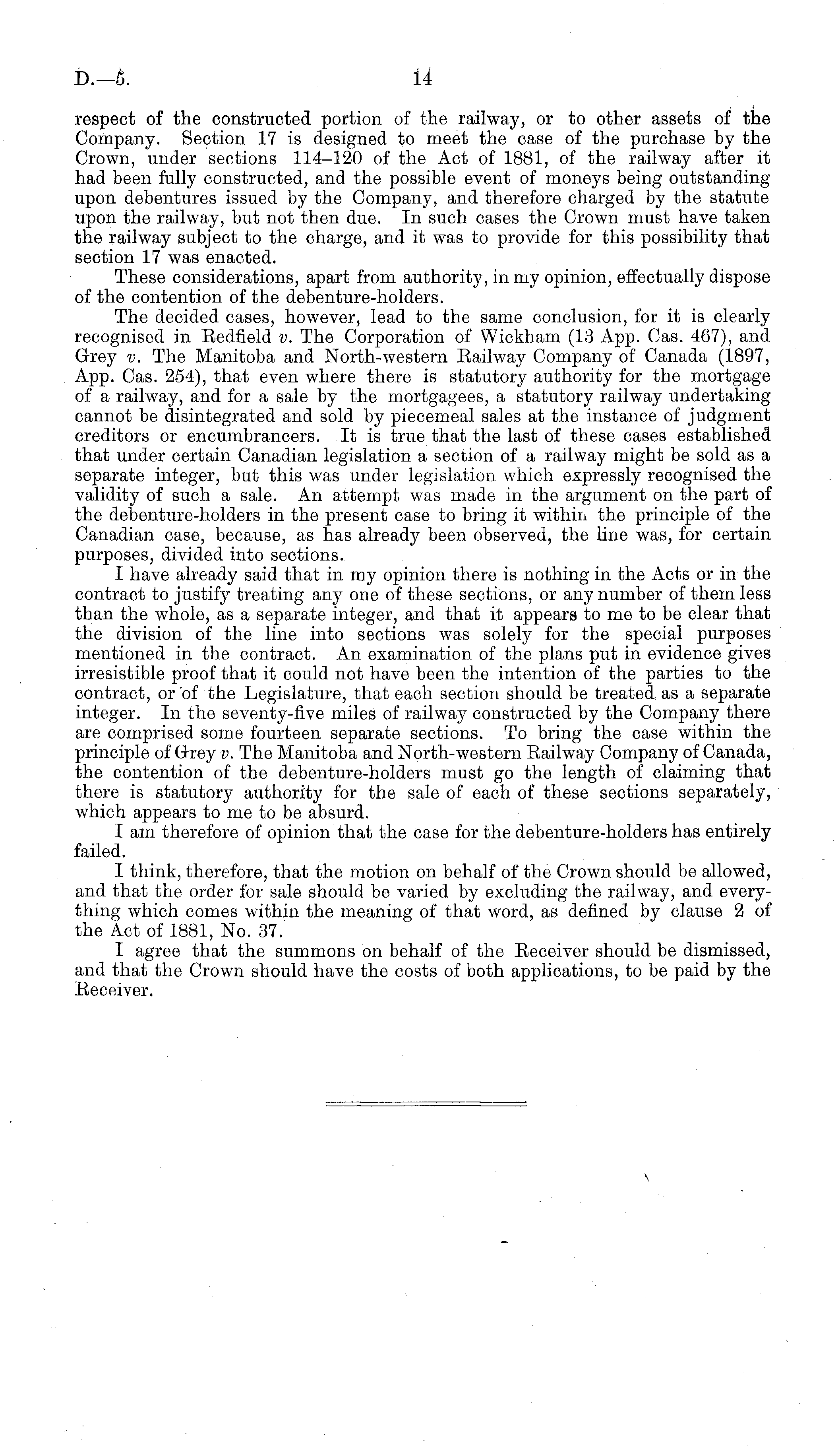 respect of the constructed portion of the railway, or to other assets of the Company. Section 17 is designed to meet the case of the purchase by the Crown, under sections 114-120 of the Act of 1881, of the railway after it had been fully constructed, and the possible event of moneys being outstanding upon debentures issued by the Company, and therefore charged by the statute upon the railway, but not then due. In such cases the Crown must have taken the railway subject to the charge, and it was to provide for this possibility that section 17 was enacted. These considerations, apart from authority, in my opinion, effectually dispose of the contention of the debenture-holders. The decided cases, however, lead to the same conclusion, for it is clearly recognised in Eedfield v. The Corporation of Wickham (13 App. Cas. 467), and Grey v. The Manitoba and North-western Eailway Company of Canada (1897, App. Cas. 254), that even where there is statutory authority for the mortgage of a railway, and for a sale by the mortgagees, a statutory railway undertaking cannot be disintegrated and sold by piecemeal sales at the instance of judgment creditors or encumbrancers. It is true that the last of these cases established that under certain Canadian legislation a section of a railway might be sold as a separate integer, but this was under legislation which expressly recognised the validity of such a sale. An attempt, was made in the argument on the part of the debenture-holders in the present case to bring it within the principle of the Canadian case, because, as has already been observed, the line was, for certain purposes, divided into sections. I have already said that in my opinion there is nothing in the Acts or in the contract to justify treating any one of these sections, or any number of them less than the whole, as a separate integer, and that it appears to me to be clear that the division of the line into sections was solely for the special purposes mentioned in the contract. An examination of the plans put in evidence gives irresistible proof that it could not have been the intention of the parties to the contract, or of the Legislature, that each section should be treated as a separate integer. In the seventy-five miles of railway constructed by the Company there are comprised some fourteen separate sections. To bring the case within the principle of Grey v. The Manitoba and North-western Eailway Company of Canada, the contention of the debenture-holders must go the length of claiming that there is statutory authority for the sale of each of these sections separately, which appears to me to be absurd. I am therefore of opinion that the case for the debenture-holders has entirely failed. I think, therefore, that the motion on behalf of the Crown should be allowed, and that the order for sale should be varied by excluding the railway, and everything which comes within the meaning of that word, as defined by clause 2 of the Act of 1881, No. 37. I agree that the summons on behalf of the Eeceiver should be dismissed, and that the Crown should have the costs of both applications, to be paid by the Eeceiver.