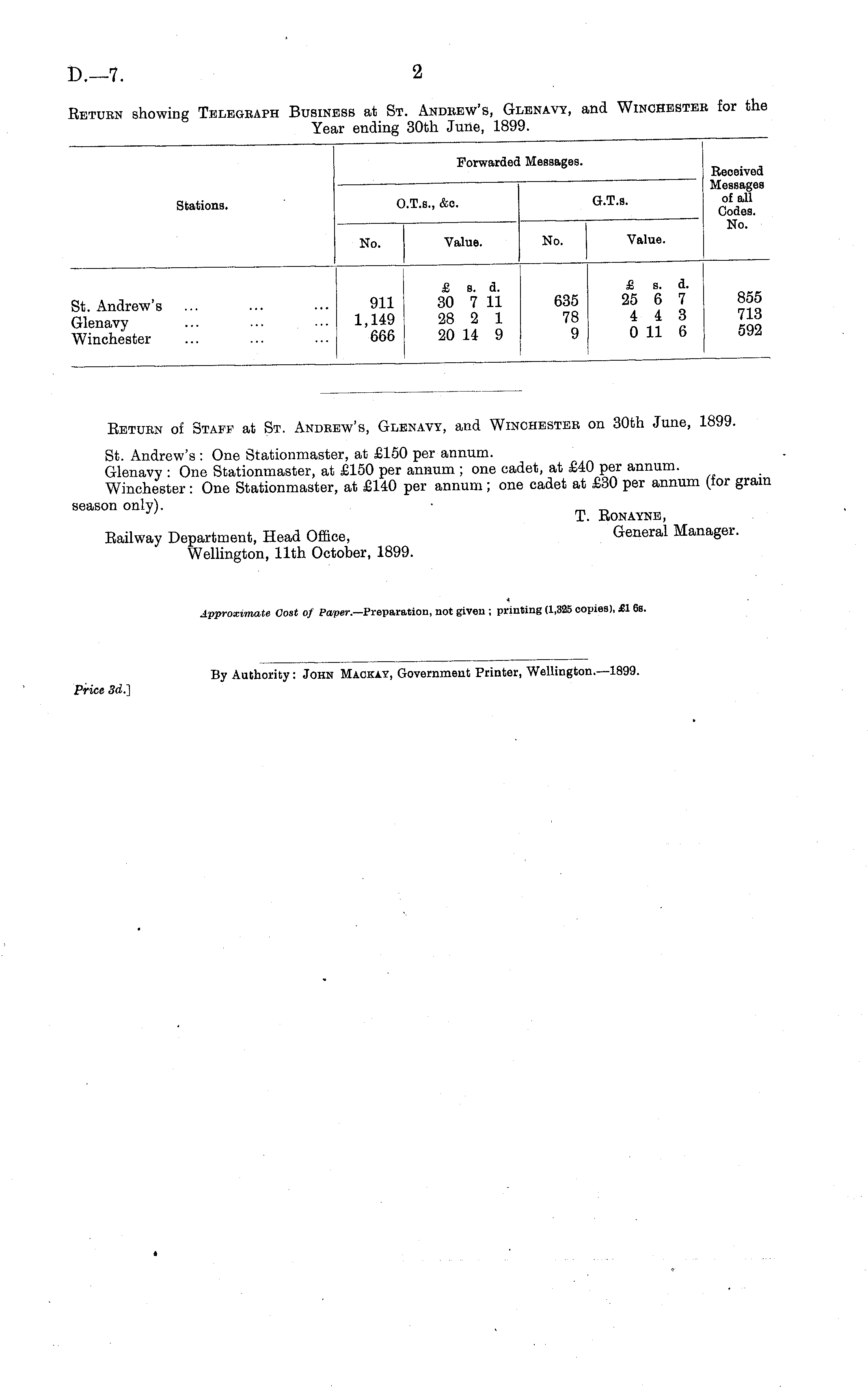 Return of Staff at St. Andrew's, Glenavy, and Winchester on 30th June, 1899. St. Andrew's : One Stationmaster, at £150 per annum. Glenavy : One Stationmaster, at £150 per annum ; one cadet, at £40 per annum. Winchester : One Stationmaster, at £140 per annum ; one cadet at £30 per annum (tor gram season only). • _ _ JJ T. Ronaynb, Railway Department, Head Office, General Manager. Wellington, 11th October, 1899. Approximate Cost of Paper.— Preparation, not given ; printing (1,325 copies), £1 6s.