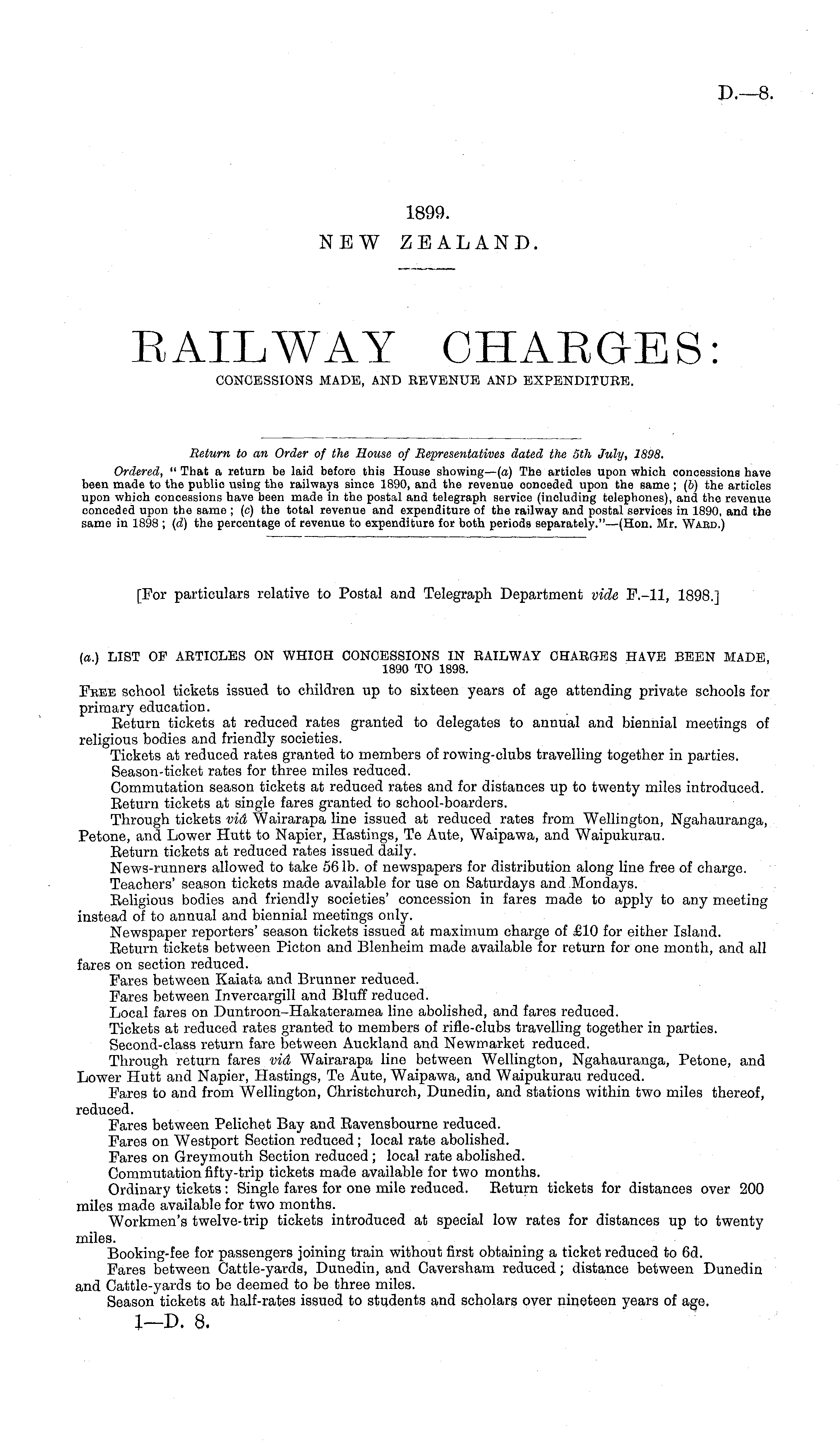[For particulars relative to Postal and Telegraph Department vide F.-11, 1898.] (a.) LIST OF ARTICLES ON WHICH CONCESSIONS IN RAILWAY CHARGES HAVE BEEN MADE, 1890 TO 1898. Fbee school tickets issued to children up to sixteen years of age attending private schools for primary education. Return tickets at reduced rates granted to delegates to annual and biennial meetings of religious bodies and friendly societies. Tickets at reduced rates granted to members of rowing-clubs travelling together in parties. Season-ticket rates for three miles reduced. Commutation season tickets at reduced rates and for distances up to twenty miles introduced. Return tickets at single fares granted to school-boarders. Through tickets vid Wairarapa line issued at reduced rates from Wellington, Ngahauranga, Petone, and Lower Hutt to Napier, Hastings, Te Aute, Waipawa, and Waipukurau. Return tickets at reduced rates issued daily. News-runners allowed to take 56 lb. of newspapers for distribution along line free of charge. Teachers' season tickets made available for use on Saturdays and Mondays. Religious bodies and friendly societies' concession in fares made to apply to any meeting instead of to annual and biennial meetings only. Newspaper reporters' season tickets issued at maximum charge of £10 for either Island. Return tickets between Picton and Blenheim made available for return for one month, and all fares on section reduced. Fares between Kaiata and Brunner reduced. Fares between Inveroargill and Bluff reduced. Local fares on Duntroon-Hakateramea line abolished, and fares reduced. Tickets at reduced rates granted to members of rifle-clubs travelling together in parties. Second-class return fare between Auckland and Newmarket reduced. Through return fares vid Wairarapa line between Wellington, Ngahauranga, Petone, and Lower Hutt and Napier, Hastings, Te Aute, Waipawa, and Waipukurau reduced. Fares to and from Wellington, Christchurch, Dunedin, and stations within two miles thereof, reduced. Fares between Pelichet Bay and Ravensbourne reduced. Fares on Westport Section reduced; local rate abolished. Fares on Greymouth Section reduced; local rate abolished. Commutation fifty-trip tickets made available for two months. Ordinary tickets : Single fares for one mile reduced. Return tickets for distances over 200 miles made available for two months. Workmen's twelve-trip tickets introduced at special low rates for distances up to twenty miles. Booking-fee for passengers joining train without first obtaining a ticket reduced to 6d. Fares between Cattle-yards, Dunedin, and Caversham reduced; distance between Dunedin and Cattle-yards to be deemed to be three miles. Season tickets at half-rates issued to students and scholars over nineteen years of age. I— D. 8.