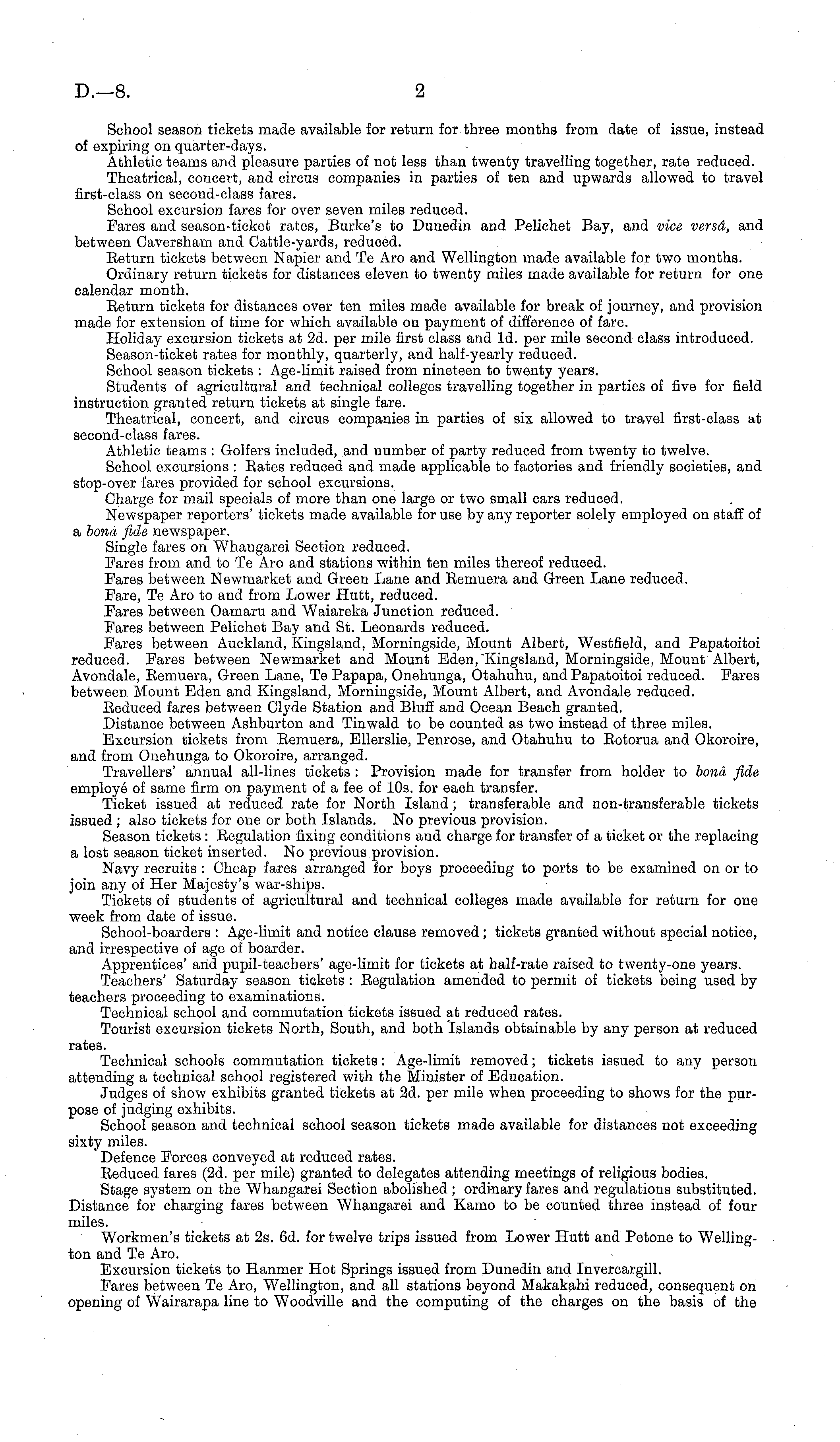 School season tickets made available for return for three months from date of issue, instead of expiring on quarter-days. Athletic teams and pleasure parties of not less than twenty travelling together, rate reduced. Theatrical, concert, and circus companies in parties of ten and upwards allowed to travel first-class on second-class fares. School excursion fares for over seven miles reduced. Fares and season-ticket rates, Burkes to Dunedin and Pelichet Bay, and vice versd, and between Caversham and Cattle-yards, reduced. Return tickets between Napier and Te Aro and Wellington made available for two months. Ordinary return tickets for distances eleven to twenty miles made available for return for one calendar month. Return tickets for distances over ten miles made available for break of journey, and provision made for extension of time for which available on payment of difference of fare. Holiday excursion tickets at 2d. per mile first class and Id. per mile second class introduced. Season-ticket rates for monthly, quarterly, and half-yearly reduced. School season tickets : Age-limit raised from nineteen to twenty years. Students of agricultural and technical colleges travelling together in parties of five for field instruction granted return tickets at single fare. Theatrical, concert, and circus companies in parties of six allowed to travel first-class at second-class fares. Athletic teams : Golfers included, and number of party reduced from twenty to twelve. School excursions : Rates reduced and made applicable to factories and friendly societies, and stop-over fares provided for school excursions. Charge for mail specials of more than one large or two small cars reduced. Newspaper reporters' tickets made available for use by any reporter solely employed on staff of a bond fide newspaper. Single fares on Whangarei Section reduced. Fares from and to Te Aro and stations within ten miles thereof reduced. Fares between Newmarket and Green Lane and Remuera and Green Lane reduced. Fare, Te Aro to and from Lower Hutt, reduced. Fares between Oamaru and Waiareka Junction reduced. Fares between Pelichet Bay and St. Leonards reduced. Fares between Auckland, Kingsland, Morningside, Mount Albert, Westfield, and Papatoitoi reduced. Fares between Newmarket and Mount Eden, Kingsland, Morningside, Mount Albert, Avondale, Remuera, Green Lane, Te Papapa, Onehunga, Otahuhu, and Papatoitoi reduced. Fares between Mount Eden and Kingsland, Morningside, Mount Albert, and Avondale reduced. Reduced fares between Clyde Station and Bluff and Ocean Beach granted. Distance between Ashburton and Tinwald to be counted as two instead of three miles. Excursion tickets from Remuera, Ellerslie, Penrose, and Otahuhu to Rotorua and Okoroire, and from Onehunga to Okoroire, arranged. Travellers' annual all-lines tickets : Provision made for transfer from holder to bond fide employe of same firm on payment of a fee of 10s. for each transfer. Ticket issued at reduced rate for North Island; transferable and non-transferable tickets issued ; also tickets for one or both Islands. No previous provision. Season tickets : Regulation fixing conditions and charge for transfer of a ticket or the replacing a lost season ticket inserted. No previous provision. Navy recruits : Cheap fares arranged for boys proceeding to ports to be examined on or to join any of Her Majesty's war-ships. Tickets of students of agricultural and technical colleges made available for return for one week from date of issue. School-boarders : Age-limit and notice clause removed; tickets granted without special notice, and irrespective of age of boarder. Apprentices' arid pupil-teachers' age-limit for tickets at half-rate raised to twenty-one years. Teachers' Saturday season tickets : Regulation amended to permit of tickets being used by teachers proceeding to examinations. Technical school and commutation tickets issued at reduced rates. Tourist excursion tickets North, South, and both Islands obtainable by any person at reduced rates. Technical schools commutation tickets: Age-limit removed; tickets issued to any person attending a technical school registered with the Minister of Education. Judges of show exhibits granted tickets at 2d. per mile when proceeding to shows for the purpose of judging exhibits. School season and technical school season tickets made available for distances not exceeding sixty miles. Defence Forces conveyed at reduced rates. Reduced fares (2d. per mile) granted to delegates attending meetings of religious bodies. Stage system on the Whangarei Section abolished ; ordinary fares and regulations substituted. Distance for charging fares between Whangarei and Kamo to be counted three instead of four miles. Workmen's tickets at 2s. 6d. for twelve trips issued from Lower Hutt and Petone to Wellington and Te Aro. Excursion tickets to Hanmer Hot Springs issued from Dunedin and Inveroargill. Fares between Te Aro, Wellington, and all stations beyond Makakahi reduced, consequent on opening of Wairarapa line to Woodville and the computing of the charges on the basis of the