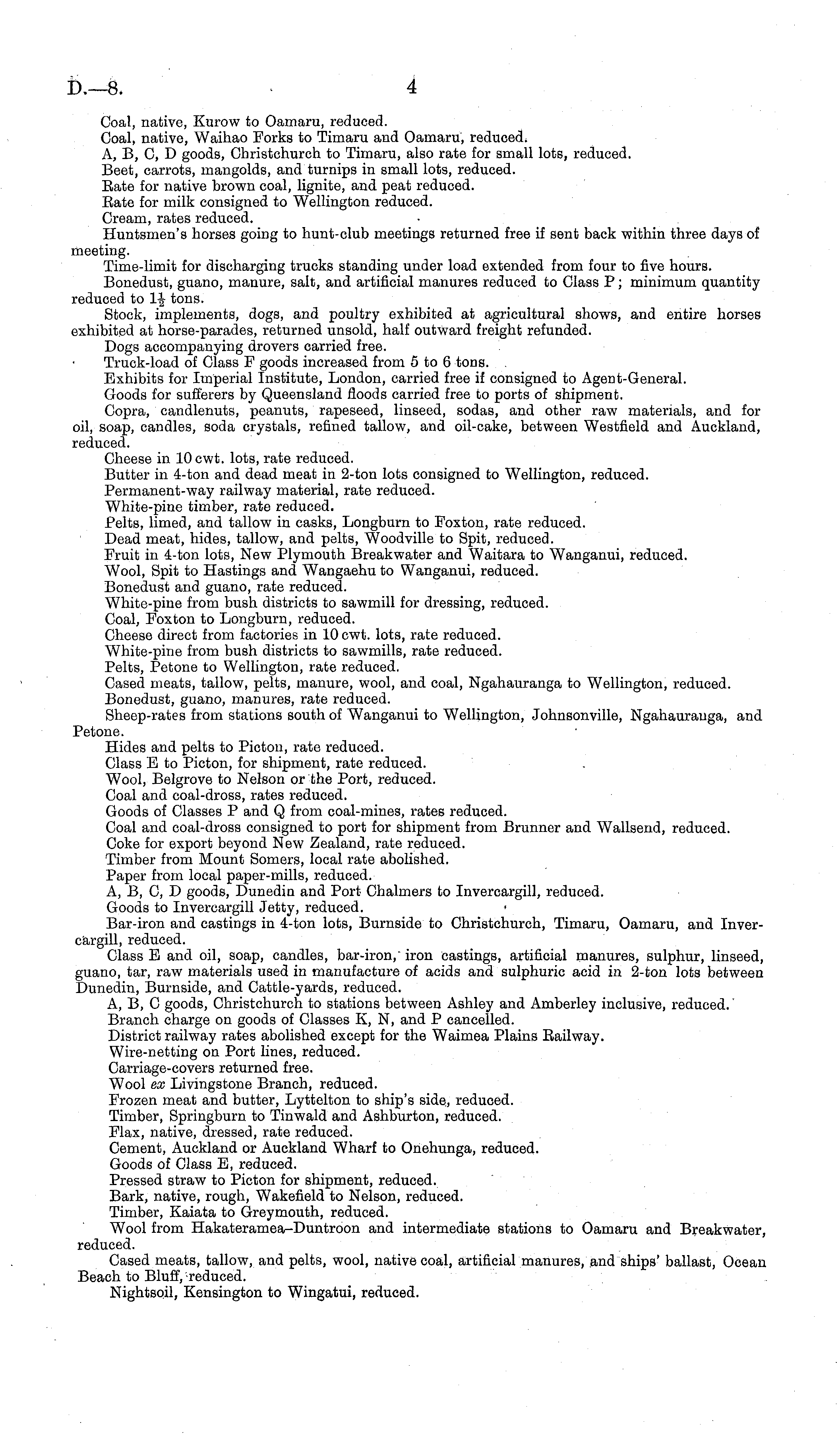 Coal, native, Kurow to Oamaru, reduced. Coal, native, Waihao Forks to Timaru and Oamaru, reduced, A, B, C, D goods, Christchurch to Timaru, also rate for small lots, reduced. Beet, carrots, mangolds, and turnips in small lots, reduced. Rate for native brown coal, lignite, and peat reduced. Rate for milk consigned to Wellington reduced. Cream, rates reduced. Huntsmen's horses going to hunt-club meetings returned free if sent back within three days of meeting. Time-limit for discharging trucks standing under load extended from four to five hours. Bonedust, guano, manure, salt, and artificial manures reduced to Class P; minimum quantity reduced to 1-| tons. Stock, implements, dogs, and poultry exhibited at agricultural shows, and entire horses exhibited at horse-parades, returned unsold, half outward freight refunded. Dogs accompanying drovers carried free. Truck-load of Class F goods increased from 5 to 6 tons. . Exhibits for Imperial Institute, London, carried free if consigned to Agent-General. Goods for sufferers by Queensland floods carried free to ports of shipment. Copra, candlenuts, peanuts, rapeseed, linseed, sodas, and other raw materials, and for oil, soap, candles, soda crystals, refined tallow, and oil-cake, between Westfield and Auckland, reduced. Cheese in lOcwt. lots, rate reduced. Butter in 4-ton and dead meat in 2-ton lots consigned to Wellington, reduced. Permanent-way railway material, rate reduced. White-pine timber, rate reduced. Pelts, limed, and tallow in casks, Longburn to Foxton, rate reduced. Dead meat, hides, tallow, and pelts, Woodville to Spit, reduced. Fruit in 4-ton lots, New Plymouth Breakwater and Waitara to Wanganui, reduced. Wool, Spit to Hastings and Wangaehu to Wanganui, reduced. Bonedust and guano, rate reduced. White-pine from bush districts to sawmill for dressing, reduced. Coal, Foxton to Longburn, reduced. Cheese direct from factories in 10 cwt. lots, rate reduced. White-pine from bush districts to sawmills, rate reduced. Pelts, Petone to Wellington, rate reduced. Cased meats, tallow, pelts, manure, wool, and coal, Ngahauranga to Wellington, reduced. Bonedust, guano, manures, rate reduced. Sheep-rates from stations south of Wanganui to Wellington, Johnsonville, Ngahauranga, and Petone. Hides and pelts to Picton, rate reduced. Class E to Picton, for shipment, rate reduced. Wool, Belgrove to Nelson or the Port, reduced. Coal and coal-dross, rates reduced. Goods of Classes P and Q from coal-mines, rates reduced. Coal and coal-dross consigned to port for shipment from Brunner and Wallsend, reduced. Coke for export beyond New Zealand, rate reduced. Timber from Mount Somers, local rate abolished. Paper from local paper-mills, reduced. A, B, C, D goods, Dunedin and Port Chalmers to Inveroargill, reduced. Goods to Inveroargill Jetty, reduced. Bar-iron and castings in 4-ton lots, Burnside to Christchurch, Timaru, Oamaru, and Inveroargill, reduced. Class E and oil, soap, candles, bar-iron,' iron castings, artificial manures, sulphur, linseed, guano, tar, raw materials used in manufacture of acids and sulphuric acid in 2-ton lots between Dunedin, Burnside, and Cattle-yards, reduced. A, B, C goods, Christchurch to stations between Ashley and Amberley inclusive, reduced. Branch charge on goods of Classes X, N, and P cancelled. District railway rates abolished except for the Waimea Plains Railway. Wire-netting on Port lines, reduced. Carriage-covers returned free. Wool ex Livingstone Branch, reduced. Frozen meat and butter, Lyttelton to ship's side, reduced. Timber, Springburn to Tinwald and Ashburton, reduced. Flax, native, dressed, rate reduced. Cement, Auckland or Auckland Wharf to Onehunga, reduced. Goods of Class E, reduced. Pressed straw to Picton for shipment, reduced. Bark, native, rough, Wakefield to Nelson, reduced. Timber, Kaiata to Greymouth, reduced. Wool from Hakateramea-Duntroon and intermediate stations to Oamaru and Breakwater, reduced. Cased meats, tallow, and pelts, wool, native coal, artificial manures, and ships' ballast, Ocean Beach to Bluff, reduced. Nightsoil, Kensington to Wingatui, reduced.