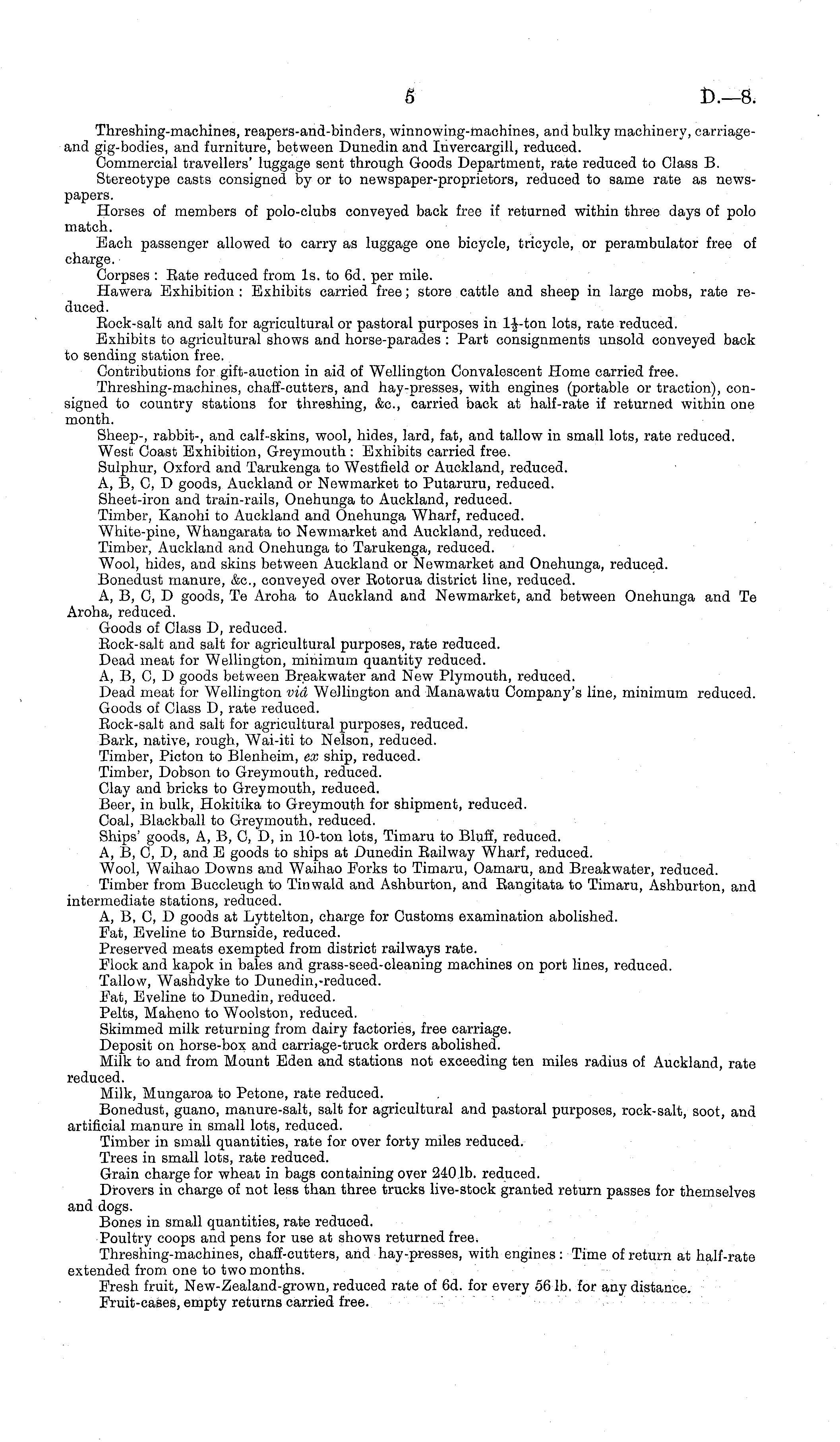 Threshing-machines, reapers-and-binders, winnowing-machines, and bulky machinery, carriageand gig-bodies, and furniture, between Dunedin and Inveroargill, reduced. Commercial travellers' luggage sent through Goods Department, rate reduced to Class B. Stereotype casts consigned by or to newspaper-proprietors, reduced to same rate as newspapers. Horses of members of polo-clubs conveyed back free if returned within three days of polo match. Each passenger allowed to carry as luggage one bicycle, tricycle, or perambulator free of charge. Corpses : Rate reduced from Is. to 6d. per mile. Hawera Exhibition : Exhibits carried free; store cattle and sheep in large mobs, rate reduced. Rock-salt and salt for agricultural or pastoral purposes in lf-ton lots, rate reduced. Exhibits to agricultural shows and horse-parad.es : Part consignments unsold conveyed back to sending station free. Contributions for gift-auction in aid of Wellington Convalescent Home carried free. Threshing-machines, chaff-cutters, and hay-presses, with engines (portable or traction), consigned to country stations for threshing, &c, carried back at half-rate if returned within one month. Sheep-, rabbit-, and calf-skins, wool, hides, lard, fat, and tallow in small lots, rate reduced. West Coast Exhibition, Greymouth : Exhibits carried free. Sulphur, Oxford and Tarukenga to Westfield or Auckland, reduced. A, B, C, D goods, Auckland or Newmarket to Putaruru, reduced. Sheet-iron and train-rails, Onehunga to Auckland, reduced. Timber, Kanohi to Auckland and Onehunga Wharf, reduced. White-pine, Whangarata to Newmarket and Auckland, reduced. Timber, Auckland and Onehunga to Tarukenga, reduced. Wool, hides, and skins between Auckland or Newmarket and Onehunga, reduced. Bonedust manure, &c, conveyed over Rotorua district line, reduced. A, B, C, D goods, Te Aroha to Auckland and Newmarket, and between Onehunga and Te Aroha, reduced. Goods of Class D, reduced. Rock-salt and salt for agricultural purposes, rate reduced. Dead meat for Wellington, minimum quantity reduced. A, B, C, D goods between Breakwater and New Plymouth, reduced. Dead meat for Wellington vid Wellington and Manawatu Company's line, minimum reduced. Goods of Class D, rate reduced. Rock-salt and salt for agricultural purposes, reduced. Bark, native, rough, Wai-iti to Nelson, reduced. Timber, Picton to Blenheim, ex ship, reduced. Timber, Dobson to Greymouth, reduced. Clay and bricks to Greymouth, reduced. Beer, in bulk, Hokitika to Greymouth for shipment, reduced. Coal, Blackball to Greymouth, reduced. Ships' goods, A, B, C, D, in 10-ton lots, Timaru to Bluff, reduced. A, B, 0, D, and E goods to ships at Dunedin Railway Wharf, reduced. Wool, Waihao Downs and Waihao Forks to Timaru, Oamaru, and Breakwater, reduced. Timber from Buccleugh to Tinwald and Ashburton, and Rangitata to Timaru, Ashburton, and intermediate stations, reduced. A, B, C, D goods at Lyttelton, charge for Customs examination abolished. Fat, Eveline to Burnside, reduced. Preserved meats exempted from district railways rate. Flock and kapok in bales and grass-seed-cleaning machines on port lines, reduced. Tallow, Washdyke to Dunedin,-reduced. Fat, Eveline to Dunedin, reduced. Pelts, Maheno to Woolston, reduced. Skimmed milk returning from dairy factories, free carriage. Deposit on horse-box and carriage-truck orders abolished. Milk to and from Mount Eden and stations not exceeding ten miles radius of Auckland, rate reduced. Milk, Mungaroa to Petone, rate reduced. Bonedust, guano, manure-salt, salt for agricultural and pastoral purposes, rock-salt, soot, and artificial manure in small lots, reduced. Timber in small quantities, rate for over forty miles reduced. Trees in small lots, rate reduced. Grain charge for wheat in bags containing over 240 lb. reduced. Drovers in charge of not less than three trucks live-stock granted return passes for themselves and dogs. Bones in small quantities, rate reduced. Poultry coops and pens for use at shows returned free. Threshing-machines, chaff-cutters, and hay-presses, with engines: Time of return at half-rate extended from one to two months. Fresh fruit, New-Zealand-grown, reduced rate of 6d. for every 56 lb. for any distance. Fruit-cases, empty returns carried free.