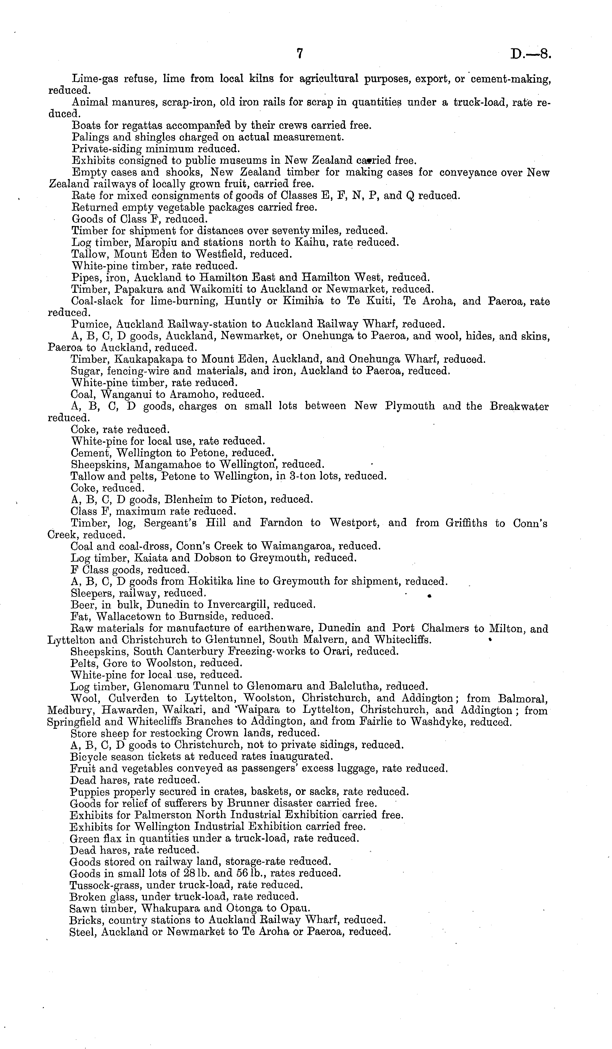 Lime-gas refuse, lime from local kilns for agricultural purposes, export, or cement-making, reduced. Animal manures, scrap-iron, old iron rails for scrap in quantities under a truck-load, rate reduced. Boats for regattas accompanied by their crews carried free. Palings and shingles charged on actual measurement. Private-siding minimum reduced. Exhibits consigned to public museums in New Zealand casried free. Empty cases and shooks, New Zealand timber for making cases for conveyance over New Zealand railways of locally grown fruit, carried free. Rate for mixed consignments of goods of Classes E, F, N, P, and Q reduced. Returned empty vegetable packages carried free. Goods of Class F, reduced. Timber for shipment for distances over seventy miles, reduced. Log timber, Maropiu and stations north to Kaihu, rate reduced. Tallow, Mount Eden to Westfield, reduced. White-pine timber, rate reduced. Pipes, iron, Auckland to Hamilton East and Hamilton West, reduced. Timber, Papakura and Waikomiti to Auckland or Newmarket, reduced. Coal-slack for lime-burning, Huntly or Kimihia to Te Kuiti, Te Aroha, and Paeroa, rate reduced. Pumice, Auckland Railway-station to Auckland Railway Wharf, reduced. A, B, C, D goods, Auckland, Newmarket, or Onehunga to Paeroa, and wool, hides, and skins, Paeroa to Auckland, reduced. Timber, Kaukapakapa to Mount Eden, Auckland, and Onehunga Wharf, reduced. Sugar, fencing-wire and materials, and iron, Auckland to Paeroa, reduced. White-pine timber, rate reduced. Coal, Wanganui to Aramoho, reduced. A, B, C, D goods, charges on small lots between New Plymouth and the Breakwater reduced. Coke, rate reduced. White-pine for local use, rate reduced. Cement, Wellington to Petone, reduced. Sheepskins, Mangamahoe to Wellington, reduced. Tallow and pelts, Petone to Wellington, in 3-ton lots, reduced. Coke, reduced. A, B, C, D goods, Blenheim to Picton, reduced. Class F, maximum rate reduced. Timber, log, Sergeant's Hill and Farndon to Westport, and from Griffiths to Conn's Creek, reduced. Coal and coal-dross, Conn's Creek to Waimangaroa, reduced. Log timber, Kaiata and Dobson to Greymouth, reduced. F Class goods, reduced. A, B, C, D goods from Hokitika line to Greymouth for shipment, reduced. Sleepers, railway, reduced. • . Beer, in bulk, Dunedin to Inveroargill, reduced. Fat, Wallacetown to Burnside, reduced. Raw materials for manufacture of earthenware, Dunedin and Port Chalmers to Milton, and Lyttelton and Christchurch to Glentunnel, South Malvern, and Whitecliffs. » Sheepskins, South Canterbury Freezing-works to Orari, reduced. Pelts, Gore to Woolston, reduced. White-pine for local use, reduced. Log timber, Glenomaru Tunnel to Glenomaru and Balclutha, reduced. Wool, Culverden to Lyttelton, Woolston, Christchurch, and Addington; from Balmoral, Medbury, Hawarden, Waikari, and "Waipara to Lyttelton, Christchurch, and Addington ; from Springfield and Whitecliffs Branches to Addington, and from Fairlie to Washdyke, reduced. Store sheep for restocking Crown lands, reduced. A, B, C, D goods to Christchurch, not to private sidings, reduced. Bicycle season tickets at reduced rates inaugurated. Fruit and vegetables conveyed as passengers' excess luggage, rate reduced. Dead hares, rate reduced. Puppies properly secured in crates, baskets, or sacks, rate reduced. Goods for relief of sufferers by Brunner disaster carried free. Exhibits for Palmerston North Industrial Exhibition carried free. Exhibits for Wellington Industrial Exhibition carried free. Green flax in quantities under a truck-load, rate reduced. Dead hares, rate reduced. Goods stored on railway land, storage-rate reduced. Goods in small lots of 281b. and 561b., rates reduced. Tussock-grass, under truck-load, rate reduced. Broken glass, under truck-load, rate reduced. Sawn timber, Whakupara and Otonga to Opau. Bricks, country stations to Auckland Railway Wharf, reduced. Steel, Auckland or Newmarket to Te Aroha or Paeroa, reduced.