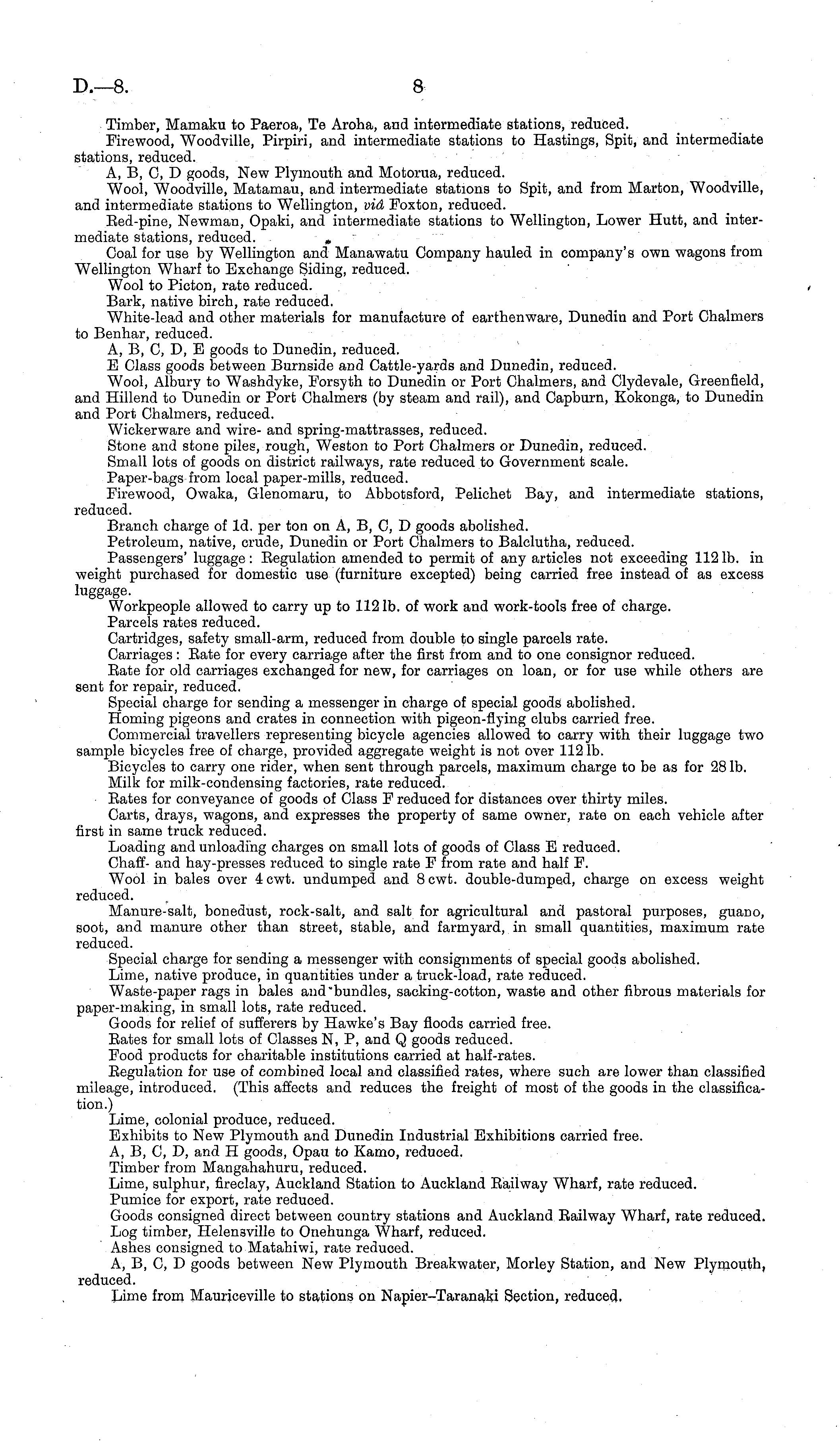 Timber, Mamaku to Paeroa, Te Aroha, and intermediate stations, reduced. Firewood, Woodville, Pirpiri, and intermediate stations to Hastings, Spit, and intermediate stations, reduced. A, B, C, D goods, New Plymouth and Motorua, reduced. Wool, Woodville, Matamau, and intermediate stations to Spit, and from Marton, Woodville, and intermediate stations to Wellington, vid Foxton, reduced. Red-pine, Newman, Opaki, and intermediate stations to Wellington, Lower Hutt, and intermediate stations, reduced. „ Coal for use by Wellington and Manawatu Company hauled in company's own wagons from Wellington Wharf to Exchange Siding, reduced. Wool to Picton, rate reduced. / Bark, native birch, rate reduced. White-lead and other materials for manufacture of earthenware, Dunedin and Port Chalmers to Benhar, reduced. A, B, C, D, E goods to Dunedin, reduced. E Class goods between Burnside and Cattle-yards and Dunedin, reduced. Wool, Albury to Washdyke, Forsyth to Dunedin or Port Chalmers, and Clydevale, Greenfield, and Hillend to Dunedin or Port Chalmers (by steam and rail), and Capburn, Kokonga, to Dunedin and Port Chalmers, reduced. Wickerware and wire- and spring-mattrasses, reduced. Stone and stone piles, rough, Weston to Port Chalmers or Dunedin, reduced. Small lots of goods on district railways, rate reduced to Government scale. Paper-bags from local paper-mills, reduced. Firewood, Owaka, Glenomaru, to Abbotsford, Pelichet Bay, and intermediate stations, reduced. Branch charge of Id. per ton on A, B, C, D goods abolished. Petroleum, native, crude, Dunedin or Port Chalmers to Balclutha, reduced. Passengers' luggage: Regulation amended to permit of any articles not exceeding 112 lb. in weight purchased for domestic use (furniture excepted) being carried free instead of as excess luggage. Workpeople allowed to carry up to 112 lb. of work and work-tools free of charge. Parcels rates reduced. Cartridges, safety small-arm, reduced from double to single parcels rate. Carriages: Rate for every carriage after the first from and to one consignor reduced. Rate for old carriages exchanged for new, for carriages on loan, or for use while others are sent for repair, reduced. Special charge for sending a messenger in charge of special goods abolished. Homing pigeons and crates in connection with pigeon-flying clubs carried free. Commercial travellers representing bicycle agencies allowed to carry with their luggage two sample bicycles free of charge, provided aggregate weight is not over 112 lb. Bicycles to carry one rider, when sent through parcels, maximum charge to be as for 28 lb. Milk for milk-condensing factories, rate reduced. Rates for conveyance of goods of Class F reduced for distances over thirty miles. Carts, drays, wagons, and expresses the property of same owner, rate on each vehicle after first in same truck reduced. Loading and unloading charges on small lots of goods of Class E reduced. Chaff- and hay-presses reduced to single rate F from rate and half F. Wool in bales over 4cwt. undumped and Bcwt. double-dumped, charge on excess weight reduced. Manure-salt, bonedust, rock-salt, and salt for agricultural and pastoral purposes, guano, soot, and manure other than street, stable, and farmyard, in small quantities, maximum rate reduced. Special charge for sending a messenger with consignments of special goods abolished. Lime, native produce, in quantities under a truck-load, rate reduced. Waste-paper rags in bales and "bundles, sacking-cotton, waste and other fibrous materials for paper-making, in small lots, rate reduced. Goods for relief of sufferers by Hawke's Bay floods carried free. Rates for small lots of Classes N, P, and Q goods reduced. Food products for charitable institutions carried at half-rates. Regulation for use of combined local and classified rates, where such are lower than classified mileage, introduced. (This affects and reduces the freight of most of the goods in the classification.) Lime, colonial produce, reduced. Exhibits to New Plymouth and Dunedin Industrial Exhibitions carried free. A, B, C, D, and H goods, Opau to Kamo, reduced. Timber from Mangahahuru, reduced. Lime, sulphur, fireclay, Auckland Station to Auckland Railway Wharf, rate reduced. Pumice for export, rate reduced. Goods consigned direct between country stations and Auckland Railway Wharf, rate reduced. Log timber, Helen3ville to Onehunga Wharf, reduced. Ashes consigned to Matahiwi, rate reduced. A, B, C, D goods between New Plymouth Breakwater, Morley Station, and New Plymouth, reduced. Lime from Mauriceville to stations on Napier-Taranaki Section, reduced.