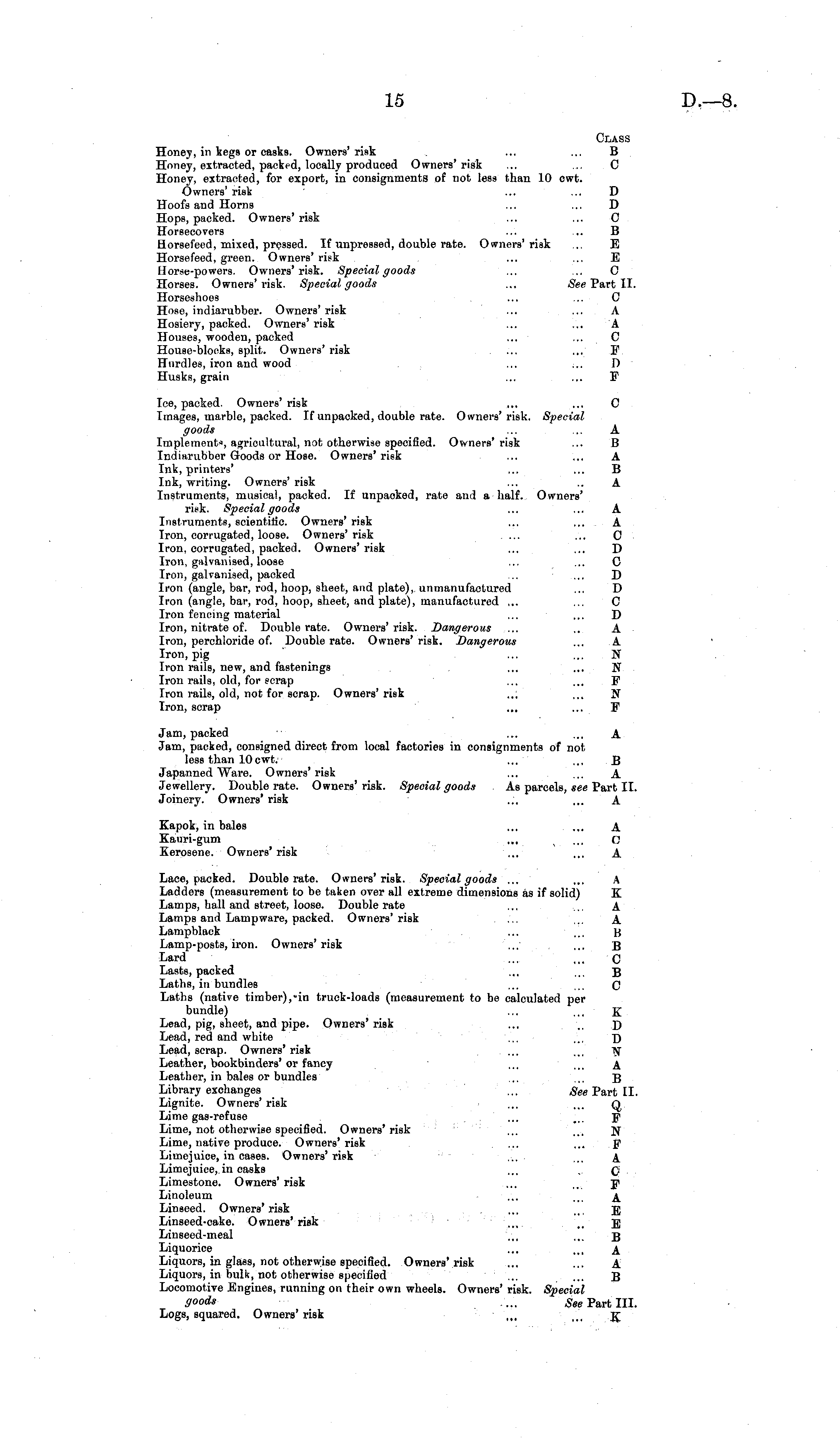 Class Honey, in kegs or casks. Owners' risk ... ... B Honey, extracted, packed, locally produced Owners' risk ... ... C Honey, extracted, for export, in consignments of not lesa than 10 cwt. Owners' risk ... ... D Hoofs and Horns ... ... D Hops, packed. Owners' risk ... ... C Horsecovers ... ... B Horsefeed, mixed, pressed. If unpressed, double rate. Owners'risk ... E Horsefeed, green. Owners' risk ... ... E Horse-powers. Owners'risk. Special goods ... ... C Horses. Owners'risk. Special goods ... See Part 11. Horseshoes ... ... C Hose, indiarubber. Owners' risk ... ... A Hosiery, packed. Owners'risk ... ... A Houses, wooden, packed ... ... C House-blocks, split. Owners' risk ... ... F Hurdles, iron and wood ... ... D Husks, grain ... ... F Ice, packed. Owners' risk ... ... C Images, marble, packed. If unpacked, double rate. Owners'risk. Special goods ... ... A Implement", agricultural, not otherwise specified. Owners' risk ... B Indiarubber Goods or Hose. Owners'risk ... ... A Ink, printers' ... ... B Ink, writing. Owners' risk ... .. A Instruments, musical, packed. If unpacked, rate and a half. Owners' risk. Special goods ... ... A Instruments, scientific. Owners' risk ... ... A Iron, corrugated, loose. Owners' risk ... ... C Iron, corrugated, packed. Owners' risk ... ... D Iron, galvanised, loose ... ... C Iron, galvanised, packed ... ... D Iron (angle, bar, rod, hoop, sheet, and plate),, unmanufactured ... D Iron (angle, bar, rod, hoop, sheet, and plate), manufactured ... ... C Iron fencing material ... ... D Iron, nitrate of. Double rate. Owners'risk. Dangerous ... ... A Iron, perchloride of. Double rate. Owners' risk. Dangerous ... A Iron, pig ... ... N Iron rails, new, and fastenings ... ... N Iron rails, old, for scrap ... ... F Iron rails, old, not for scrap. Owners' risk ... ... N Iron, scrap ... ... F Jam, packed ... ... A Jam, packed, consigned direct from local factories in consignments of not less than 10cwt. ... ~, B Japanned Ware. Owners'risk ... ... A Jewellery. Double rate. Owners'risk. Special goods As parcels, see Part 11. Joinery. Owners' risk ... ... A Kapok, in bales ... ... A Kauri-gum ... ... o Kerosene. Owners'risk ... ... A Lace, packed. Double rate. Owners'risk. Special goods ... ... A Ladders (measurement to be taken over all extreme dimensions as if solid) X Lamps, hall and street, loose. Double rate ... ... A Lamps and Lampware, packed. Owners'risk ... ... A Lampblack ... ... n Lamp-posts, iron. Owners'risk ... ... B Lard ... ... o Lasts, packed ... ... B Laths, in bundles ... ... C Laths (native timber),-in truck-loads (measurement to be calculated per bundle) ... ... X Lead, pig, sheet, and pipe. Owners' risk ... ~ D Lead, red and white ... ~, f) Lead, scrap. Owners' risk ... ... tnj Leather, bookbinders'or fancy ... ... A Leather, in bales or bundles ... .. B Library exchanges ... See Part II Lignite. Owners' risk i ... ... Q Lime gas-refuse ... F Lime, not otherwise specified. Owners'risk ... ... N Lime, native produce. Owners'risk ... ... p Limejuice, in cases. Owners' risk ... A Limejuice,. in casks ... .. Q Limestone. Owners' risk ... .. j 1 Linoleum ... A Linseed. Owners'risk ... ... j; Linseed-cake. Owners'risk ... .. E Linseed-meal ... ... b Liquorice ... ... a Liquors, in glass, not otherwise specified. Owners'risk ... ... A Liquors, in bulk, not otherwise specified ... ... B Locomotive Engines, running on their own wheels. Owners' risk. Special goods ... See Part 111. Logs, squared. Owners' risk ~, ... ]£