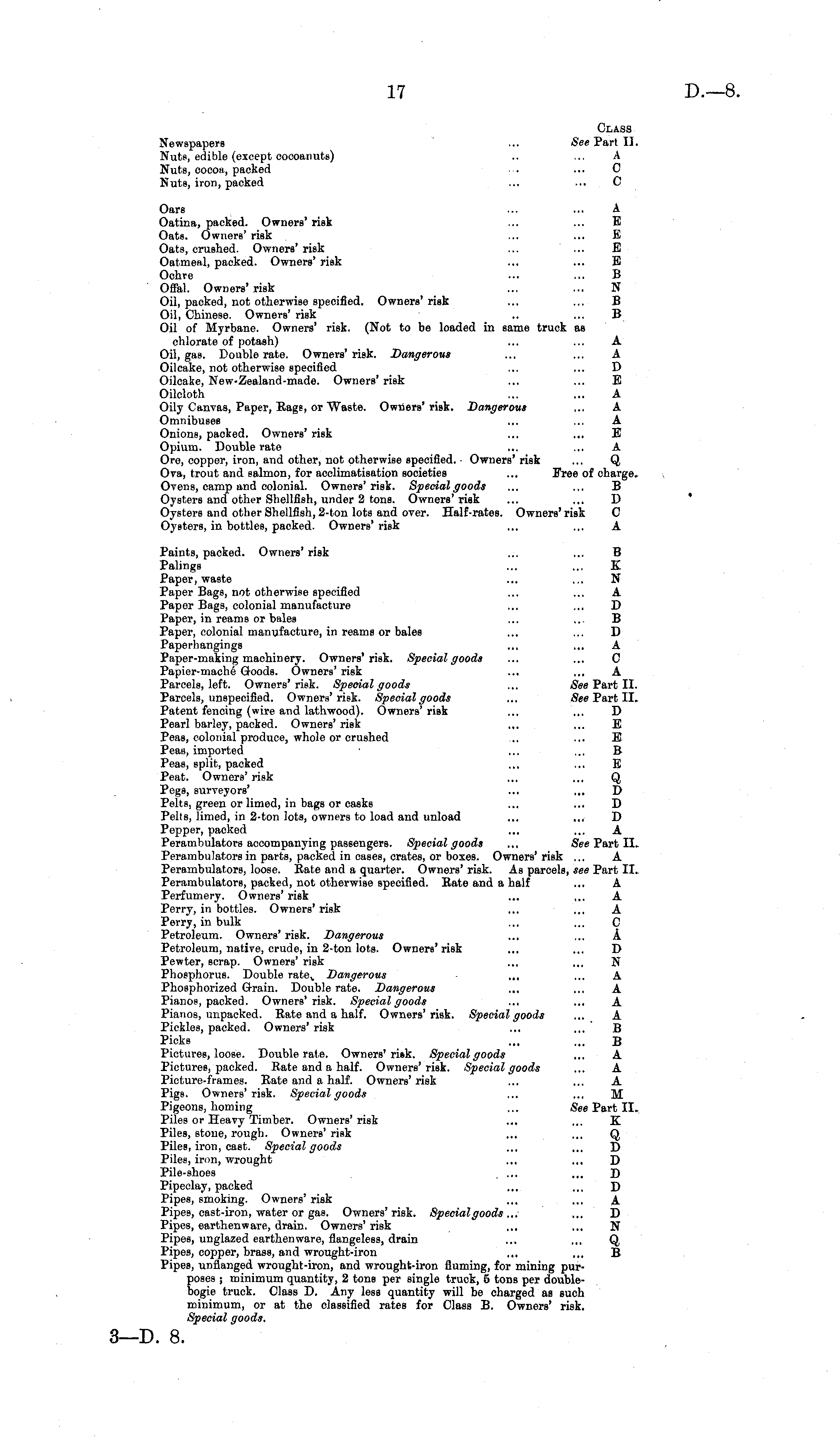Class Newspapers ... See Part 11, Nuts, edible (except cocoanuts) .. ... A Nuts, cocoa, paoked ... ... C Nuts, iron, packed ... ... C Oars ... ... A Oatina, packed. Owners' risk ... ... E Oats. Owners' risk ... ... E Oats, crushed. Owners' risk ... ... E Oatmeal, packed. Owners' risk ... ... E Ochre ... ... B Offal. Owners' risk ... ... N Oil, packed, not otherwise specified. Owners'risk ... ... B Oil, Chinese. Owners' risk .. ... B Oil of Myrbane. Owners' risk. (Not to be loaded in same truck as chlorate of potash) ... ... A Oil, gas. Doublerate. Owners'risk. Dangerous ... ... A Oilcake, not otherwise specified ... ... D Oilcake, New-Zealand-made. Owners' risk ... ... E Oilcloth ... ... A Oily Canvas, Paper, Rags, or Waste. Owners'risk. Dangerous ... A Omnibuses ... ... A Onions, packed. Owners' risk ... ... E Opium. Double rate ... ... A Ore, copper, iron, and other, not otherwise specified. Owners' risk ... Q, Ova, trout and Balmon, for acclimatisation societies ... Free of charge. Ovens, camp and colonial. Owners'risk. Special goods ... ... B Oysters and other Shellfish, under 2 tons. Owners' risk ... ... D Oysters and other Shellfish, 2-ton lots and over. Half-rates. Owners' risk C Oysters, in bottles, packed. Owners' risk ... ... A Paints, packed. Owners' risk ... ... B Palings ... ... X Paper, waste ... ~, N Paper Bags, not otherwise specified ... ... A Paper Bags, colonial manufacture ... ... D Paper, in reams or bales ... ... B Paper, colonial manufacture, in reams or bales ... ... D Paperhangings ... ... A Paper-making machinery. Owners'risk. Special goods ... ... C Papier-mache Goods. Owners' risk ... ... A Parcels, left. Owners'risk. Special goods ... See Part 11. Parcels, unspecified. Owners'risk. Special goods ... See Part 11. Patent fencing (wire and lathwood). Owners'risk ... ... D Pearl barley, packed. Owners' risk ... ... E Peas, colonial produce, whole or crushed .. ... E Peas, imported • ... ... B Peas, split, packed ... ... E Peat. Owners' risk ... ... Q Pegs, surveyors' ... ... D Pelts, green or limed, in bags or casks ... ... D Pelts, limed, in 2-ton lots, owners to load and unload ... ... D Pepper, packed ... ... A Perambulators accompanying passengers. Special goods ... See Part 11. Perambulators in parts, packed in cases, crates, or boxes. Owners' risk ... A Perambulators, loose. Rate and a quarter. Owners' risk. As parcels, see Part 11, Perambulators, packed, not otherwise specified. Rate and a half ... A Perfumery. Owners' risk ... ... A Perry, in bottles. Owners' risk ... ... A Perry, in bulk ... ... C Petroleum. Owners' risk. Dangerous ... ... A Petroleum, native, crude, in 2-ton lots. Owners'risk ... ... D Pewter, scrap. Owners' risk ... ... N Phosphorus. Double Dangerous ... ... A Phosphorized Grain. Double rate. Dangerous ... ... A Pianos, packed. Owners'risk. Special goods ... ... A Pianos, unpacked. Rate and a half. Owners'risk. Special goods ... A Pickles, packed. Owners' risk ... ... " B Picks ... ... B Pictures, loose. Doublerate. Owners'risk. Special goods ... A Pictures, packed. Rate and a half. Owners'risk. Special goods ... A Picture-frames. Rate and a half. Owners' risk ... ... A Pigs. Owners'risk. Special goods ... ... M Pigeons, homing ... See Part 11. Piles or Heavy Timber. Owners'risk ... ... X Piles, stone, rough. Owners' risk ... ... Q Piles, iron, cast. Special goods ... ... D Piles, iron, wrought ... ... D Pile-shoes ... ... D Pipeclay, packed ... ... D Pipes, smoking. Owners' risk ... ... A Pipes, cast-iron, water or gas. Owners'risk. Special goods... ... D Pipes, earthenware, drain. Owners' risk ... ... N Pipes, unglazed earthenware, flangeless, drain ... ... Q Pipes, copper, brass, and wrought-iron ... ... B Pipes, unflanged wrought-iron, and wrought-iron fluming, for mining purposes ; minimum quantity, 2 tons per single truck, 5 tons per doublebogie truck. Claßs D. Any less quantity will be oharged as such minimum, or at the classified rates for Class B. Owners' risk. Special goods. 3-D. 8.