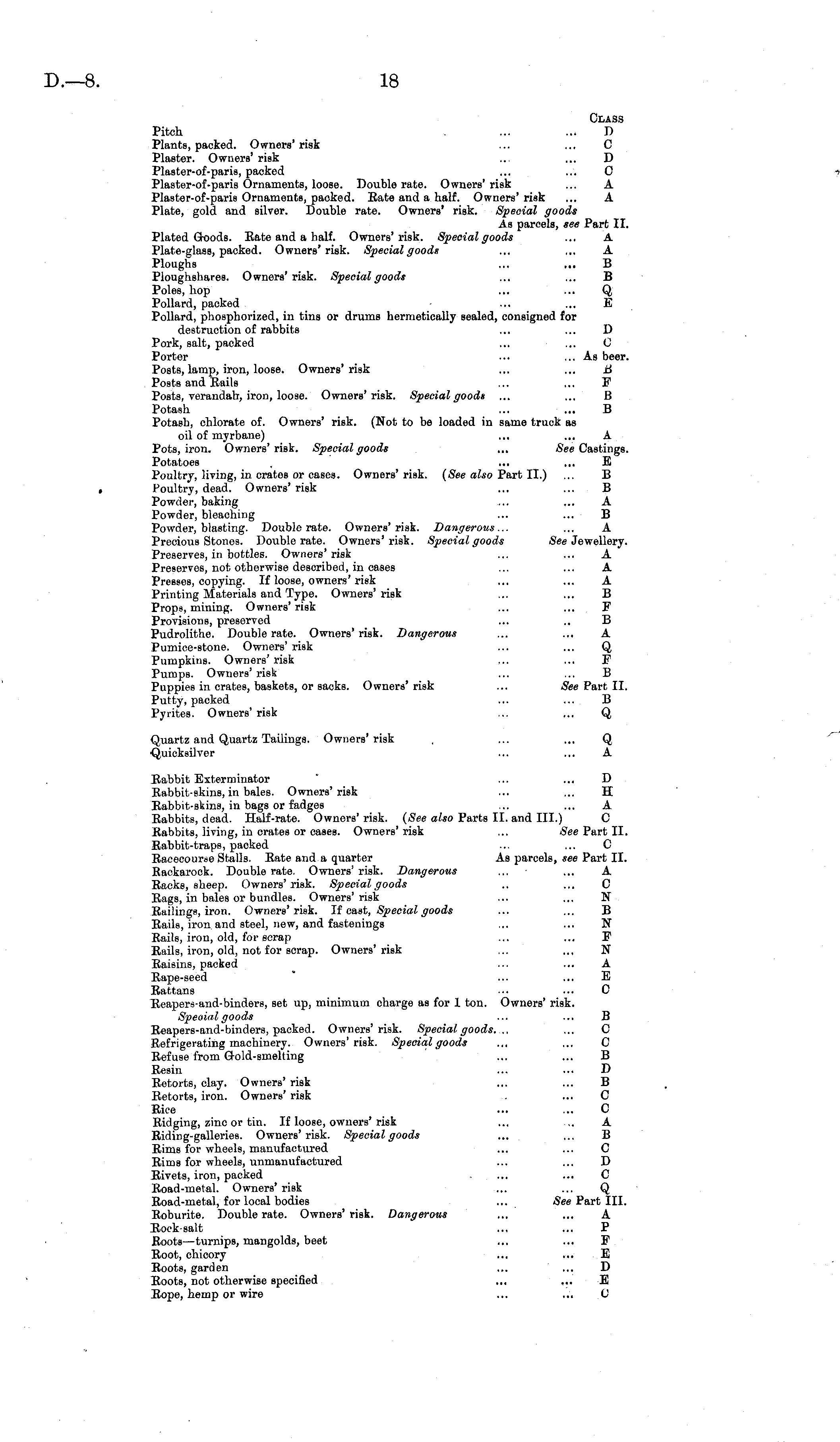 Class Pitch ... ... D Plants, packed. Owners' risk ... ... C Plaster. Owners' risk ... ... D Plaster-of-paris, packed ... ... C Plaster-of-paris Ornaments, loose. Doublerate. Owners'risk ... A Plaster-of-paris Ornaments, packed. Rate and a half. Owners' risk ... A Plate, gold and silver. Double rate. Owners' risk. Special goods As parcels, see Part 11. Plated Goods. Rate and a half. Owners'risk. Special goods ... A Plate-glass, packed. Owners'risk. Special goods ... ... A Ploughs ... ... B Ploughshares. Owners' risk. Special goods ... ... B Poles, hop ... ... Q Pollard, packed ... ... E Pollard, phosphorized, in tins or drums hermetically sealed, consigned for destruction of rabbits ... ... D Pork, salt, packed ... ... 0 Porter ... ... As beer, Posts, lamp, iron, loose. Owners'risk ... ... B Posts and Rails ... ... F Posts, verandah, iron, loose. Owners'risk. Special goods ... ... B Potash ... ... B Potash, chlorate of. Owners' risk. (Not to be loaded in same truck as oil of myrbane) ... ... A Pots, iron. Owners'risk. Special goods ... See Castings. Potatoes . ... ... E Poultry, living, in crates or cases. Owners'risk. (See also Part II.) ... B Poultry, dead. Owners' risk ... ... B Powder, baking ... ... A Powder, bleaching ... ... B Powder, blasting. Doublerate. Owners'risk. Dangerous... ... A Precious Stones. Doublerate. Owners'risk. Special goods See Jewellery. Preserves, in bottles. Owners' risk ... ... A Preserves, not otherwise described, in cases ... ... A Presses, copying. If loose, owners'risk ... ... A Printing Materials and Type. Owners' risk ... ... B Props, mining. Owners' risk ... ... F Provisions, preserved ... .. B Pudrolithe. Doublerate. Owners'risk. Dangerous ... ... A Pumice-Btone. Owners' risk ... ... Q Pumpkins. Owners' risk ... ... F Pumps. Owners' risk ... ... B Puppies in crates, baskets, or sacks. Owners'risk ... See Part 11. Putty, packed ... ... B Pyrites. Owners' risk ... ... Q Quartz and Quartz Tailings. Owners'risk . ... ... Q Quicksilver ... ... A Rabbit Exterminator ... ... D Rabbit-skins, in bales. Owners'risk ... ... H Rabbit-skins, in bags or fadges ... ... A Rabbits, dead. Half-rate. Owners' risk. (See also Parts 11. and III.) C Rabbits, living, in crates or cases. Owners' risk ... See Part 11. Rabbit-traps, packed ... ... C Racecourse Stalls. Rate and a quarter As parcels, see Part 11. Backarock. Double rate. Owners' risk. Dangerous ... ... A Racks, sheep. Owners'risk. Special goods .. ... C Rags, in bales or bundles. Owners'risk ... ... N Railingß, iron. Owners'risk. If cast, Special goods ... ... B Rails, iron and steel, new, and fastenings ... ... N Rails, iron, old, for scrap ... ... F Rails, iron, old, not for scrap. Owners'risk ... ... N Raisins, packed ... ... A Rape-seed ... ... E Rattans ... ... C Reapers-and-binders, set up, minimum charge as for 1 ton. Owners' risk. Special goods ... ... B Reapers-and-binders, packed. Owners'risk. Special g00d5.... ... C Refrigerating machinery. Owners'risk. Special goods ... ... C Refuse from Gold-smelting ... ... B Resin ... ... D Retorts, clay. Owners' risk ... ... B Retortß, iron. Owners' risk .. ... C Rice ... ... C Ridging, zinc or tin. If loose, owners'risk ... ~ A Riding-galleries. Owners'risk. Special goods ... ... B Rims for wheels, manufactured ... ... C Rims for wheels, unmanufactured ... ... D Rivets, iron, packed . ... ... C Road-metal. Owners'risk ... ... Q Road-metal, for local bodies ... See Part 111. Roburite. Doublerate. Owners'risk. Dangerous ... ... A Rock-salt ... ... P Roots —turnips, mangolds, beet ... ... F Root, chicory ... ... E Roots, garden ... ... D Roots, not otherwise specified ... ... E Rope, hemp or wire ... ... C