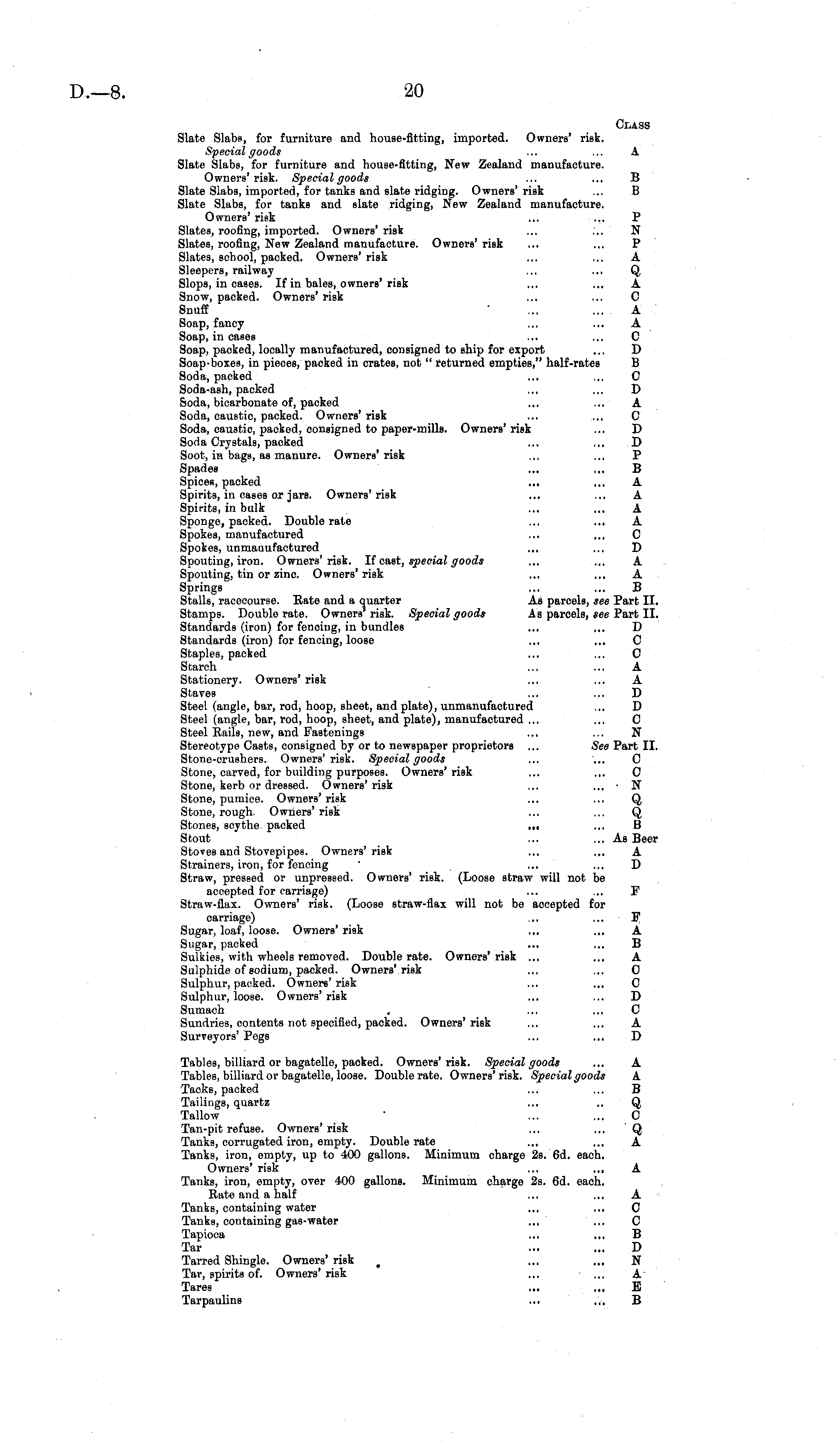 Class Slate Slabs, for furniture and house-fitting, imported. Owners' risk. Special goods ... ... A Slate Slabs, for furniture and house-fitting, New Zealand manufacture. Owners'risk. Special goods ... ... B Slate Slabs, imported, for tanks and slate ridging. Owners' risk ... B Slate Slabs, for tanks and slate ridging, New Zealand manufacture. Owners' risk ... ... P Slates, roofing, imported. Owners' risk ... ... N Slates, roofing, New Zealand manufacture. Owners' risk ... ... P Slates, school, packed. Owners' risk ... ... A Sleepers, railway ... ... Q Slops, in cases. If in bales, owners'risk ... ... A Snow, packed. Owners' risk ... ... C Snuff ' ... ... A Soap, fancy ... ... A Soap, in cases ... ... C Soap, packed, locally manufactured, consigned to ship for export ... D Soap-boxes, in pieces, packed in crates, not " returned empties," half-rates B Soda, packed ... ... C Soda-ash, packed ... ... D Soda, bicarbonate of, packed ... ... A Soda, caustic, packed. Owners' risk ... ... C Soda, caustic, packed, consigned to paper-mills. Owners' risk ... D Soda Crystals, packed ... ... D Soot, in bags, as manure. Owners'risk ... ... P Spades ... ... B Spices, packed ... ... A Spirits, in cases or jars. Owners'risk ... ... A Spirits, in bulk ... ... A Sponge, packed. Double rate ... .., A Spokes, manufactured ... ... C Spokes, unmanufactured ... ... D Spouting, iron. Owners'risk. If cast, special goods ... ... A Spouting, tin or zinc. Owners'risk ... ... A Springs ... ... B Stalls, racecourse. Rate and a quarter As parcels, see Part 11. Stamps. Double rate. Owners risk. Special goods As parcels, see Part 11. Standards (iron) for fencing, in bundles ... ... D Standards (iron) for fencing, loose ... ... 0 Staples, packed ... ... C Starch ... ... A Stationery. Owners' risk ... ... A Staves ... ... D Steel (angle, bar, rod, hoop, sheet, and plate), unmanufactured ... D Steel (angle, bar, rod, hoop, sheet, and plate), manufactured ... ... C Steel Rails, new, and Fastenings ... ... N Stereotype Casts, consigned by or to newspaper proprietors ... See Part 11. Stone-crushers. Owners'risk. Special goods ... ... C Stone, carved, for building purposes. Owners' risk ... ... C Stone, kerb or dressed. Owners' risk ... ... ■ N Stone, pumice. Owners' risk ... ... Q Stone, rough. Owners' risk ... ... Q Stones, scythe, packed ... ... B Stout ... ... As Beer Stoves and Stovepipes. Owners'risk ... ... A Strainers, iron, for fencing ■ ... ... D Straw, pressed or unpresßed. Owners' risk. (Loose straw will not be accepted for carriage) ... ... F Straw-flax. Owners' risk. (Loose straw-flax will not be accepted for carriage) ... ... F Sugar, loaf, loose. Owners' risk ... ... A Sugar, packed ... ... B Sulkies, with wheels removed. Double rate. Owners' risk ... ... A Sulphide of sodium, packed. Owners'risk ... ... C Sulphur, packed. Owners'risk ... ... C Sulphur, loose. Owners'risk ... ... D Sumach . ... ... C Sundries, contents not specified, packed. Owners' risk ... ... A Surveyors' Pegs ... ... D Tables, billiard or bagatelle, packed. Owners'risk. Special goods ... A Tables, billiard or bagatelle, loose. Doublerate. Owners'risk. Special goods A Tacks, packed ... ... B Tailings, quartz ... .. Q Tallow ' ... ... C Tan-pit refuse. Owners'risk ... ... Q Tanks, corrugated iron, empty. Doublerate ... ... A Tanks, iron, empty, up to 400 gallons. Minimum charge 2s. 6d. each. Owners' risk ... ... A Tanks, iron, empty, over 400 gallons. Minimum charge 2s. 6d. each. Rate and a half ... ... A Tanks, containing water ... ... 0 Tankß, containing gas-water ... ... C Tapioca ... ... B Tar ... ... D Tarred Shingle. Owners' risk ... ~, N Tar, spirits of. Owners' risk ... ... A Tares ... ... E Tarpaulins ... ~, B