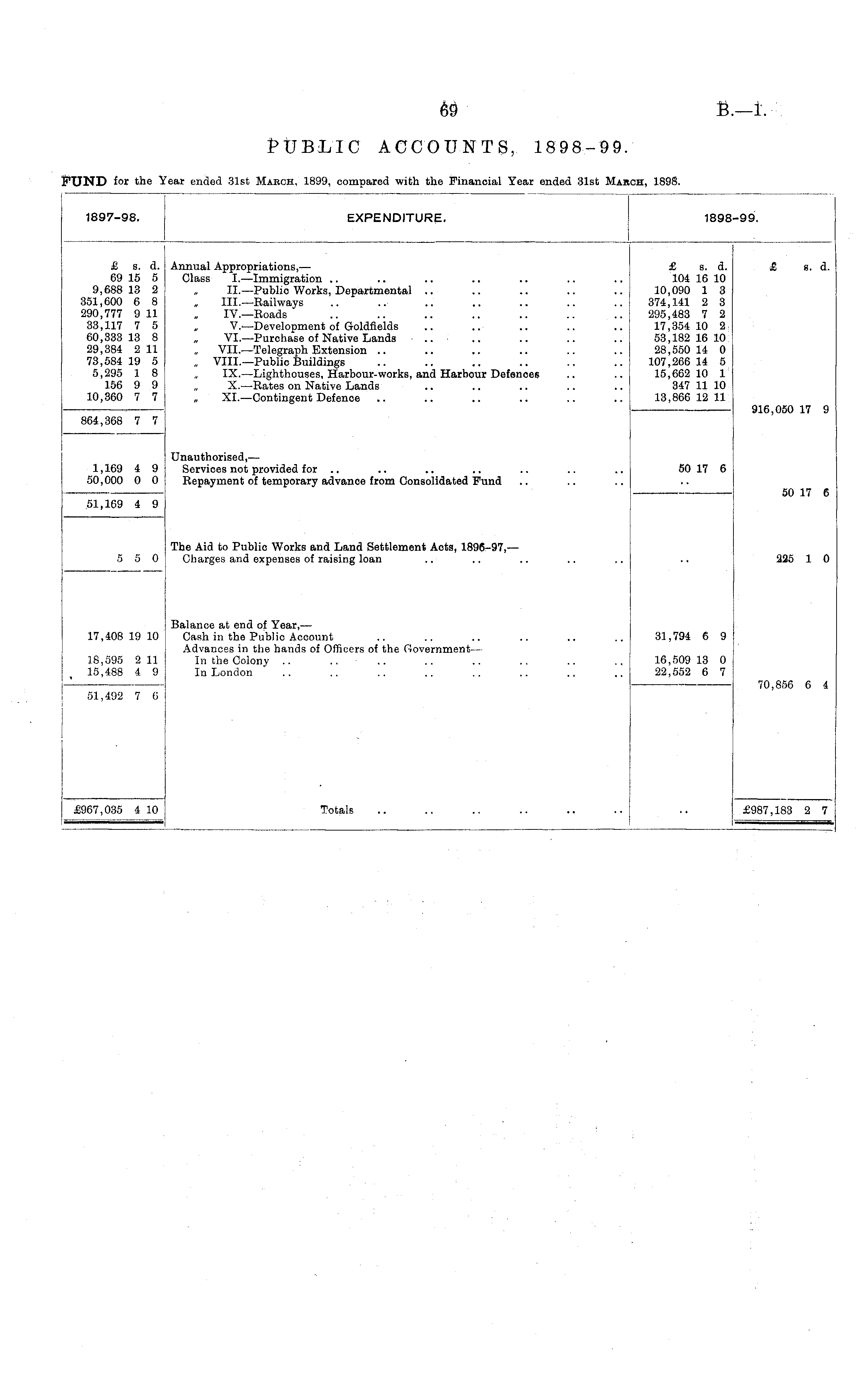 1897-98. EXPENDITURE. 1898-99. £ s. d. 69 15 5 9,688 13 2 351,600 6 8 290,777 9 11 33,117 7 5 60,333 13 8 29,384 2 11 73,584 19 5 5,295 1 8 156 9 9 10,360 7 7 Annual Appropriations,— Class I. —Immigration II.—Public Works, Departmental III.—Railways IV.—Roads V.—Development of Goldfields „ VI.—Purchase of Native Lands VII.—Telegraph Extension .. „ VIII.—Public Buildings IX.—Lighthouses, Harbour-works, and Harbour Defences X.—Rates on Native Lands XI.—Contingent Defence £ s. a. 104 16 10 10,090 1 3 374,141 2 3 295,483 7 2 17,354 10 2 53,182 16 10 28,550 14 0 107,266 14 5 15,662 10 1 347 11 10 13,866 12 11 £ s. a. 864,368 7 7 Unauthorised, — Services not provided for .. Repayment of temporary advance from Consolidatea Funa 916,050 17 1,169 4 9 50,000 0 0 50 17 6 50 17 51,169 4 9 The Aia to Public Works and Land Settlement Acts, 1896-97,— Charges and expenses of raising loan 225 1 5 5 0 17,408 19 10 18,595 2 11 15,488 4 9 Balance at end of Year, — Cash in the Public Account Advances in the hands of Officers of the Government— In the Colony In London 31,794 6 9 16,509 13 0 22,552 6 7 70,856 6 4 51,492 7 6 Totals i967,035 4 10 £987,183 2 7