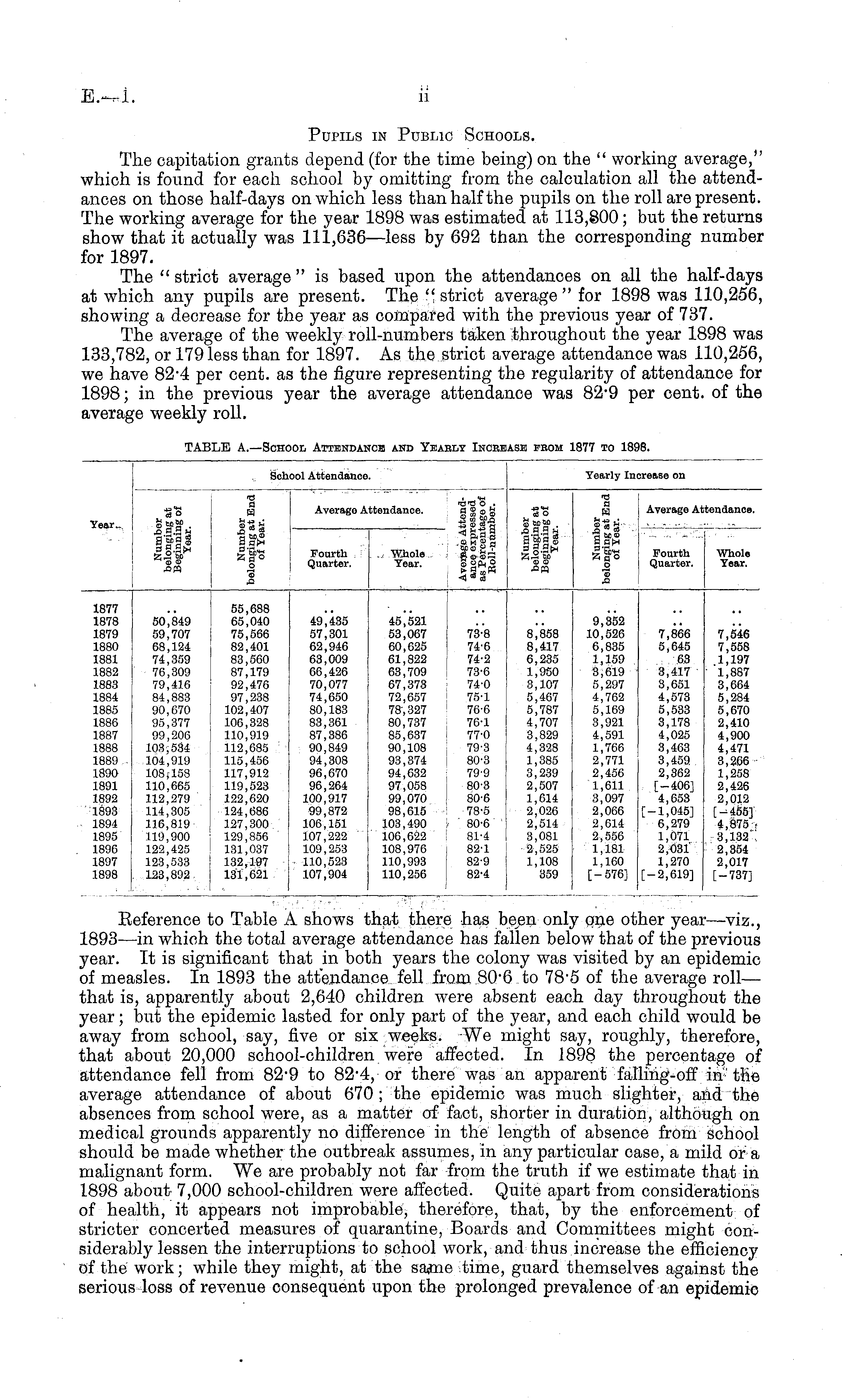 Eeference to Table A shows that there has been only one other year—viz., 1893 —in which the total average attendance has fallen below that of the previous year. It is significant that in both years the colony was visited by an epidemic of measles. In 1893 the attendance fell from 80 - 6 to 78 - 5 of the average roll— that is, apparently about 2,640 children were absent each day throughout the year; but the epidemic lasted for only part of the year, and each child would be away from school, say, five or six weeks. We might say, roughly, therefore, that about 20,000 school-children were affected. In 1898 the percentage of attendance fell from 82-9 to 82-4, or there was an apparentfalling-off in the average attendance of about 670; the epidemic was much slighter, and the absences from school were, as a matter of fact, shorter in duration, although on medical grounds apparently no difference in the length of absence from school should be made whether the outbreak assumes, in any particular case, a mild or a malignant form. We are probably not far from the truth if we estimate that in 1898 about 7,000 school-children were affected. Quite apart from considerations of health, it appears not improbable, therefore, that, by the enforcement of stricter concerted measures of quarantine, Boards and Committees might considerably lessen the interruptions to school work, and thus increase the efficiency of the work; while they might, at the same time, guard themselves against the serious loss of revenue consequent upon the prolonged prevalence of an epidemic