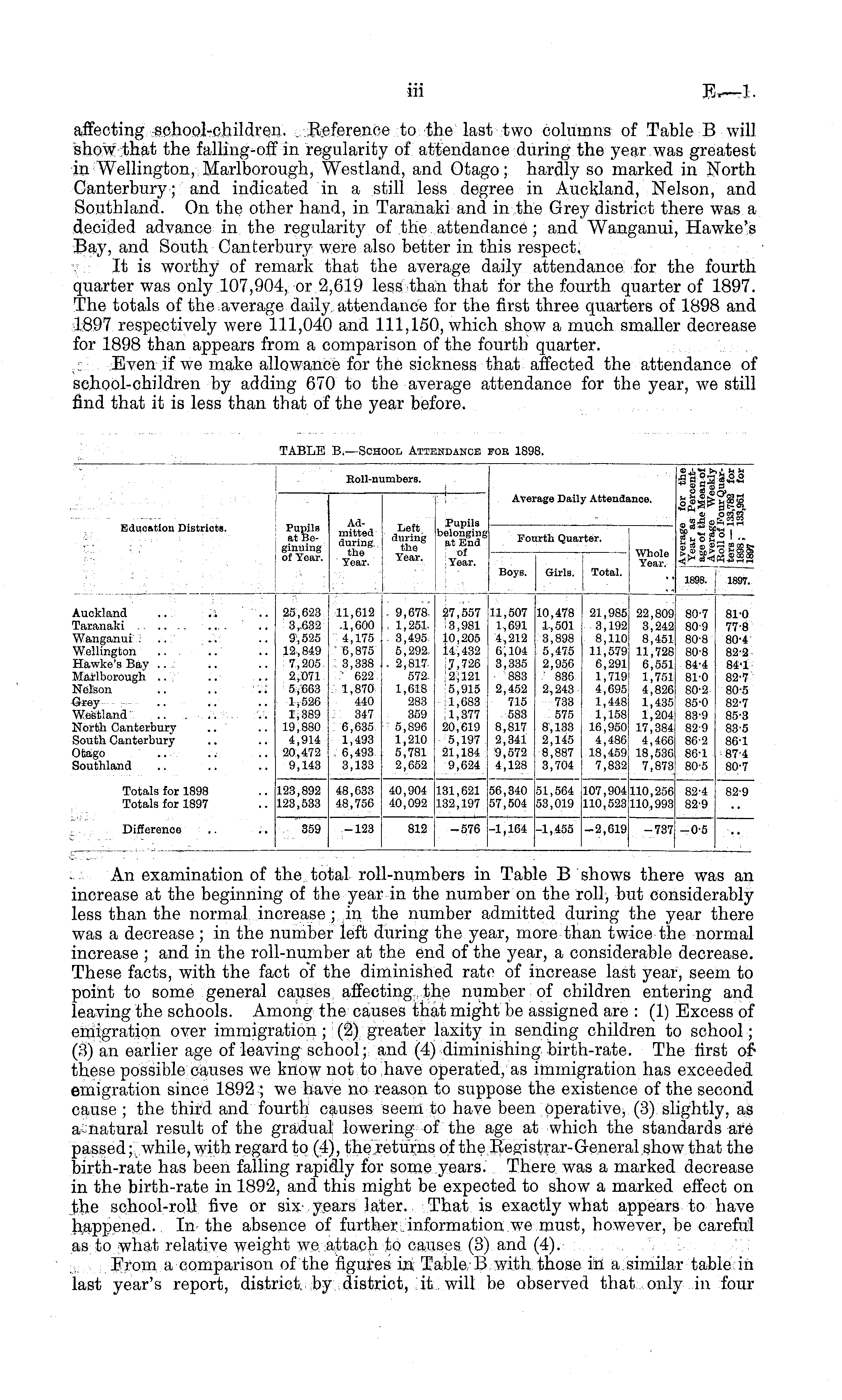 affecting school-children. ..Reference to the last two columns of Table B will show that the falling-off in regularity of attendance during the year was greatest in Wellington, Marlborough, Westland, and Otago; hardly so marked in North Canterbury; and indicated in a still less degree in Auckland, Nelson, and Southland. On the other hand, in Taranaki and in the Grey district there was a decided advance in the regularity of the attendance; and Wanganui, Hawke's Bay, and South Canterbury were also better in this respect, It is worthy of remark that the average daily attendance for the fourth quarter was only 107,904, or 2,619 less than that for the fourth quarter of 1897. The totals of the average daily attendance for the first three quarters of 1898 and 1897 respectively were 111,040 and 111,150, which show a much smaller decrease for 1898 than appears from a comparison of the fourth quarter. .:: Even if we make allowance for the sickness that affected the attendance of school-children by adding 670 to the average attendance for the year, we still find that it is less than that of the year before.