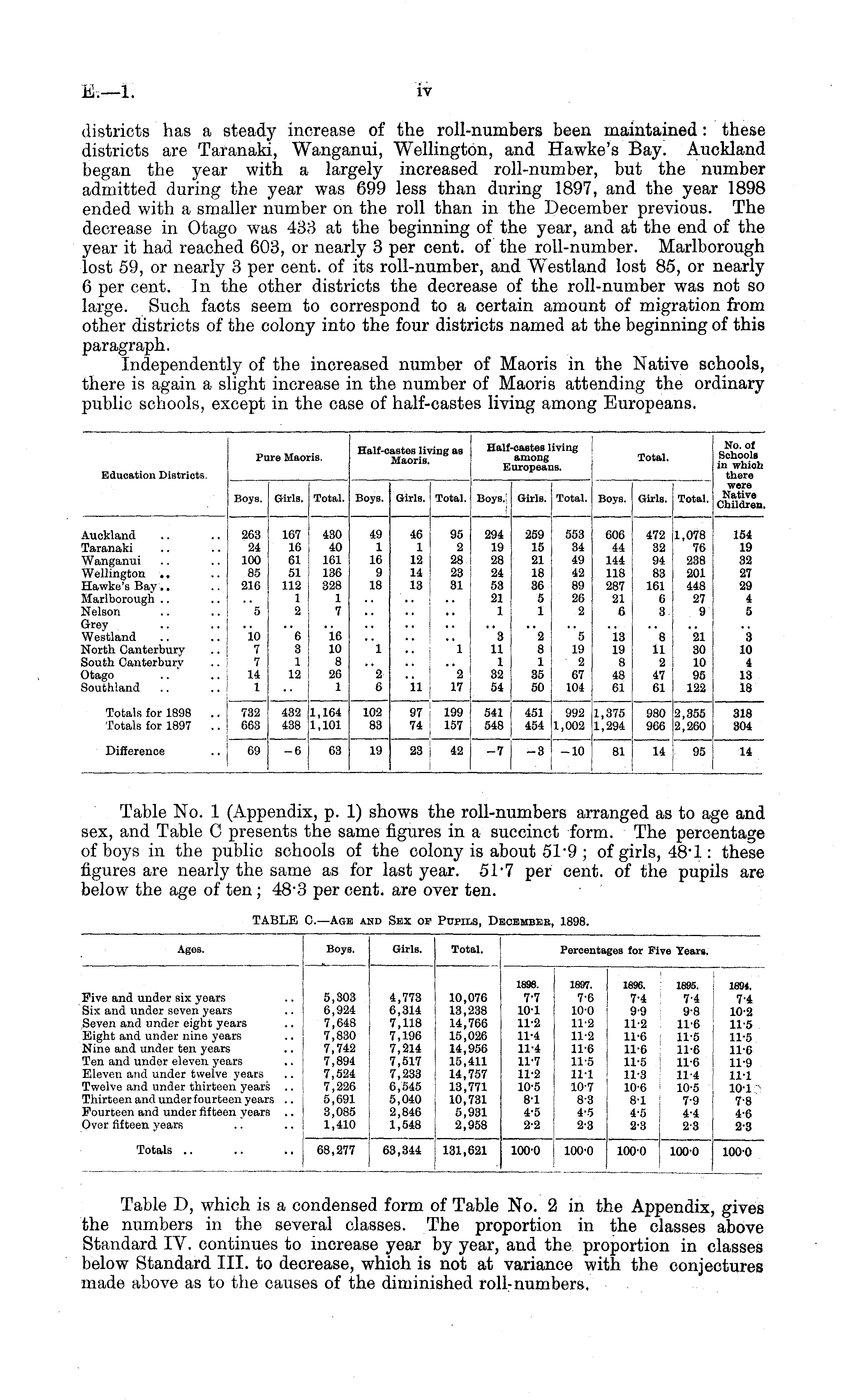 districts has a steady increase of the roll-numbers been maintained: these districts are Taranaki, Wanganui, Wellington, and Hawke's Bay. Auckland began the year with a largely increased roll-number, but the number admitted during the year was 699 less than during 1897, and the year 1898 ended with a smaller number on the roll than in the December previous. The decrease in Otago was 433 at the beginning of the year, and at the end of the year it had reached 603, or nearly 3 per cent, of the roll-number. Marlborough lost 59, or nearly 3 per cent, of its roll-number, and W'estland lost 85, or nearly 6 per cent. In the other districts the decrease of the roll-number was not so large. Such facts seem to correspond to a certain amount of migration from other districts of the colony into the four districts named at the beginning of this paragraph. Independently of the increased number of Maoris in the Native schools, there is again a slight increase in the number of Maoris attending the ordinary public schools, except in the case of half-castes living among Europeans.