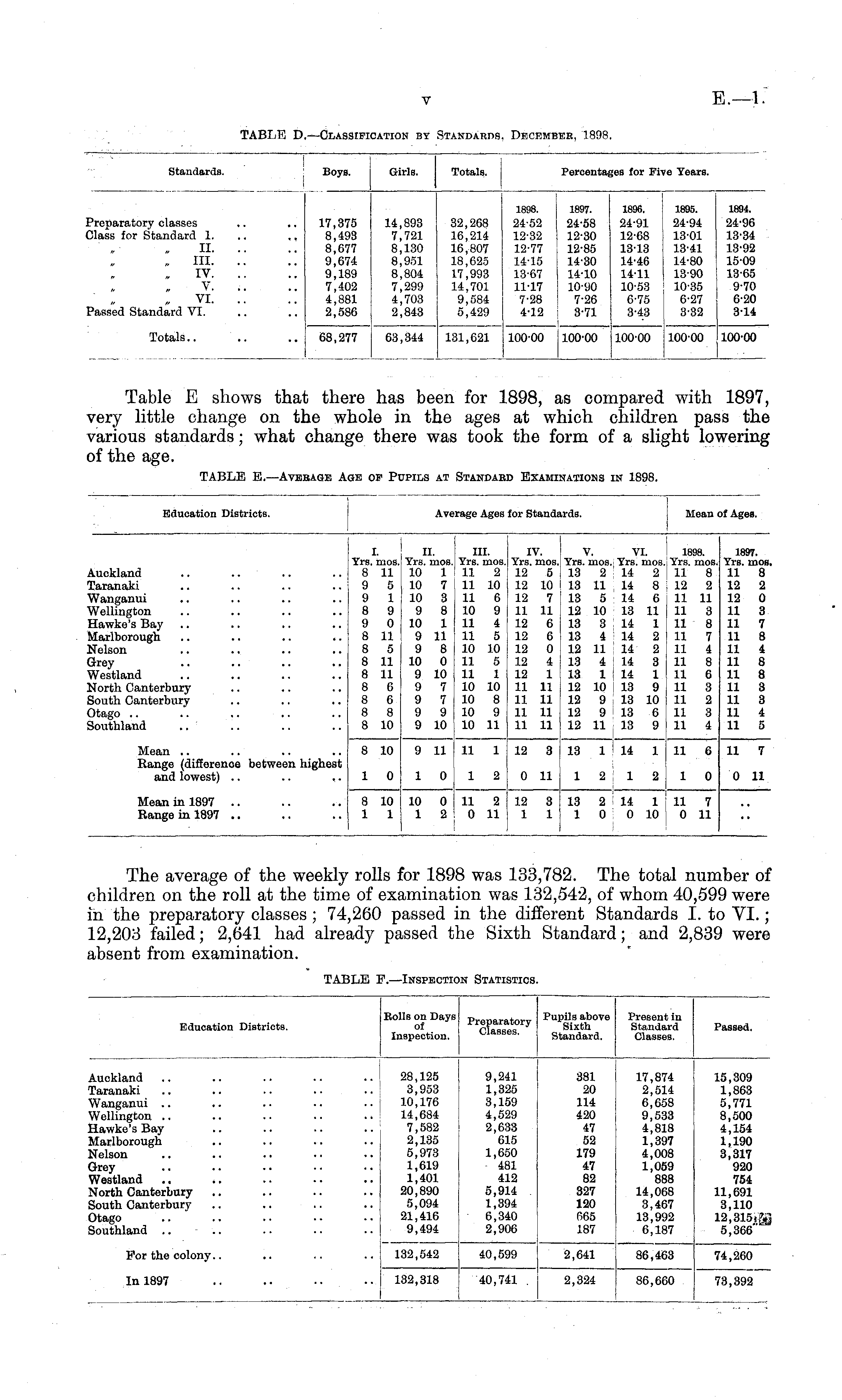 Table E shows that there has been for 1898, as compared with 1897, very little change on the whole in the ages at which children pass the various standards; what change there was took the form of a slight lowering of the age.