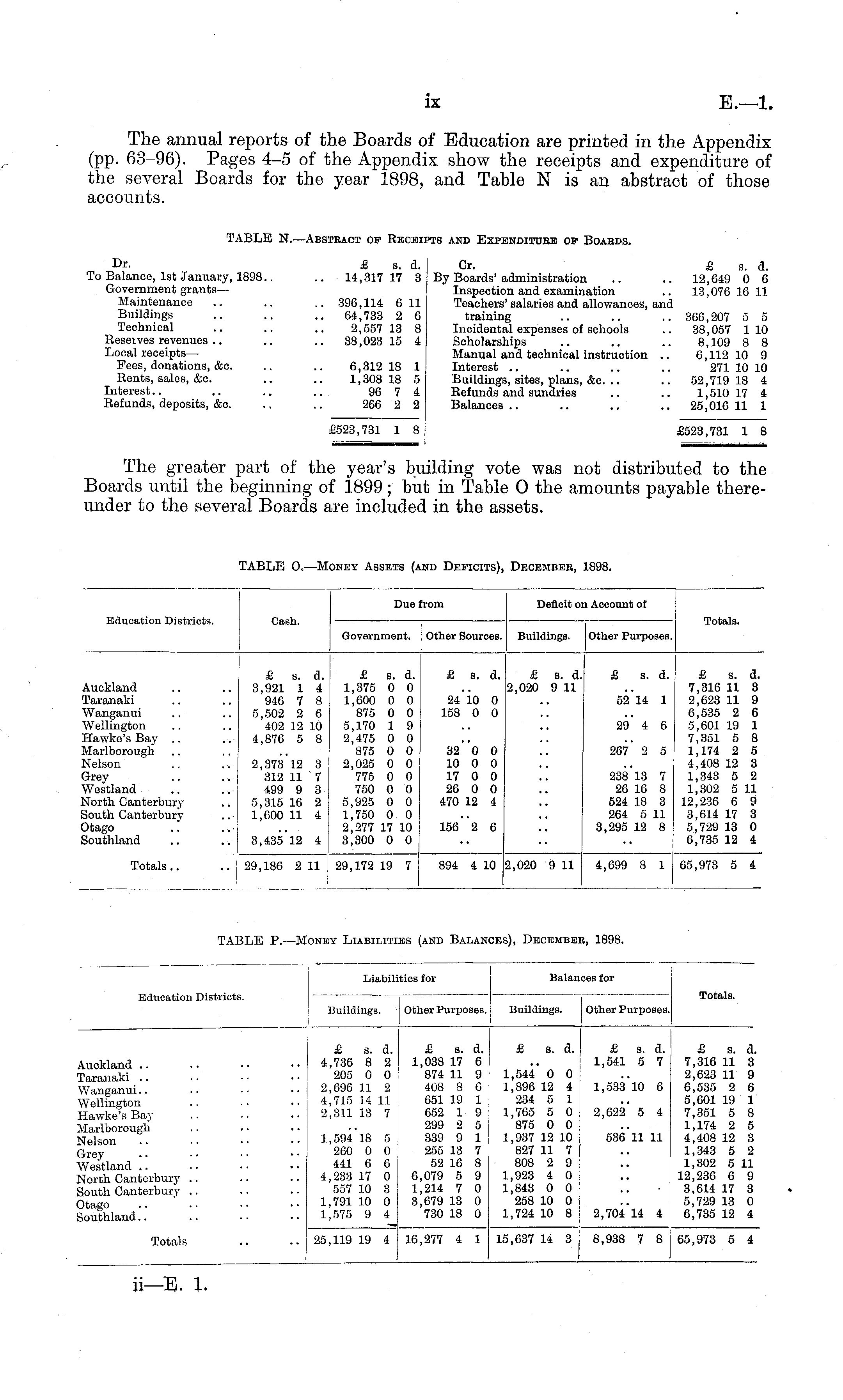 The annual reports of the Boards of Education are printed in the Appendix (pp. 63-96). Pages 4-5 of the Appendix show the receipts and expenditure of the several Boards for the year 1898, and Table N is an abstract of those accounts.