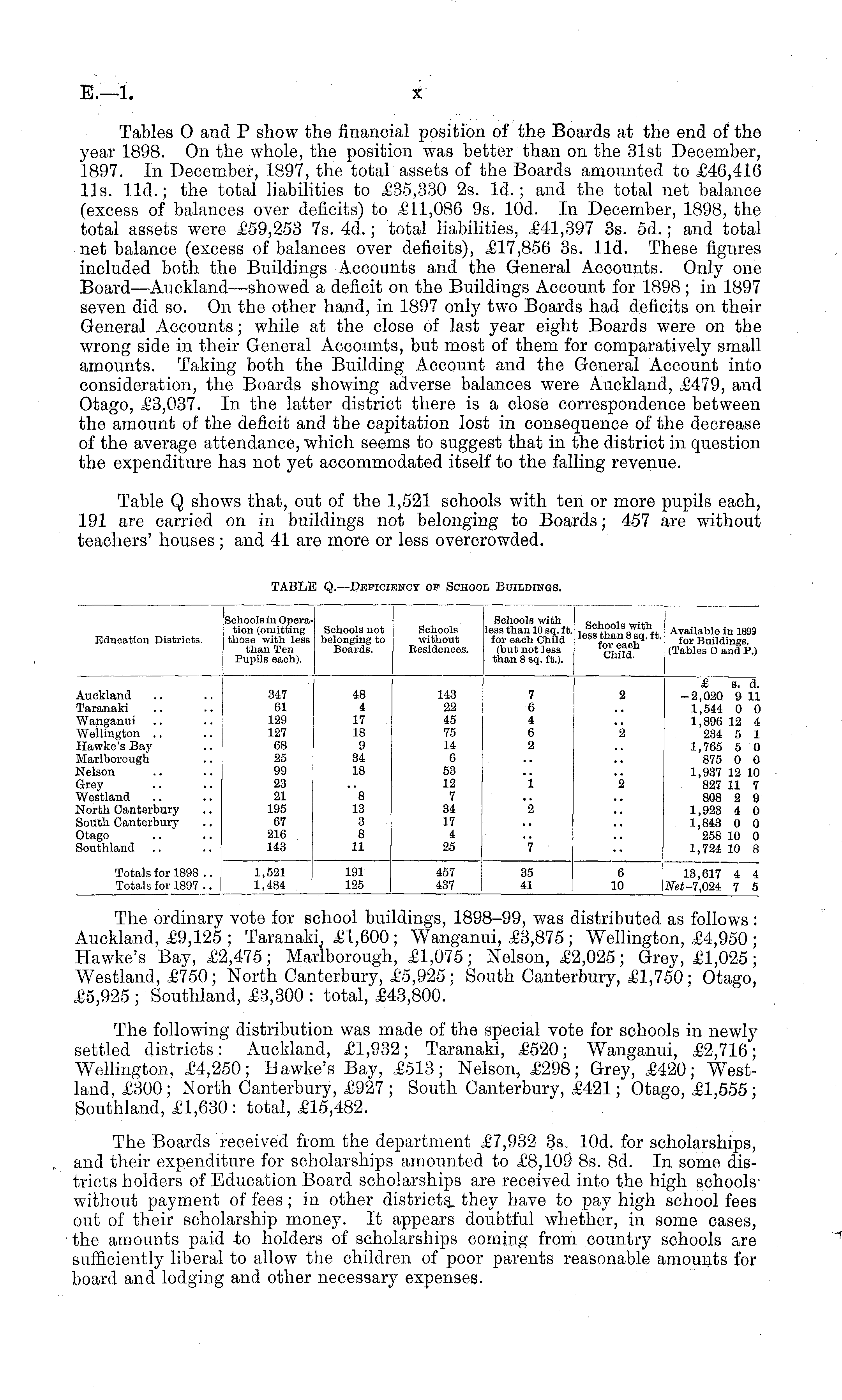 Tables 0 and P show the financial position of the Boards at the end of the year 1898. On the whole, the position was better than on the 31st December, 1897. In December, 1897, the total assets of the Boards amounted to £46,416 11s. lid.; the total liabilities to £35,330 2s. Id.; and the total net balance (excess of balances over deficits) to £ 11,086 9s. 10d. In December, 1898, the total assets were £59,253 7s. 4d.; total liabilities, £41,397 3s. 5d.; and total net balance (excess of balances over deficits), £17,856 3s. lid. These figures included both the Buildings Accounts and the General Accounts. Only one Board —Auckland—showed a deficit on the Buildings Account for 1898; in 1897 seven did so. On the other hand, in 1897 only two Boards had deficits on their General Accounts; while at the close of last year eight Boards were on the wrong side in their General Accounts, but most of them for comparatively small amounts. Taking both the Building Account and the General Account into consideration, the Boards showing adverse balances were Auckland, £479, and Otago, £3,037. In the latter district there is a close correspondence between the amount of the deficit and the capitation lost in consequence of the decrease of the average attendance, which seems to suggest that in the district in question the expenditure has not yet accommodated itself to the falling revenue. Table Q shows that, out of the 1,521 schools with ten or more pupils each, 191 are carried on in buildings not belonging to Boards; 457 are without teachers' houses; and 41 are more or less overcrowded.