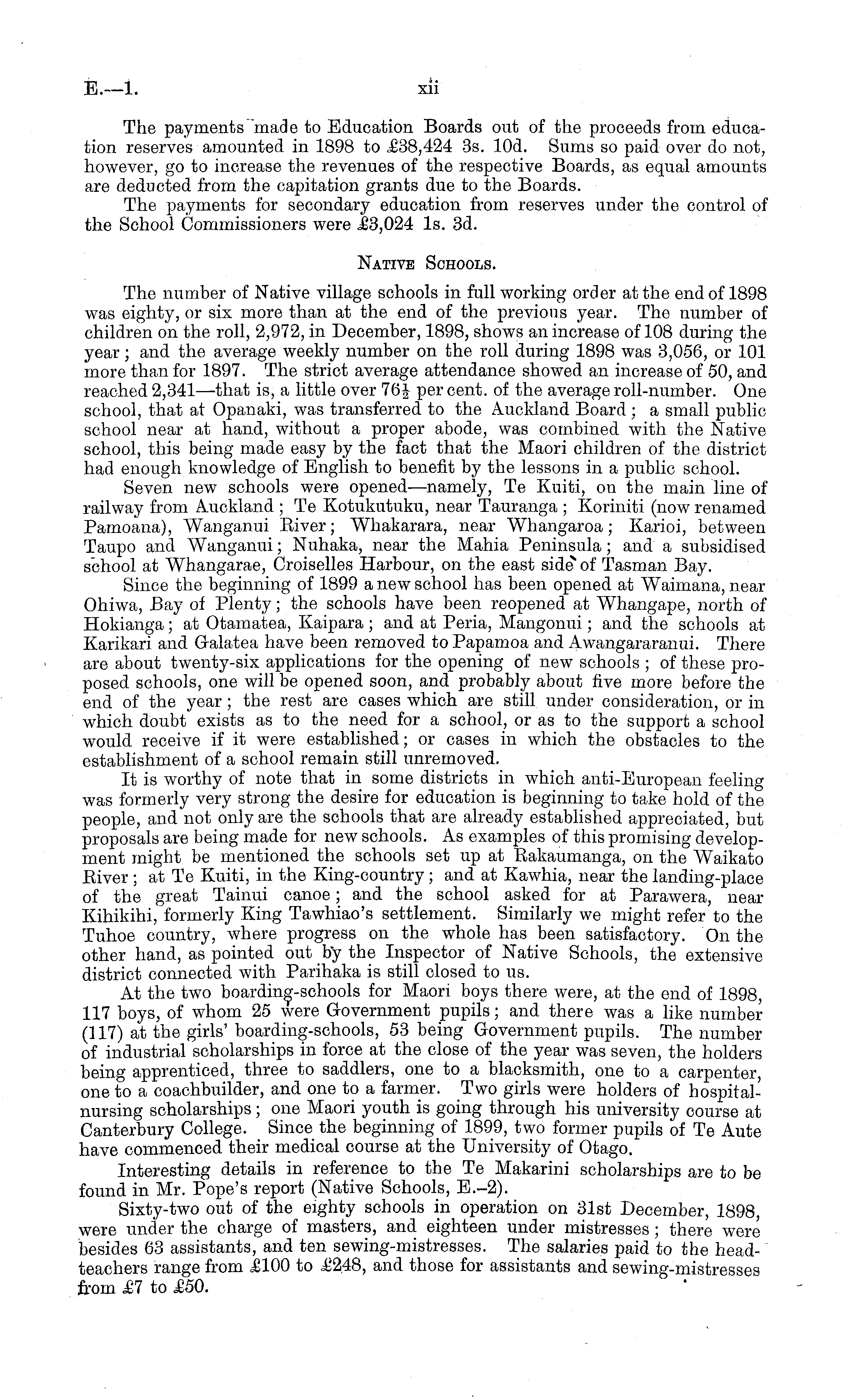 The payments "made to Education Boards out of the proceeds from education reserves amounted in 1898 to £38,424 3s. lOd. Sums so paid over do not, however, go to increase the revenues of the respective Boards, as equal amounts are deducted from the capitation grants due to the Boards. The payments for secondary education from reserves under the control of the School Commissioners were £3,024 Is. 3d. Native Schools. The number of Native village schools in full working order at the end of 1898 was eighty, or six more than at the end of the previous year. The number of children on the roll, 2,972, in December, 1898, shows an increase of 108 during the year; and the average weekly number on the roll during 1898 was 3,056, or 101 more than for 1897. The strict average attendance showed an increase of 50, and reached 2,341 —that is, a little over 76J percent, of the average roll-number. One school, that at Opanaki, was transferred to the Auckland Board ; a small public school near at hand, without a proper abode, was combined with the Native school, this being made easy by the fact that the Maori children of the district had enough knowledge of English to benefit by the lessons in a public school. Seven new schools were opened—namely, Te Kuiti, on the main line of railway from Auckland ; Te Kotukutuku, near Tauranga ; Koriniti (now renamed Pamoana), Wanganui Biver; Whakarara, near Whangaroa; Karioi, between Taupo and. Wanganui; Nuhaka, near the Mahia Peninsula; and a subsidised school at Whangarae, Croiselles Harbour, on the east side" of Tasman Bay. Since the beginning of 1899 a new school has been opened at Waimana, near Ohiwa, Bay of Plenty; the schools have been reopened at Whangape, north of Hokianga; at Otamatea, Kaipara ; and at Peria, Mangonui; and the schools at Karikari and Galatea have been removed to Papamoa and Awangararanui. There are about twenty-six applications for the opening of new schools ; of these proposed schools, one will be opened soon, and probably about five more before the end of the year; the rest are cases which are still under consideration, or in which doubt exists as to the need for a school, or as to the support a school would receive if it were established; or cases in which the obstacles to the establishment of a school remain still unremoved. It is worthy of note that in some districts in which anti-European feeling was formerly very strong the desire for education is beginning to take hold of the people, and not only are the schools that are already established appreciated, but proposals are being made for new schools. As examples of this promising development might be mentioned the schools set up at Bakaumanga, on the Waikato Biver; at Te Kuiti, in the King-country; and at Kawhia, near the landing-place of the great Tainui canoe; and the school asked for at Parawera, near Kihikihi, formerly King Tawhiao's settlement. Similarly we might refer to the Tuhoe country, where progress on the whole has been satisfactory. On the other hand, as pointed out by the Inspector of Native Schools, the extensive district connected with Parihaka is still closed to us. At the two boarding-schools for Maori boys there were, at the end of 1898, 117 boys, of whom 25 were Government pupils; and there was a like number (117) at the girls' boarding-schools, 53 being Government pupils. The number of industrial scholarships in force at the close of the year was seven, the holders being apprenticed, three to saddlers, one to a blacksmith, one to a carpenter, one to a coachbuilder, and one to a farmer. Two girls were holders of hospitalnursing scholarships; one Maori youth is going through his university course at Canterbury College. Since the beginning of 1899, two former pupils of Te Aute have commenced their medical course at the University of Otago. Interesting details in reference to the Te Makarini scholarships are to be found in Mr. Pope's report (Native Schools, E.-2). Sixty-two out of the eighty schools in operation on 31st December, 1898, were under the charge of masters, and eighteen under mistresses; there were besides 63 assistants, and ten sewing-mistresses. The salaries paid to the headteachers range from £100 to £248, and those for assistants and sewing-mistresses from £7 to £50.