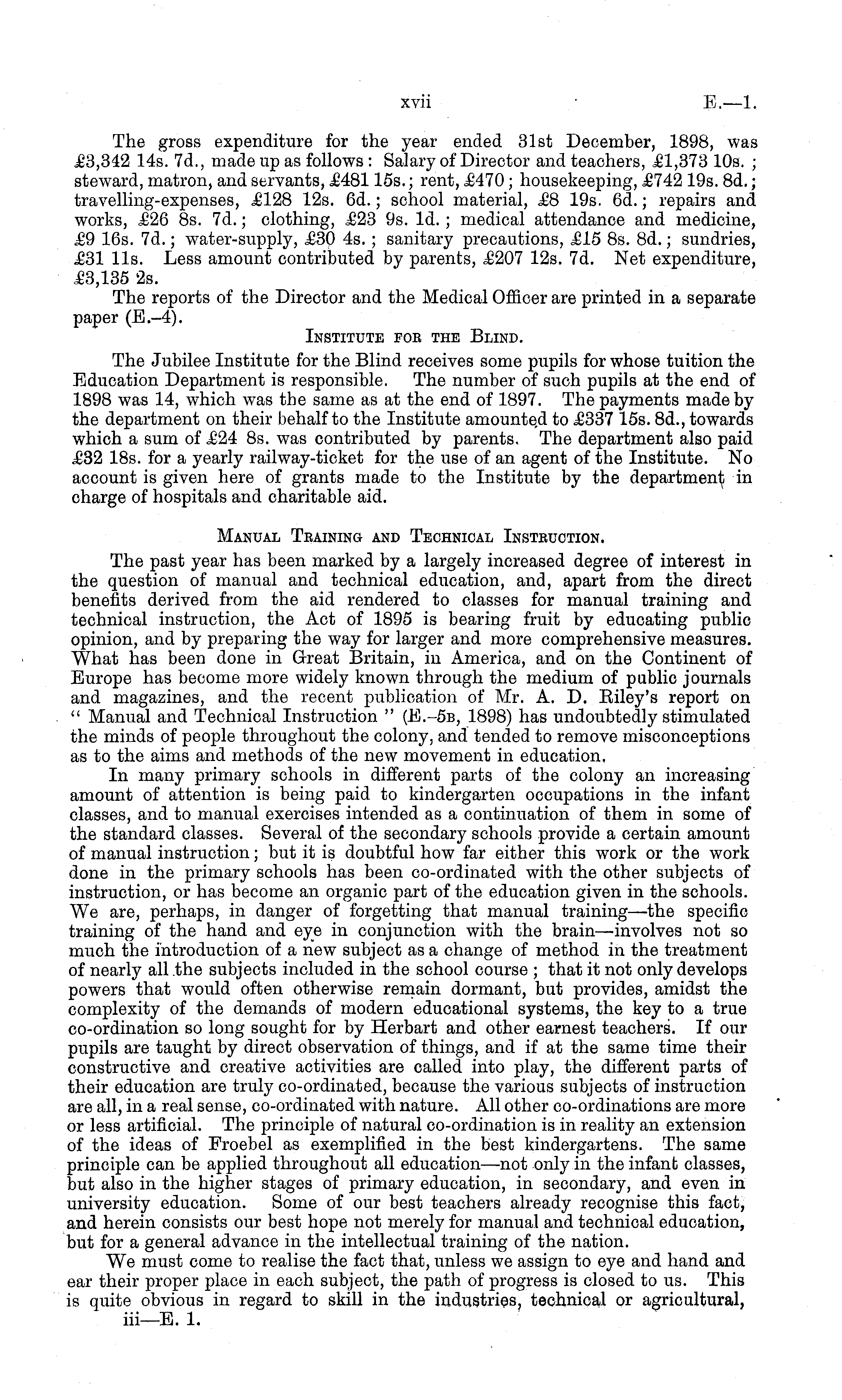 The gross expenditure for the year ended 31st December, 1898, was £3,342 14s. 7d., made up as follows : Salary of Director and teachers, £1,373 10s. ; steward, matron, and servants, £481155.; rent, £470; housekeeping, £742 19s. Bd.; travelling-expenses, £128 12s. 6d.; school material, £8 19s. 6d.; repairs and works, £26 Bs. 7d.; clothing, £23 9s. Id. ; medical attendance and medicine, £9 16s. 7d.; water-supply, £30 4s. ; sanitary precautions, £15 Bs. Bd.; sundries, £31 lis. Less amount contributed by parents, £207 12s. 7d. Net expenditure, £3,135 2s. The reports of the Director and the Medical Officer are printed in a separate paper (E.-4). Institute foe the Blind. The Jubilee Institute for the Blind receives some pupils for whose tuition the Education Department is responsible. The number of such pupils at the end of 1898 was 14, which was the same as at the end of 1897. The payments made by the department on their behalf to the Institute amounted to £337 15s. Bd., towards which a sum of £24 Bs. was contributed by parents. The department also paid £32 18s. for a yearly railway-ticket for the use of an agent of the Institute. No account is given here of grants made to the Institute by the in charge of hospitals and charitable aid. Manual Teaining and Technical Insteuction. The past year has been marked by a largely increased degree of interest in the question of manual and technical education, and, apart from the direct benefits derived from the aid rendered to classes for manual training and technical instruction, the Act of 1895 is bearing fruit by educating public opinion, and by preparing the way for larger and more comprehensive measures. What has been done in Great Britain, in America, and on the Continent of Europe has become more widely known through the medium of public journals and magazines, and the recent publication of Mr. A. D. Biley's report on " Manual and Technical Instruction " (E.-sb, 1898) has undoubtedly stimulated the minds of people throughout the colony, and tended to remove misconceptions as to the aims and methods of the new movement in education. In many primary schools in different parts of the colony an increasing amount of attention is being paid to kindergarten occupations in the infant classes, and to manual exercises intended as a continuation of them in some of the standard classes. Several of the secondary schools provide a certain amount of manual instruction; but it is doubtful how far either this work or the work done in the primary schools has been co-ordinated with the other subjects of instruction, or has become an organic part of the education given in the schools. We are, perhaps, in danger of forgetting that manual training—the specific training of the hand and eye in conjunction with the brain —involves not so much the introduction of a new subject as a change of method in the treatment of nearly all the subjects included in the school course ; that it not only develops powers that would often otherwise remain dormant, but provides, amidst the complexity of the demands of modern educational systems, the key to a true co-ordination so long sought for by Herbart and other earnest teachers. If our pupils are taught by direct observation of things, and if at the same time their constructive and creative activities are called into play, the different parts of their education are truly co-ordinated, because the various subjects of instruction are all, in a real sense, co-ordinated with nature. All other co-ordinations are more or less artificial. The principle of natural co-ordination is in reality an extension of the ideas of Froebel as exemplified in the best kindergartens. The same principle can be applied throughout all education—not only in the infant classes, but also in the higher stages of primary education, in secondary, and even in university education. Some of our best teachers already recognise this fact, and herein consists our best hope not merely for manual and technical education, but for a general advance in the intellectual training of the nation. We must come to realise the fact that, unless we assign to eye and hand and ear their proper place in each subject, the path of progress is closed to us. This is quite obvious in regard to skill in the industries, technical or agricultural,