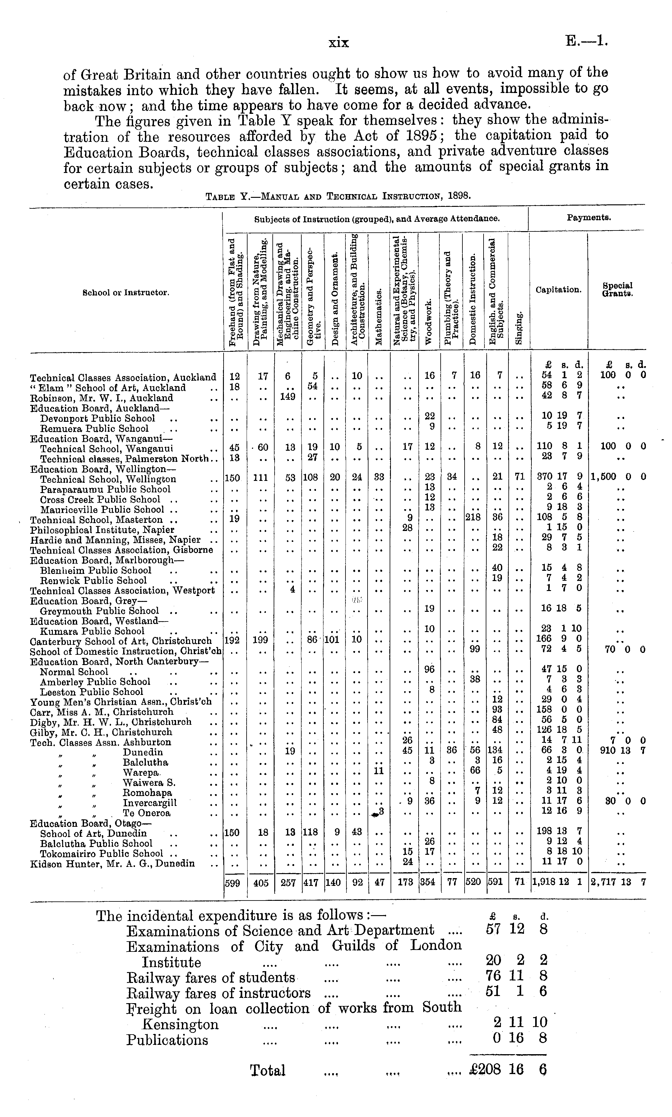 of Great Britain and other countries ought to show us how to avoid many of the mistakes into which they have fallen. It seems, at all events, impossible to go back now; and the time appears to have come for a decided advance. The figures given in Table V speak for themselves: they show the administration of the resources afforded by the Act of 1895; the capitation paid to Education Boards, technical classes associations, and private adventure classes for certain subjects or groups of subjects; and the amounts of special grants in certain cases.