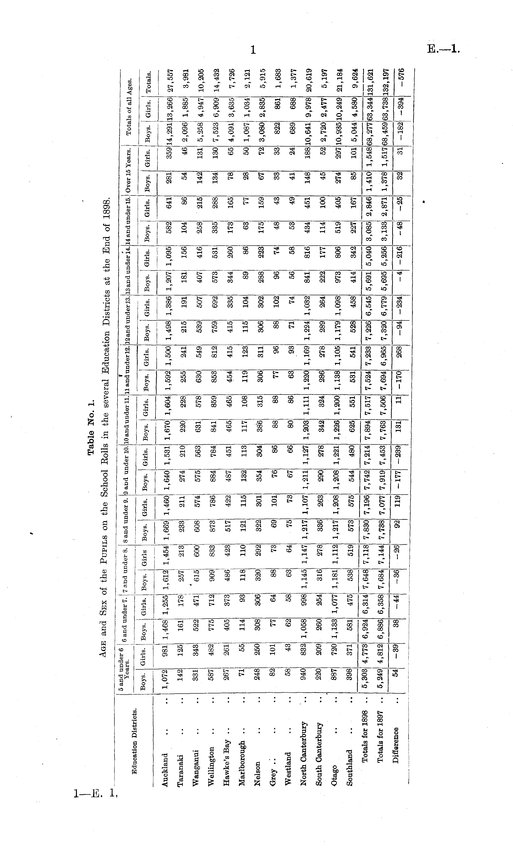 5 and under 6 Years. 6 and under 7. 7 a,na under 8. 8 and under 9. 9 and under 10. 11 and under 12. 13 and under 14. 10 and under 11.1 .2 and under 13. 14a,ndunderl5. Over 15 Years. Totals of all Ages. Education Districts. Boys. ] Girls, i I Boys. Girls. Boys. I Girls Boys. Girls. Boys. Girls. Boys. Girls. Boys. Girls. Boys. J Girls. Boys. Girls. Boys. I Girls. Boys. Girls. Boys. Girls. Totals. i [ Auckland 1,072 981 1,468 1,255 1,612 1,4541 i 1,669 1,460 1,640 1,531 1,670 1,604 1,500 1,498 1,386 1,095 582 641 281 359 27,557 1,592 l,207l 14,291 13,266 Taranaki 142 125 I 161 178 1 2571 213 233 m 274J 210 220 228 255 241 215 191 18l! 156 1041 I 86 54 46 2,096 1,8851 I 3,981 Wanganui 331 343; ■ ! 522 471. 615! C00 1 608 574 575! 563 631 578 630 549 539 507 407! 416 258 215 142 131 5,258 4,947 10,205 Wellington 587 482j i 775 712 909; 833 873 786 884 784 841 859 853 812 759 692 573 531 335 288 134 130 7,523 6,909 14,432 Hawke's Bay 267 201 405 373 486 ! 423i 517 422 487 451 465 465 454 415 415 335 3441 260 178 165 78 65 4,091 3,635 7,726 Marlborough 71 55 i 114 93j 118 i 110 121 115 132 113 117 108 119 123 115 104 89 86 63 77 28 50 l,087| 1,034 2,121 Nelson 248 250 ) 308 306 320i 292 322 301 354 304 386 315 306 311 306 302 288 175 159 67 72 3,080 2,835 5,915 Grey .'. 82 101 77 64 88J i 73 69 ' 101 76 86 88 88 77 96 88 102 96 74 48 43 33 33 822 861 1,683 Westland 58 43 I 62 58 63 1 64 75 73 67 66 80 86 63 93 71 74 56 58 53 49 41 24 689 688 1,377 North Canterbury 940 832 ! 1,058 998 1,145 ' 1,147 1,217 1,107 1,211 1,127 1,203 1,111 1,220 1,169 1,224 1,032 841 816 434 451 148 188 10,641 9,978 20,619 South Canterbury 220 209 > 260 254 316 i 278 336 i 263 290 ' 278 342 324 286 278 289 264 222 177 114 100 45 52 2,720 2,477 5,197 Otago 887 720 > 1,133 1,077 j 1,181 1,112 1,217 1,208 1,208 1,221 1,226 1,200 1,138 1,105 1,179 1,098 973 806 519 405 274 297 10,935 10,249 21,184 Southland 398 371 581 475 538 i 519 573 575 544 480 625 551 531 541 528 458 414 342 227 167 85 101 5,044! Totals for 1898 .. 5,303 4,773 i 6,924 6,314 7,648 7,118 7,830 7,196 7,742 7,214 7,517 7,524 7,233 7,226 6,545 5,040 3,085 2,846 1,410 1,548 4,580 63,344 9,624 7,894 5,691 18,277 131,621 Totals for 1897 .. 5,249 4,812 -89| ! 6,886 6,358 7,684 7,144 7,738 7,077 119 7,919 7,453 7,763 131 7,506 7,694 6,965 7,320 -94 6,779 -234 5,695 5,256 -216 3,133 2,871 1,378 1,517 18,459 63,738 132,197 Difference 54 38 -44 — 36J 92 -239 -170 268 -25 31 -26 -177 11 -48 32 -4 -182 -394 -57(