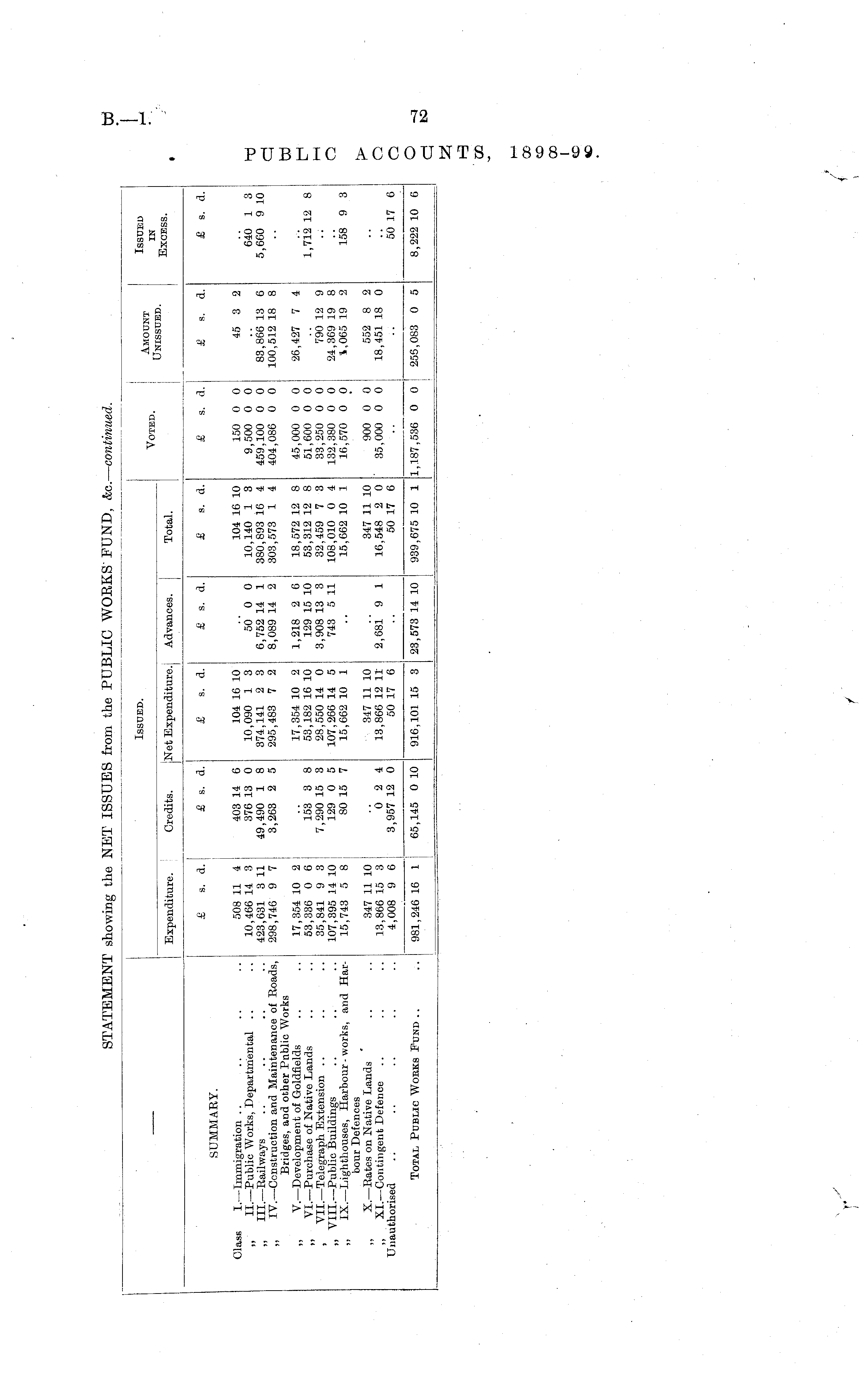 Expenditure. .SSUED. Voted. Amount Unissued. Issued in Excess. Credits. jNet Expenditure. Advances. Total. £ s. d. £ s. d. £ s. d. £ s. d. £ s. d. £ s. d. £ s. d. £ s. a. SUMMARY. Class I.—Immigration .. ,, II. —Public Works, Departmental .. ,, III. —Railways ,, IV. —Construction and Maintenance of Roads, Bridges, and other Pnblic Works „ V.—Development of Goldfields „ VI. —Purchase of Native Lands , VII. —Telegraph Extension „ VIII.— Public Buildings ,, IX. —Lighthouses, Harbour- works, and Harbour Defences ,, X.—Rates on Native Lands ,, XI. —Contingent Defence Unauthorised 508 11 4 10,466 14 3 423,631 3 11 298,746 9 7 17,354 10 2 53,336 0 6 35,841 9 3 107,395 14 10 15,743 5 8 403 14 6 376 13 0 49,490 1 8 3,263 2 5 153 3 8 7,290 15 3 129 0 5 80 15 7 104 16 10 10,090 1 3 374,141 2 3 295,483 7 2 50 0 0 6,752 14 1 8,089 14 2 104 16 10 10,140 1 3 380,893 16 4 303,573 1 4 150 0 0 9,500 0 0 459,100 0 0 404,086 0 0 45 3 2 83,866 13 6 100,512 18 8 640 1 3 5,660 9 10 17,354 10 2 53,182 16 10 28,550 14 0 107,266 14 5 15,662 10 1 1,218 2 6 129 15 10 3,908 13 3 743 5 11 18,572 12 8 53,312 12 8 32,459 7 3 108,010 0 4 15,662 10 1 45,000 0 0 51,600 0 0 33,250 0 0 132,380 0 0 16,570 0 0 26,427 7 4 790 12 9 24,369 19 8 1,065 19 2 1,712 12 8 158 9 3 ' 347 11 10 i 13,866 15 3 4,008 9 6 981,246 16 1 0 2 4 3,957 12 0 65,145 0 10 347 11 10 13,866 12 11 50 17 6 2,681 9 1 347 11 10 16,548 2 0 50 17 6 900 0 0 35,000 0 0 552 8 2 18,451 18 0 50 17 6 Total Public Woeks Fund 916,101 15 3 23,573 14 10 939,675 10 1 1,187,536 0 0 256,083 0 5 8,222 10 6 I ■■ 4 / i