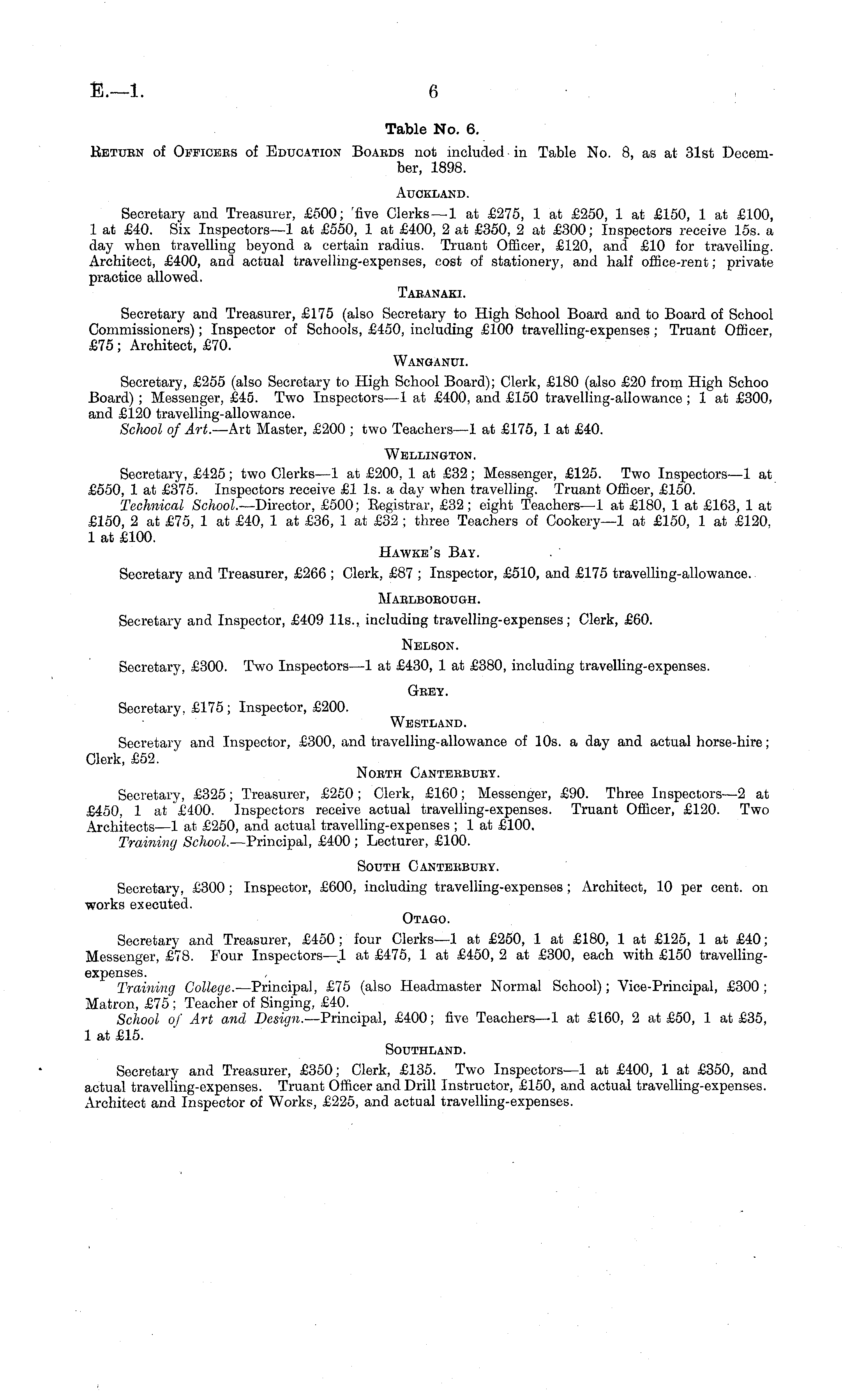 Table No. 6. Keturn of Officebs of Education Boabds not included in Table No. 8, as at 31st December, 1898. Auckland. Secretary and Treasurer, £500; 'five Clerks—l at £275, 1 at £250, 1 at £150, 1 at £100, lat £40. Six Inspectors—l at £550, 1 at £400, 2at £350, 2 at £300; Inspectors receive 15s. a day when travelling beyond a certain radius. Truant Officer, £120, and £10 for travelling. Architect, £400, and actual travelling-expenses, cost of stationery, and half office-rent; private practice allowed. Taranaki. Secretary and Treasurer, £175 (also Secretary to High School Board and to Board of School Commissioners); Inspector of Schools, £450, including £100 travelling-expenses; Truant Officer, £75; Architect, £70. Wanganui. Secretary, £255 (also Secretary to High School Board); Clerk, £180 (also £20 from High Schoo Board) ; Messenger, £45. Two Inspectors—l at £400, and £150 travelling-allowance ;1 at £300, and £120 travelling-allowance. School of Art.— Art Master, £200 ; two Teachers—l at £175, lat £40. Wellington. Secretary, £425; two Clerks—l at £200, lat £32; Messenger, £125. Two Inspectors—l at £550, lat £375. Inspectors receive £1 Is. a day when travelling. Truant Officer, £150. Technical School. —Director, £500; Begistrar, £32; eight Teachers—l at £180, 1 at £163, 1 at £150, 2 at £75, 1 at £40, 1 at £36, 1 at £32 ; three Teachers of Cookery—l at £150, 1 at £120, 1 at £100. Hawke's Bay. Secretary and Treasurer, £266 ; Clerk, £87 ; Inspector, £510, and £175 travelling-allowance. Maelbobough. Secretary and Inspector, £409 lis., including travelling-expenses; Clerk, £60. Nelson. Secretary, £300. Two Inspectors- —1 at £430, lat £380, including travelling-expenses. Gbey. Secretary, £175; Inspector, £200. Westland. Secretary and Inspector, £300, and travelling-allowance of 10s. a day and actual horse-hire; Clerk, £52. NOETH CaNTEBBUEY. Secretary, £325; Treasurer, £250 ; Clerk, £160; Messenger, £90. Three Inspectors—2 at £450, 1 at £400. Inspectors receive actual travelling-expenses. Truant Officer, £120. Two Architects —1 at £250, and actual travelling-expenses ;1 at £100. Training School. —Principal, £400 ; Lecturer, £100. South Cantekbuey. Secretary, £300; Inspector, £600, including travelling-expenses; Architect, 10 per cent, on works executed. Otago. Secretary and Treasurer, £450; four Clerks—l at £250, 1 at £180, 1 at £125, 1 at £40; Messenger, £78. Four Inspectors —,1 at £475, 1 at £450, 2 at £300, each with £150 travellingexpenses. Training College. —Principal, £75 (also Headmaster Normal School); Vice-Principal, £300; Matron, £75; Teacher of Singing, £40. School of Art and Design. —Principal, £400; five Teachers—l at £160, 2at £50, lat £35, 1 at £15. Southland. Secretary and Treasurer, £350; Clerk, £135. Two Inspectors—l at £400, lat £350, and actual travelling-expenses. Truant Officer and Drill Instructor, £150, and actual travelling-expenses. Architect and Inspector of Works, £225, and actual travelling-expenses.