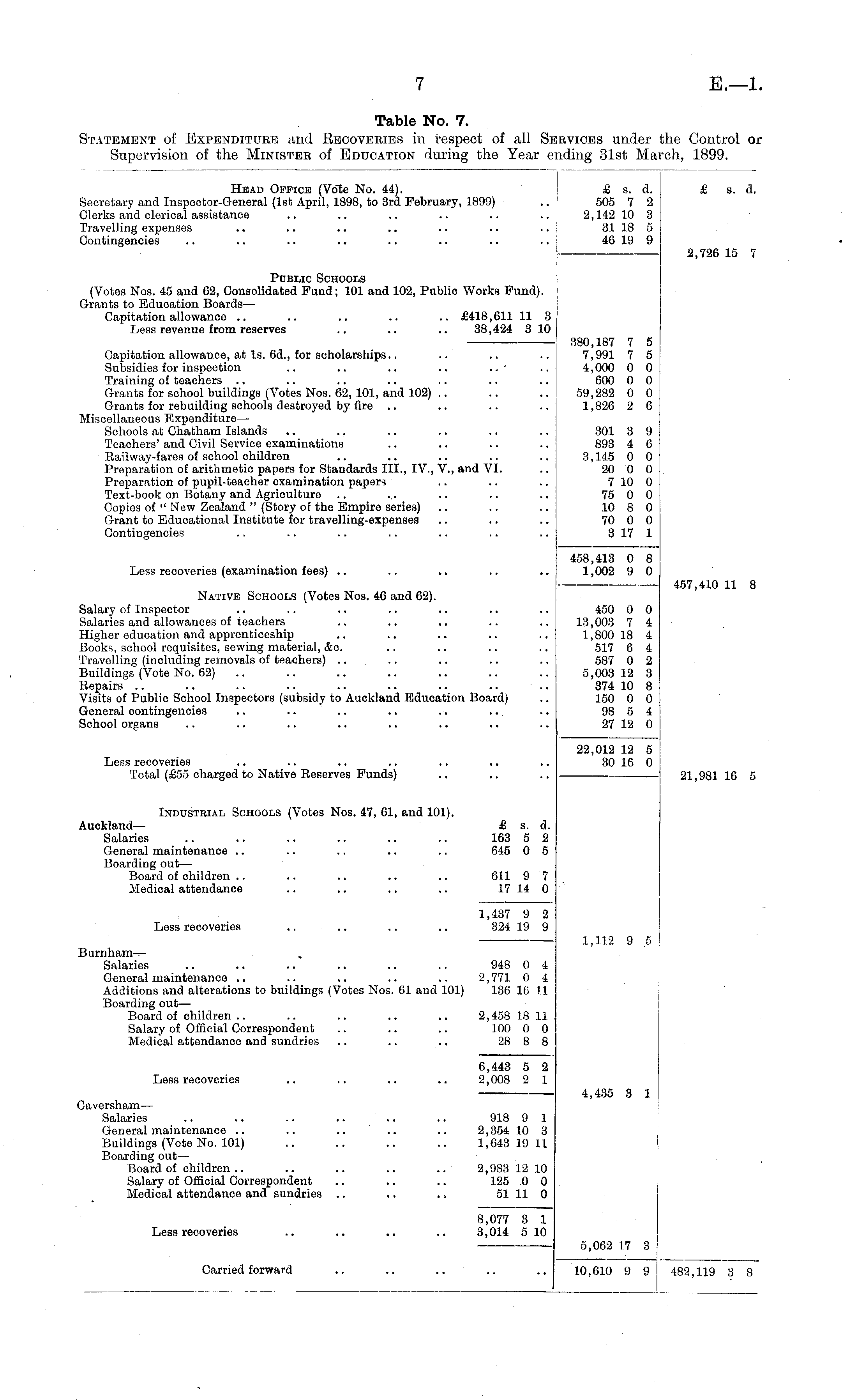 Table No. 7. Statement of Expenditure and Recoveries in respect of all Services under the Control or Supervision of the Minister of Education during the Year ending 31st March, 1899.