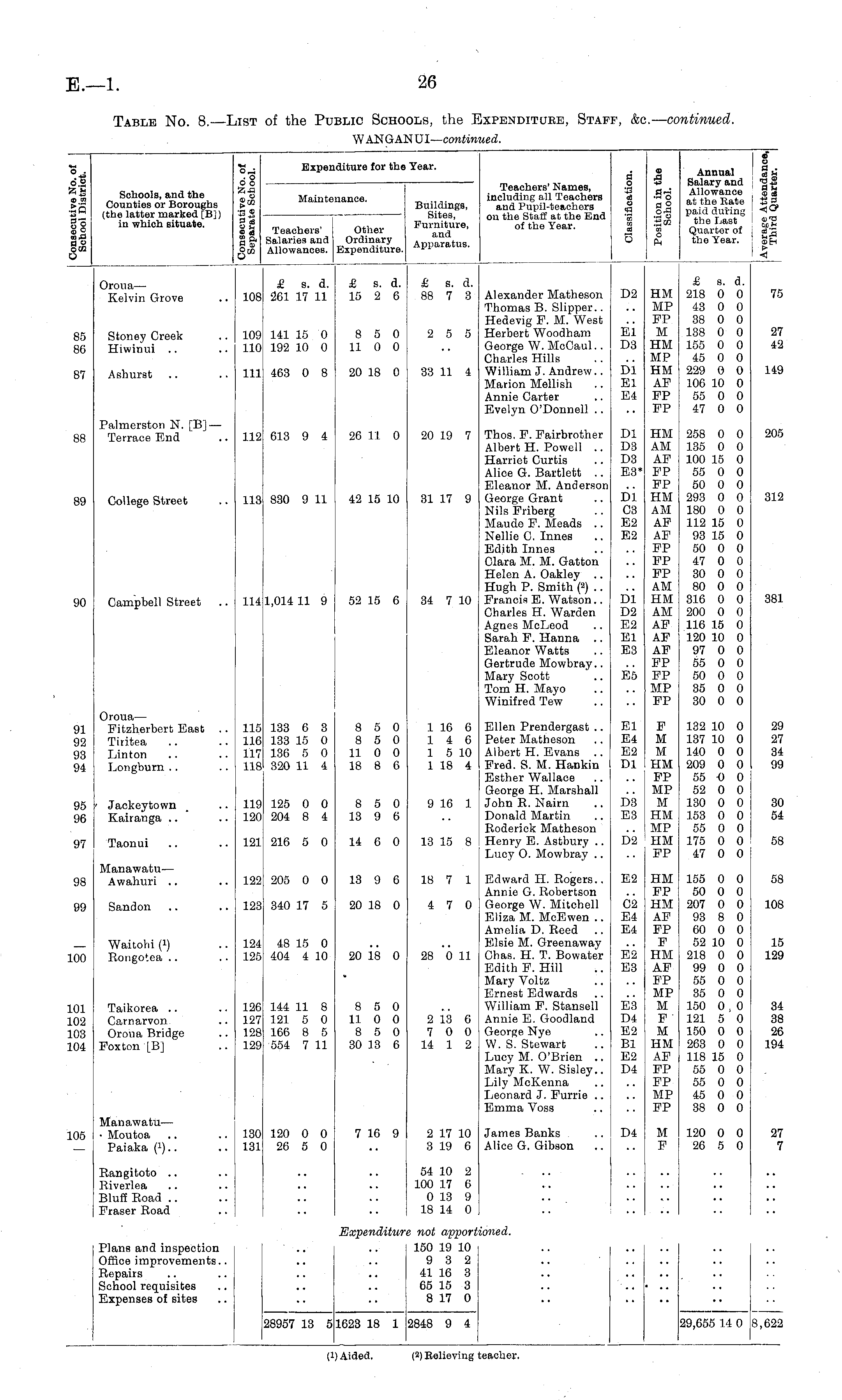 Table No. 8.—List of the Public Schools, the Expenditure, Staff, &c.— continued. WANGANUI— continued.