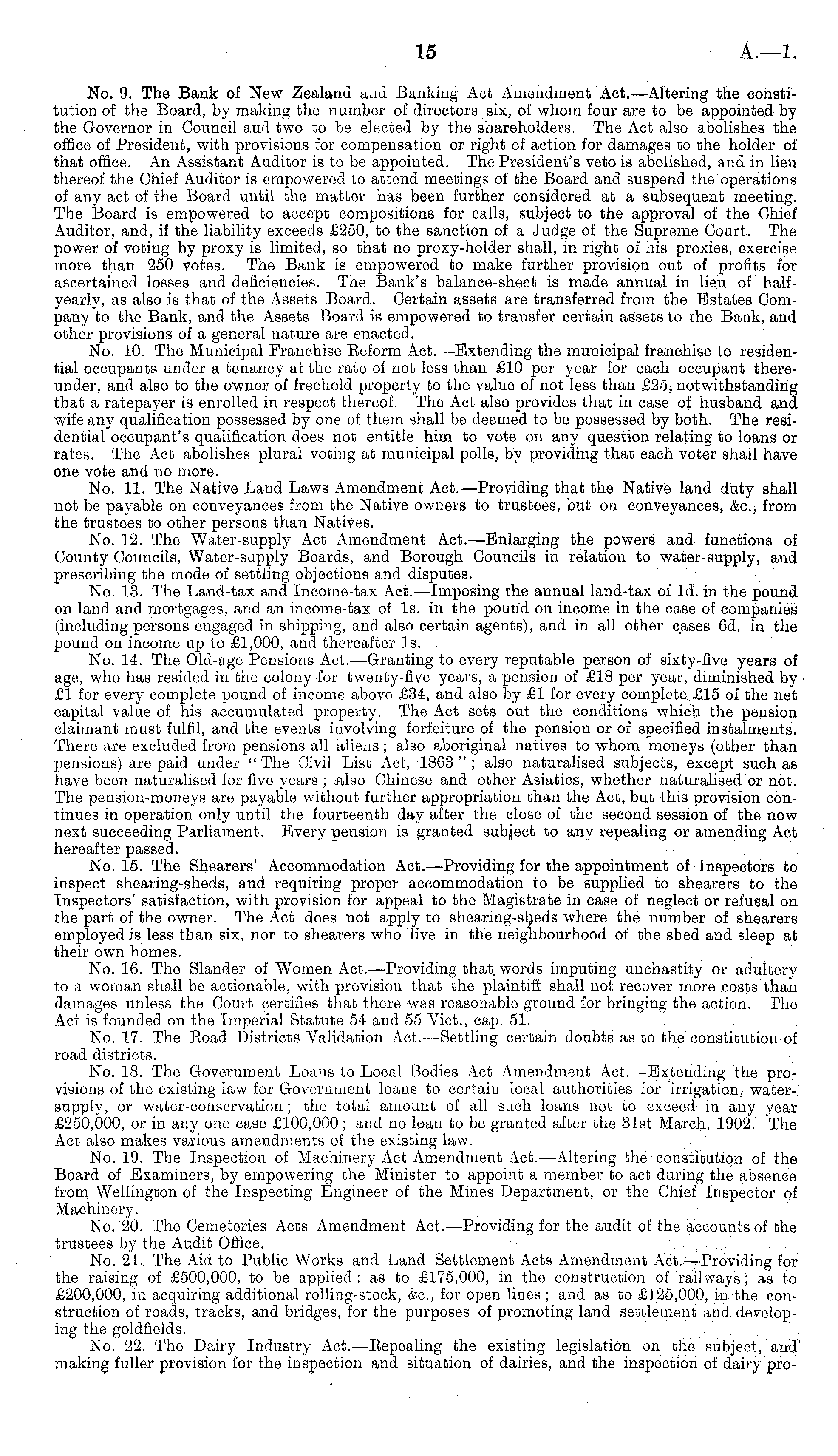 No. 9. The Bank of New Zealand and Banking Act Amendment Act. —Altering the constitution of the Board, by making the number of directors six, of whom four are to be appointed by the Governor in Council and two to be elected by the shareholders. The Act also abolishes the office of President, with provisions for compensation or right of action for damages to the holder of that office. An Assistant Auditor is to be appointed. The President's veto is abolished, and in lieu thereof the Chief Auditor is empowered to attend meetings of the Board and suspend the operations of any act of the Board until the matter has been further considered at a subsequent meeting. The Board is empowered to accept compositions for calls, subject to the approval of the Chief Auditor, and, if the liability exceeds £250, to the sanction of a Judge of the Supreme Court. The power of voting by proxy is limited, so that no proxy-holder shall, in right of his proxies, exercise more than 250 votes. The Bank is empowered to make further provision out of profits for ascertained losses and deficiencies. The Bank's balance-sheet is made annual in lieu of halfyearly, as also is that of the Assets Board. Certain assets are transferred from the Estates Company to the Bank, and the Assets Board is empowered to transfer certain assets to the Bank, and other provisions of a general nature are enacted. No. 10. The Municipal Franchise Reform Act.—Extending the municipal franchise to residential occupants under a tenancy at the rate of not less than £10 per year for each occupant thereunder, and also to the owner of freehold property to the value of not less than £25, notwithstanding that a ratepayer is enrolled in respect thereof. The Act also provides that in case of husband and wife any qualification possessed by one of them shall be deemed to be possessed by both. The residential occupant's qualification does not entitle him to vote on any question relating to loans or rates. The Act abolishes plural voting at municipal polls, by providing that each voter shall have one vote and no more. Mo. 11. The Native Land Laws Amendment Act. —Providing that the Native land duty shall not be payable on conveyances from the Native owners to trustees, but on conveyances, &c, from the trustees to other persons than Natives. No. 12. The Water-supply Act Amendment Act. —Enlarging the powers and functions of County Councils, Water-supply Boards, and Borough Councils in relation to water-supply, and prescribing the mode of settling objections and disputes. No. 13. The Land-tax and Income-tax Act. —Imposing the annual land-tax of ld. in the pound on land and mortgages, and an income-tax of Is. in the pound on income in the case of companies (including persons engaged in shipping, and also certain agents), and in all other cases 6d. in the pound on income up to £1,000, and thereafter Is. . No. 14. The Old-age Pensions Act.—Granting to every reputable person of sixty-five years of age, who has resided in the colony for twenty-five years, a pension of £18 per year, diminished by £1 for every complete pound of income above £34, and also by £1 for every complete £15 of the net capital value of his accumulated property. The Act sets out the conditions which the pension claimant must fulfil, and the events involving forfeiture of the pension or of specified instalments. There are excluded from pensions all aliens; also aboriginal natives to whom moneys (other than pensions) are paid under "The Civil List Act, 1863"; also naturalised subjects, except such as have been naturalised for five years ; .also Chinese and other Asiatics, whether naturalised or not. The pension-moneys are payable without further appropriation than the Act, but this provision continues in operation only until the fourteenth day after the close of the second session of the now next succeeding Parliament. Every pension is granted subject to any repealing or amending Act hereafter passed. No. 15. The Shearers' Accommodation Act.—Providing for the appointment of Inspectors to inspect shearing-sheds, and requiring proper accommodation to be supplied to shearers to the Inspectors' satisfaction, with provision for appeal to the Magistrate in case of neglect or refusal on the part of the owner. The Act does not apply to shearing-sheds where the number of shearers employed is less than six, nor to shearers who live in the neighbourhood of the shed and sleep at their own homes. No. 16. The Slander of Women Act.—Providing that, words imputing unchastity or adultery to a woman shall be actionable, with provision that the plaintiff shall not recover more costs than damages unless the Court certifies that there was reasonable ground for bringing the action. The Act is founded on the Imperial Statute 54 and 55 Vict., cap. 51. No. 17. The Road Districts Validation Act. —Settling certain doubts as to the constitution of road districts. No. 18. The Government Loans to Local Bodies Act Amendment Act.—Extending the provisions of the existing law for Government loans to certain local authorities for irrigation, watersupply, or water-conservation; the total amount of all such loans not to exceed in any year £250,000, or in any one case £100,000; and no loan to be granted after the 31st March, 1902. The Act also makes various amendments of the existing law. No. 19. The Inspection of Machinery Act Amendment Act.—Altering the constitution of the Board of Examiners, by empowering the Minister to appoint a member to act daring the absence from Wellington of the Inspecting Engineer of the Mines Department, or the Chief Inspector of Machinery. No. 20. The Cemeteries Acts Amendment Act.—Providing for the audit of the accounts of the trustees by the Audit Office. No. 21. The Aid to Public Works and Land Settlement Acts Amendment Act.—Providing for the raising of £500,000, to be applied: as to £175,000, in the construction of railways; as to £200,000, in acquiring additiona