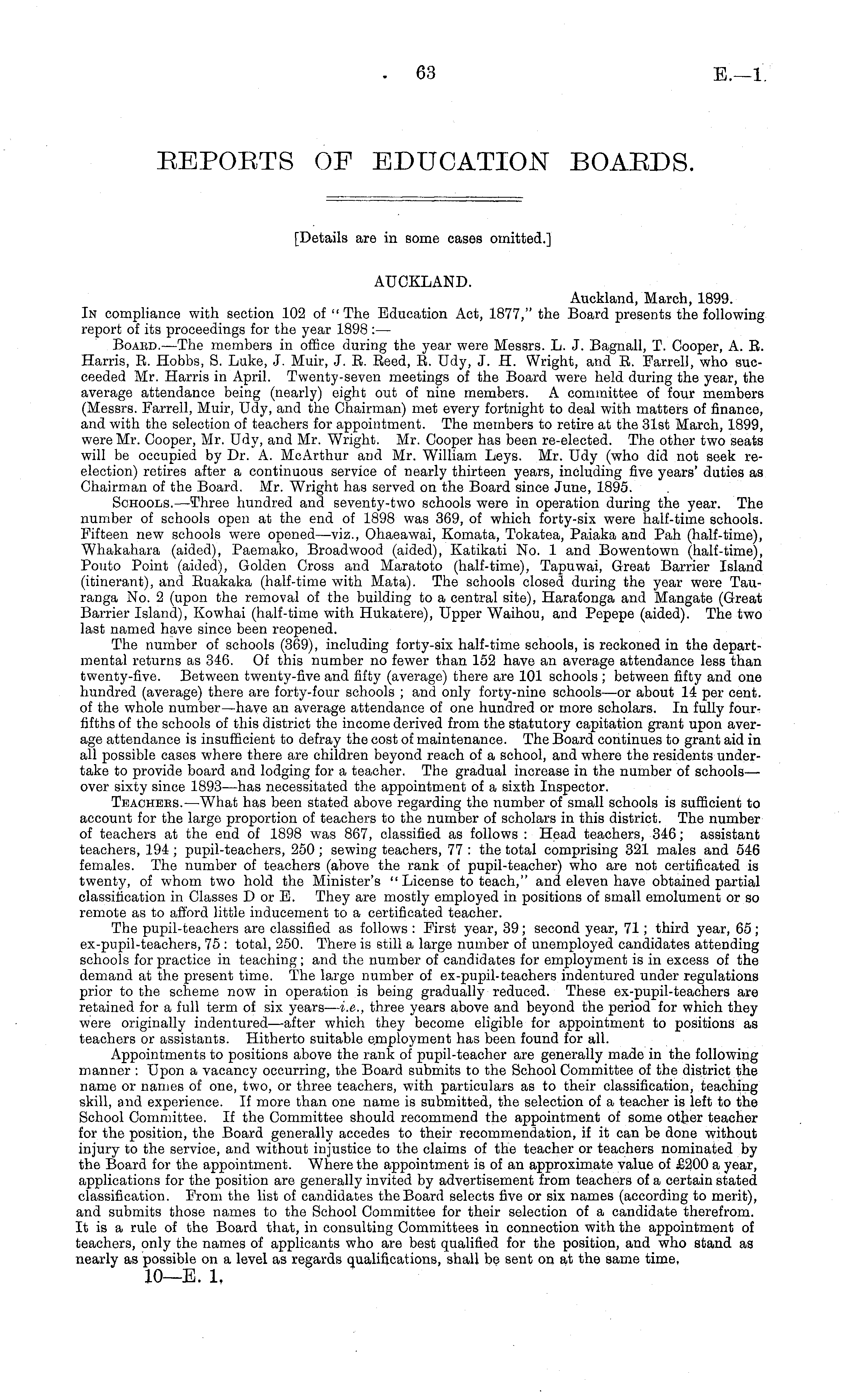 [Details are in some cases omitted.] AUCKLAND. Auckland, March, 1899. In compliance with section 102 of "The Education Act, 1877," the Board presents the following report of its proceedings for the year 1898: — Boaed.—The members in office during the year were Messrs. L. J. Bagnall, T. Cooper, A. B. Harris, B. Hobbs, S. Luke, J. Muir, J. B. Beed, B. Udy, J. H. Wright, and B. Parrel), who succeeded Mr. Harris in April. Twenty-seven meetings of the Board were held during the year, the average attendance being (nearly) eight out of nine members. A committee of four members (Messrs. Farrell, Muir, Udy, and the Chairman) met every fortnight to deal with matters of finance, and with the selection of teachers for appointment. The members to retire at the 31st March, 1899, were Mr. Cooper, Mr. Udy, and Mr. "Wright. Mr. Cooper has been re-elected. The other two seats will be occupied by Dr. A. McArthur and Mr. William Leys. Mr. Udy (who did not seek reelection) retires after a continuous service of nearly thirteen years, including five years' duties as Chairman of the Board. Mr. Wright has served on the Board since June, 1895. Schools. —Three hundred and seventy-two schools were in operation during the year. The number of schools open at the end of 1898 was 369, of which forty-six were half-time schools. Fifteen new schools were opened—viz., Ohaeawai, Komata, Tokatea, Paiaka and Pah (half-time), Whakahara (aided), Paemako, Broadwood (aided), Katikati No. 1 and Bowentown (half-time), Pouto Point (aided), Golden Cross and Maratoto (half-time), Tapuwai, Great Barrier Island (itinerant), and Buakaka (half-time with Mata). The schools closed during the year were Tauranga No. 2 (upon the removal of the building to a central site), HarafJonga and Mangate (Great Barrier Island), Kowhai (half-time with Hukatere), Upper Waihou, and Pepepe (aided). The two last named have since been reopened. The number of schools (369), including forty-six half-time schools, is reckoned in the departmental returns as 346. Of this number no fewer than 152 have an average attendance less than twenty-five. Between twenty-five and fifty (average) there are 101 schools ; between fifty and one hundred (average) there are forty-four schools ; and only forty-nine schools —or about 14 per cent, of the whole number—have an average attendance of one hundred or more scholars. In fully fourfifths of the schools of this district the income derived from the statutory capitation grant upon average attendance is insufficient to defray the cost of maintenance. The Board continues to grant aid in all possible cases where there are children beyond reach of a school, and where the residents undertake to provide board and lodging for a teacher. The gradual increase in the number of schools— over sixty since 1893 —has necessitated the appointment of a sixth Inspector. Teachebs.—What has been stated above regarding the number of small schools is sufficient to account for the large proportion of teachers to the number of scholars in this district. The number of teachers at the end of 1898 was 867, classified as follows : Head teachers, 346; assistant teachers, 194 ; pupil-teachers, 250 ; sewing teachers, 77 : the total comprising 321 males and 546 females. The number of teachers (above the rank of pupil-teacher) who are not certificated is twenty, of whom two hold the Minister's "License to teach," and eleven have obtained partial classification in Classes Dor E. They are mostly employed in positions of small emolument or so remote as to afford little inducement to a certificated teacher. The pupil-teachers are classified as follows : First year, 39; second year, 71; third year, 65; ex-pupil-teachers, 75 : total, 250. There is still a large number of unemployed candidates attending schools for practice in teaching ; and the number of candidates for employment is in excess of the demand at the present time. The large number of ex-pupil-teachers indentured under regulations prior to the scheme now in operation is being gradually reduced. These ex-pupil-teachers are retained for a full term of six years— i.e., three years above and beyond the period for which they were originally indentured—after which they become eligible for appointment to positions as teachers or assistants. Hitherto suitable employment has been found for all. Appointments to positions above the rank of pupil-teacher are generally made in the following manner : Upon a vacancy occurring, the Board submits to the School Committee of the district the name or names of one, two, or three teachers, with particulars as to their classification, teaching skill, and experience. If more than one name is submitted, the selection of a teacher is left to the School Committee. If the Committee should recommend the appointment of some other teacher for the position, the Board generally accedes to their recommendation, if it can be done without injury to the service, and without injustice to the claims of the teacher or teachers nominated by the Board for the appointment. Where the appointment is of an approximate value of £200 a year, applications for the position are generally invited by advertisement from teachers of a certain stated classification. From the list of candidates the Board selects five or six names (according to merit), and submits those names to the School Committee for their selection of a candidate therefrom. It is a rule of the Board that, in consulting Committees in connection with the appointment of teachers, only the names of applicants who are best qualified for the position, and who stand as nearly as possible on a level as regards qualifications, shall be sent on at the same time,