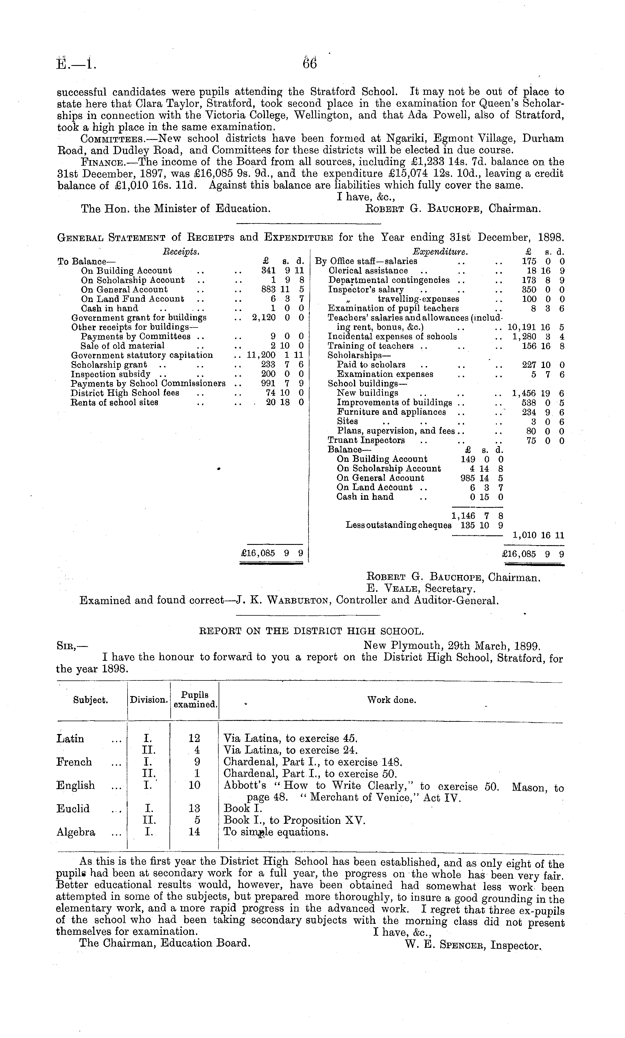 Geneeal Statement of Beceipts and Expenditube for the Year ending 31st December, 1898. Receipts. Expenditure. £ s. d. To Balance— £ s. d. By Office staff—salaries .. .. 175 0 0 On Building Account .. .. 341 911 Clerical assistance .. .. .. 18 16 9 On Scholarship Aooount .. .. 19 8 Departmental contingencies .. .. 173 8 9 On General Account .. .. 883 11 5 Inspector's salary .. .. .. 350 0 0 On Land Fund Account .. .. 6 3 7 „ travelling-expenses .. 100 0 0 Cash in hand .. .. .. 10 0 Examination of pupil teachers .. 8 3 6 Government grant for buildings .. 2,120 0 0 Teachers'salaries and allowances (includOther receipts for buildings— ing rent, bonus, &c.) .. .. 10,19116 5 Payments by Committees .. .. 9 0 0 Incidental expenses of sohools .. 1,280 3 4 Sale of old material .. .. 210 0 Training of teachers .. .. .. 156 16 8 Government statutory capitation .. 11,200 1 11 Scholarships— Scholarship grant .. .. .. 233 7 6 Paid to scholars .. .. ' .. 227 10 0 Inspection subsidy .. .. .. 200 0 0 Examination expenses .. .. 5 7 6 Payments by School Commissioners .. 991 7 9 School buildings— District High School fees .. .. 74 10 0 New buildings .. .. .. 1,456 19 6 Rents of school sites .. 20 18 0 Improvements of buildings .. .. 538 0 5 Furniture and appliances .. .." 234 9 6 Sites .. .. .. .. 3 0 6 Plans, supervision, and fees .. .. 80 0 0 Truant Inspectors .. .. .. 75 0 0 Balance — £ a. d. On Building Account 149 0 0 « On Scholarship Account 4 14 8 On General Aooount 985 14 5 On Land Account .. 6 3 7 Cash in hand .. 0 15 0 1,146 7 8 Less outstanding cheques 135 10 9 1,010 16 11 £16,085 9 9 £16,085 9 9 Bobebt G. Bauchope, Chairman. E. Veale, Secretary. Examined and found correct —J. K. Waebubton, Controller and Auditor-General.