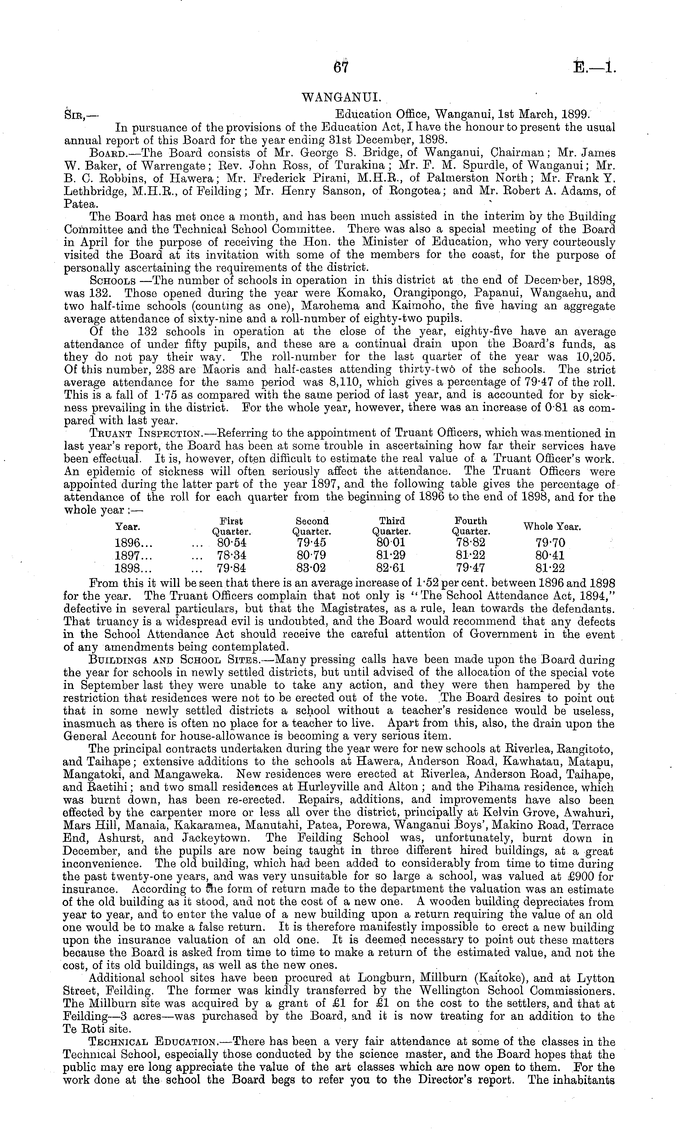 WANGANUI. Sic, — Education Office, Wanganui, Ist March, 1899. In pursuance of the provisions of the Education Act, I have the honour to present the usual annual report of this Board for the year ending 31st December, 1898. Boaed.—The Board consists of Mr. George S. Bridge, of Wanganui, Chairman; Mr. James W.Baker, of Warrengate; Bey. John Boss, of Turakina; Mr. F. M. Spurdle, of Wanganui; Mr. B. C. Bobbins, of Hawera; Mr. Frederick Pirani, M.H.8., of Palmerston North; Mr. Frank Y. Lethbridge, M.H.8., of Feilding; Mr. Henry Sanson, of Bongotea; and Mr. Bobert A. Adams, of Patea. The Board has met once a month, and has been much assisted in the interim by the Building Committee and the Technical School Committee. There was also a special meeting of the Board in April for the purpose of receiving the Hon. the Minister of Education, who very courteously visited the Board at its invitation with some of the members for the coast, for the purpose of personally ascertaining the requirements of the district. Schools —The number of schools in operation in this district at the end of December, 1898, was 132. Those opened during the year were Komako, Orangipongo, Papanui, Wangaehu, and two half-time schools (counting as one), Marohema and Kaimoho, the five having an aggregate average attendance of sixty-nine and a roll-number of eighty-two pupils. Of the 132 schools in operation at the close of the year, eighty-five have an average attendance of under fifty pupils, and these are a continual drain upon the Board's funds, as they do not pay their way. The roll-number for the last quarter of the year was 10,205. Of this number, 238 are Maoris and half-castes attending thirty-two of the schools. The strict average attendance for the same period was 8,110, which gives a percentage of 79-47 of the roll. This is a fall of 175 as compared with the same period of last year, and is accounted for by sickness prevailing in the district. For the whole year, however, there was an increase of 0-81 as compared with last year. Teuant Inspection.—Beferring to the appointment of Truant Officers, which was mentioned in last year's report, the Board has been at some trouble in ascertaining how far their services have been effectual. It is, however, often difficult to estimate the real value of a Truant Officer's work. An epidemic of sickness will often seriously affect the attendance. The Truant Officers were appointed during the latter part of the year 1897, and the following table gives the percentage of attendance of the roll for each quarter from the beginning of 1896 to the end of 1898, and for the whole year;— Year First Second Third Fourth Whole Year lear Quarter. Quarter. Quarter. Quarter. vvnoie * ear ' 1896... ... 80-54 79-45 8001 78-82 79-70 1897... ... 78-34 8079 81-29 81-22 80-41 1898... ... 79-84 83-02 82-61 79-47 81-22 From this it will be seen that there is an average increase of 1-52 per cent, between 1896 and 1898 for the year. The Truant Officers complain that not only is "The School Attendance Act, 1894," defective in several particulars, but that the Magistrates, as a rule, lean towards the defendants. That truancy is a widespread evil is undoubted, and the Board would recommend that any defects in the School Attendance Act should receive the careful attention of Government in the event of any amendments being contemplated. Buildings and School Sites. —Many pressing calls have been made upon the Board during the year for schools in newly settled districts, but until advised of the allocation of the special vote in September last they were unable to take any action, and they were then hampered by the restriction that residences were not to be erected out of the vote. The Board desires to point out that in some newly settled districts a school without a teacher's residence would be useless, inasmuch as there is often no place for a teacher to live. Apart from this, also, the drain upon the General Account for house-allowance is becoming a very serious item. The principal contracts undertaken during the year were for new schools at Biverlea, Bangitoto, and Taihape; extensive additions to the schools at Hawera, Anderson Boad, Kawhatau, Matapu, Mangatoki, and Mangaweka. New residences were erected at Biverlea, Anderson Boad, Taihape, and Baetihi; and two small residences at Hurleyville and Alton ; and the Pihama residence, which was burnt down, has been re-erected. Bepairs, additions, and improvements have also been effected by the carpenter more or less all over the district, principally at Kelvin Grove, Awahuri, Mars Hill, Manaia, Kakaramea, Manutahi, Patea, Porewa, Wanganui Boys', Makino Boad, Terrace End, Ashurst, and Jackeytown. The Feilding School was, unfortunately, burnt down in December, and the pupils are now being taught in three different hired buildings, at a great inconvenience. The old building, which had been added to considerably from time to time during the past twenty-one years, and was very unsuitable for so large a school, was valued at £900 for insurance. According to she form of return made to the department the valuation was an estimate of the old building as it stood, and not the cost of a new one. A wooden building depreciates from year to year, and to enter the value of a new building upon a return requiring the value of an old one would be to make a false return. It is therefore manifestly impossible to erect a new building upon the insurance valuation of an old one. It is deemed necessary to point out these matters because the Board is asked from time to time to make a return of the estimated value, and not the cost, of its old buildings, as well as the new ones. Additional school sites have been procured at Longburn, Millburn (Kaitoke), and at Lytton Street, Feilding. The former was kindly transferred by the Wellington School Commissioners. The Millburn site was acquired by a grant of £1 for £1 on the cost to the settlers, and that at Feilding—3 acres —was