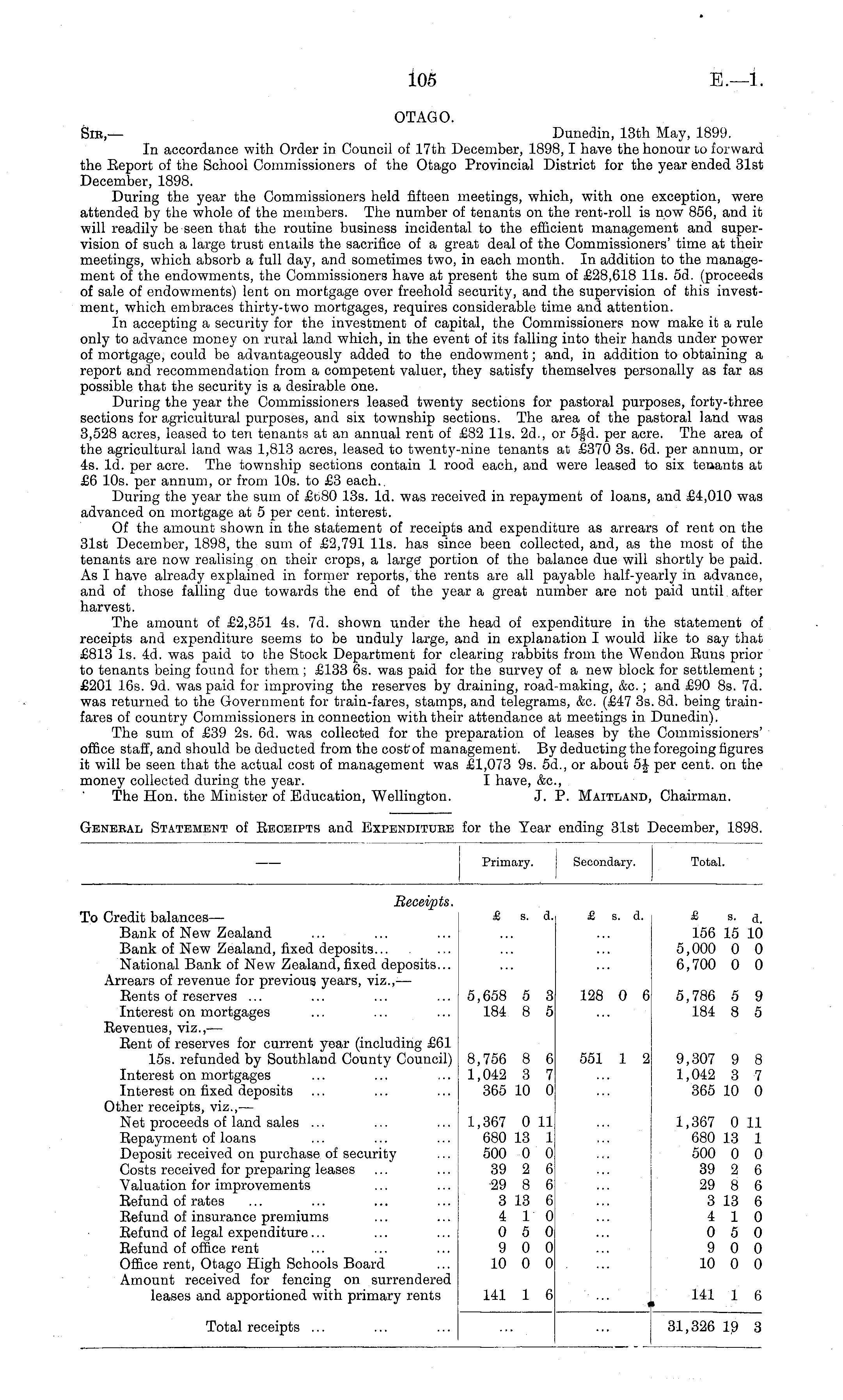 OTAGO. Sib,— Dunedin, 13th May, 1899. In accordance with Order in Council of 17th December, 1898,1 have the honour to forward the Eeport of the School Commissioners of the Otago Provincial District for the year ended 31st December, 1898. During the year the Commissioners held fifteen meetings, which, with one exception, were attended by the whole of the members. The number of tenants on the rent-roll is now 856, and it will readily be seen that the routine business incidental to the efficient management and supervision of such a large trust entails the sacrifice of a great deal of the Commissioners' time at their meetings, which absorb a full day, and sometimes two, in each month. In addition to the management of the endowments, the Commissioners have at present the sum of £28,618 lis. sd. (proceeds of sale of endowments) lent on mortgage over freehold security, and the supervision of this investment, which embraces thirty-two mortgages, requires considerable time and attention. In accepting a security for the investment of capital, the Commissioners now make it a rule only to advance money on rural land which, in the event of its falling into their hands under power of mortgage, could be advantageously added to the endowment; and, in addition to obtaining a report and recommendation from a competent valuer, they satisfy themselves personally as far as possible that the security is a desirable one. During the year the Commissioners leased twenty sections for pastoral purposes, forty-three sections for agricultural purposes, and six township sections. The area of the pastoral land was 3,528 acres, leased to ten tenants at an annual rent of £82 lis. 2d., or 5-fd. per acre. The area of the agricultural land was 1,813 acres, leased to twenty-nine tenants at £370 3s. 6d. per annum, or 4s. Id. per acre. The township sections contain 1 rood each, and were leased to six tenants at £6 10s. per annum, or from 10s. to £3 each. During the year the sum of £tBO 13s. Id. was received in repayment of loans, and £4,010 was advanced on mortgage at 5 per cent, interest. Of the amount shown in the statement of receipts and expenditure as arrears of rent on the 31st December, 1898, the sum of £2,791 lis. has since been collected, and, as the most of the tenants are now realising on their crops, a large portion of the balance due will shortly be paid. As I have already explained in former reports, the rents are all payable half-yearly in advance, and of those falling due towards the end of the year a great number are not paid until after harvest. The amount of £2,351 4s. 7d. shown under the head of expenditure in the statement of receipts and expenditure seems to be unduly large, and in explanation I would like to say that £813 Is. 4d. was paid to the Stock Department for clearing rabbits from the Wendon Buns prior to tenants being found for them; £133 6s. was paid for the survey of a new block for settlement; £201 16s. 9d. was paid for improving the reserves by draining, road-making, &c.; and £90 Bs. 7d. was returned to the Government for train-fares, stamps, and telegrams, &c. (£47 3s. Bd. being trainfares of country Commissioners in connection with their attendance at meetings in Dunedin). The sum of £39 2s. 6d. was collected for the preparation of leases by the Commissioners' office staff, and should be deducted from the cost'of management. By deducting the foregoing figures it will be seen that the actual cost of management was £1,073 9s. 5d., or about 5J per cent, on the money collected during the year. I have, &c, The Hon. the Minister of Education, Wellington. J. P. Maitland, Chairman.