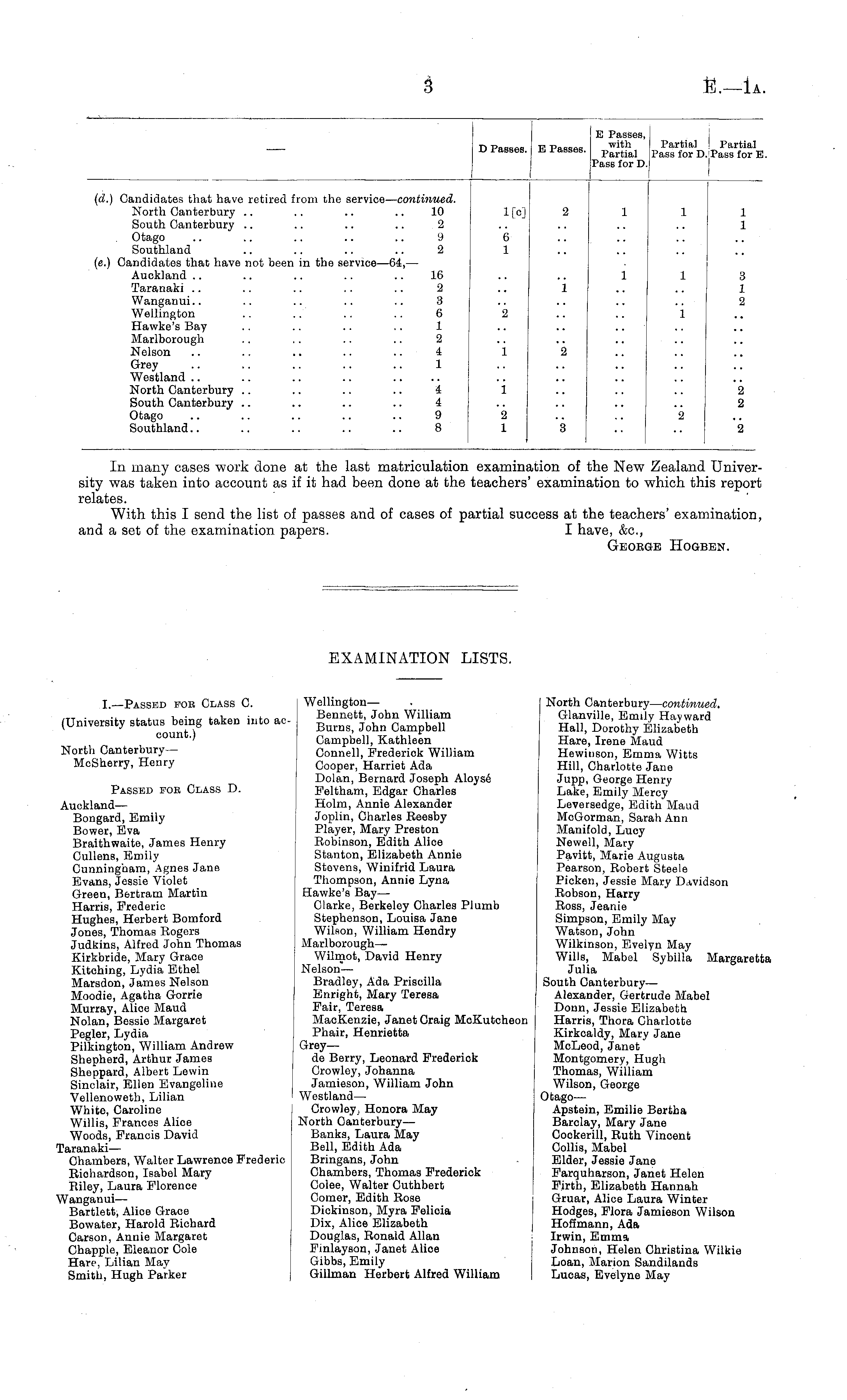 In many cases work done at the last matriculation examination of the New Zealand University was taken into account as if it had been done at the teachers' examination to which this report relates. With this I send the list of passes and of cases of partial success at the teachers' examination, and a set of the examination papers. I have, &c, Geoege Hogben.