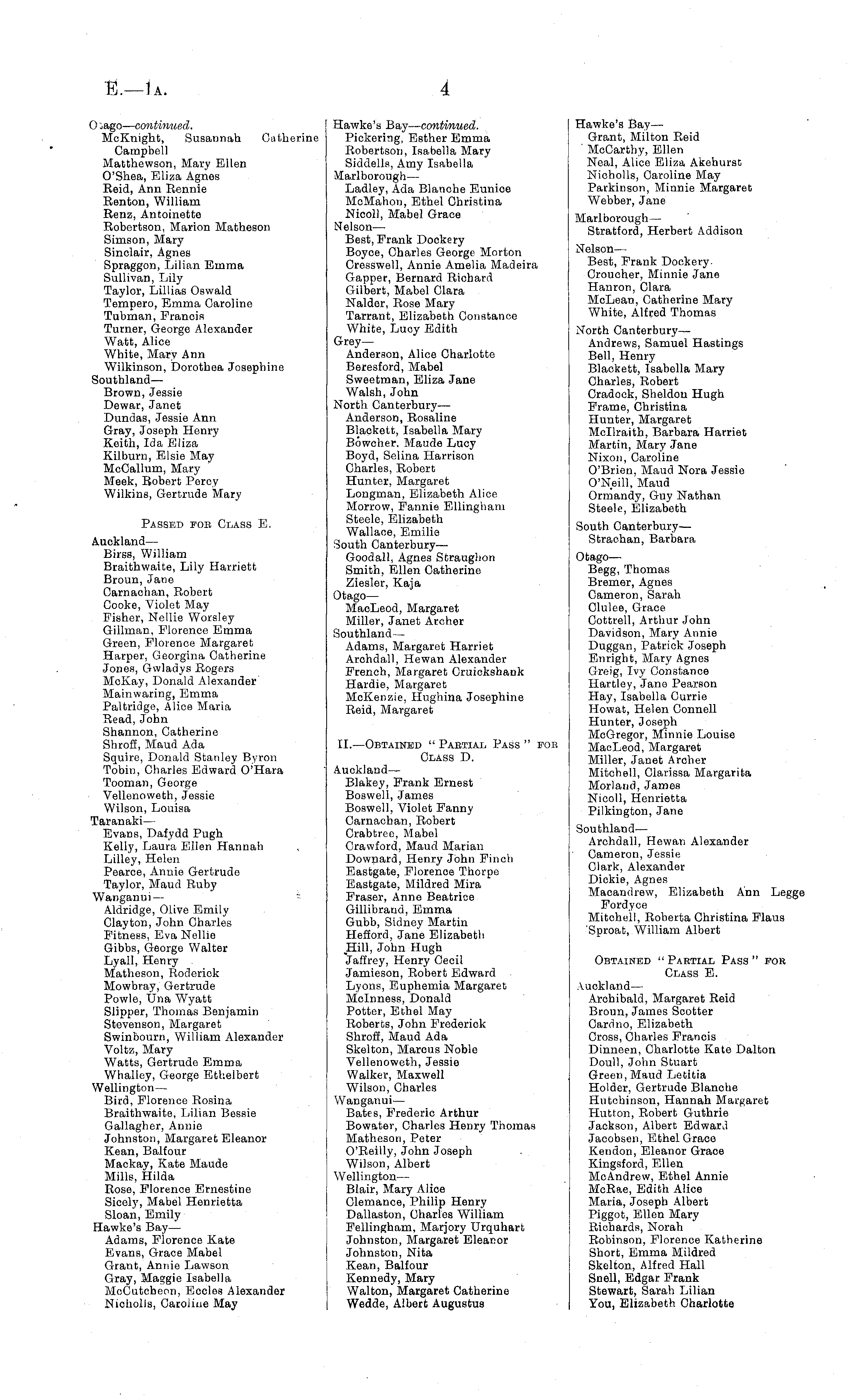 Hawke's Bay— Grant, Milton Reid McCarthy, Ellen Neal, Alice Eliza Akehurst Nicholls, Caroline May Parkinson, Minnie Margaret Webber, Jane Marlborough— Stratford, Herbert Addison Nelson— Best, Frank Dockery Croucher, Minnie Jane Hanron, Clara McLean, Catherine Mary White, Alfred Thomas North Canterbury— Andrews, Samuel Hastings Bell, Henry Blackett, Isabella Mary Charles, Robert Cradock, Sheldon Hugh Frame, Christina Hunter, Margaret Mcllraith, Barbara Harriet Martin, Mary Jane Nixon, Caroline O'Brien, Maud Nora Jessie O'Neill, Maud Ormandy, Guy Nathan Steele, Elizabeth South Canterbury— Strachan, Barbara Otago— Begg, Thomas Bremer, Agnes Cameron, Sarah Clulee, Grace Cottrell, Arthur John Davidson, Mary Annie Duggan, Patrick Joseph Enright, Mary Agnes Greig, Ivy Constance Hartley, Jane Pearson Hay, Isabella Currie Howat, Helen Conn ell Hunter, Joseph McGregor, Minnie Louise MacLeod, Margaret Miller, Janet Archer Mitchell, Clarissa Margarita Morland, James Nicoll, Henrietta Pilkington, Jane Southland — Archdall, Hewan Alexander Cameron, Jessie Clark, Alexander Dickie, Agnes Macandrew, Elizabeth Ann Legge Fordyce Mitchell, Roberta Christina Flaus 'Sproat, William Albert Obtained " Partial Pass " fob Class E. Auckland— Archibald, Margaret Reid Broun, James Scotter Cardno, Elizabeth Cross, Charles Francis Dinneen, Charlotte Kate Dalton Doull, John Stuart Green, Maud Letitia Holder, Gertrude Blanche Hutchinson, Hannah Margaret Hutton, Robert Guthrie Jackson, Albert Edward Jacobsen, Ethel Grace Kendon, Eleanor Grace Kingsford, Ellen McAndrew, Ethel Annie Mcßae, Edith Alice Maria, Joseph Albert Piggot, Ellen Mary Richards, Norah Robinson, Florence Katherine Short, Emma Mildred Skelton, Alfred Hall Snell, Edgar Frank Stewart, Sarah Lilian You, Elizabeth Charlotte