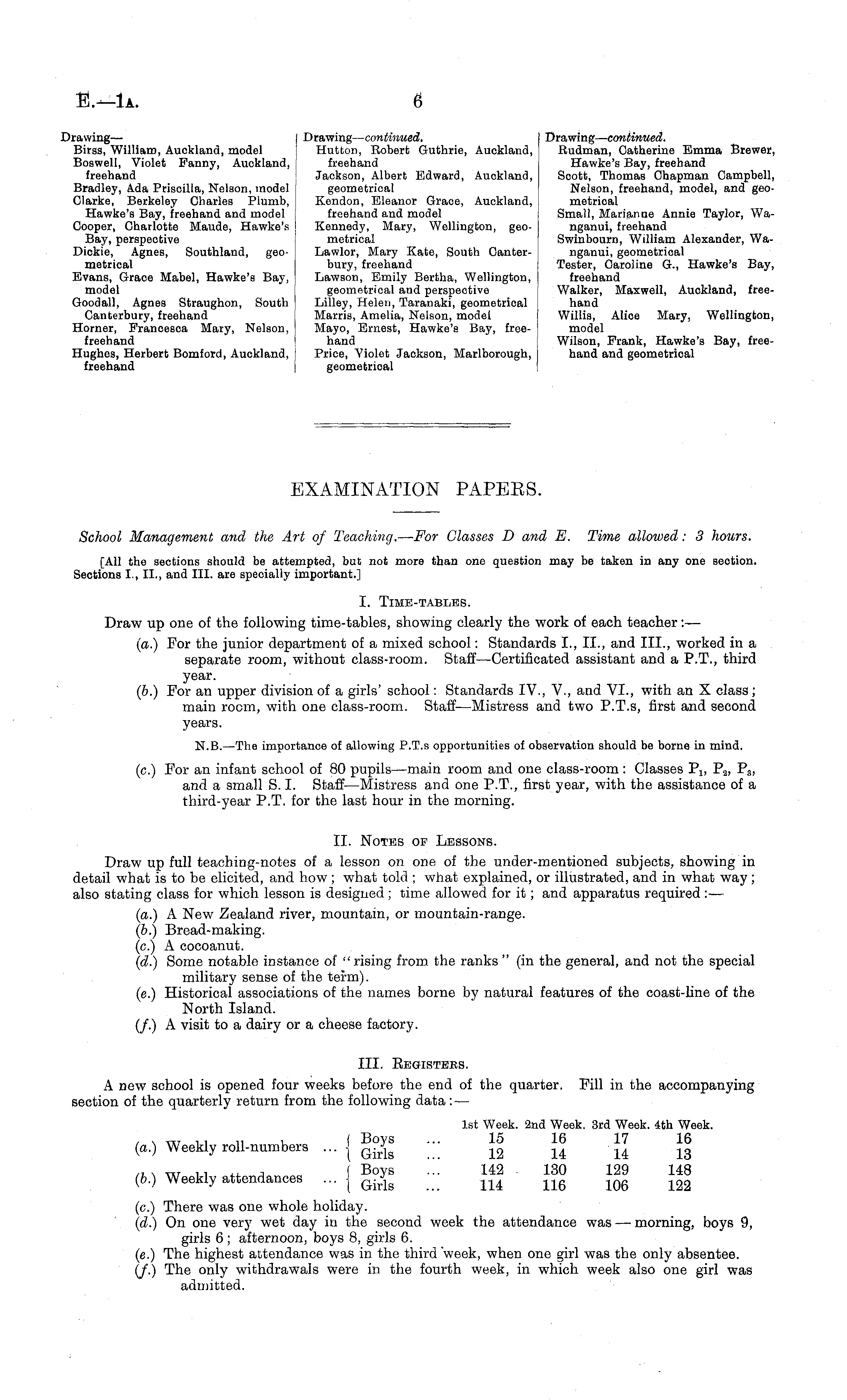 School Management and the Art of Teaching. — For Glasses D and E. Time allowed: 3 hours. [All the sections should be attempted, but not more than one question may be taken in any one seotion. Seotions 1., 11., and 111. are specially important.] I. Time-tables. Draw up one of the following time-tables, showing clearly the work of each teacher:— (a.) For the junior department of a mixed school: Standards 1., 11., and 111., worked in a separate room, without class-room. Staff—Certificated assistant and a P.T., third year. (6.) For an upper division of a girls' school: Standards IV., V., and VI., with an X class; main room, with one class-room. Staff—Mistress and two P.T.s, first and second years. N.B. —The importance of allowing P.T.s opportunities of observation should be borne in mind. (c.) For an infant school of 80 pupils —main room and one class-room: Classes P 1; P 2 , P 3 , and a small S. I. Staff—Mistress and one P.T., first year, with the assistance of a third-year P.T. for the last hour in the morning. 11. Notes of Lessons. Draw up full teaching-notes of a lesson on one of the under-mentioned subjects, showing in detail what is to be elicited, and how ; what told ; what explained, or illustrated, and in what way; also stating class for which lesson is designed ; time allowed for it; and apparatus required :— (a.) A New Zealand river, mountain, or mountain-range. (b.) Bread-making. (c.) A cocoanut. (d.) Some notable instance of "rising from the ranks " (in the general, and not the special military sense of the tefm). (c.) Historical associations of the names borne by natural features of the coast-line of the North Island. (/.) A visit to a dairy or a cheese factory. 111. Registebs. A new school is opened four weeks before the end of the quarter. Fill in the accompanying section of the quarterly return from the following data: — Ist Week. 2nd Week. 3rd Week. 4th Week. (a.) Weekly roll-numbers ... j Q 12 v J ig ~, TO n ~ , f Boys ... 142 130 129 148 (b.) Weekly attendances ... j __ m ug m m (c.) There was one whole holiday. (d.) On one very wet day in the second week the attendance was — morning, boys 9, girls 6; afternoon, boys 8, girls 6. (c.) The highest attendance was in the third 'week, when one girl was the only absentee. (/.) The only withdrawals were in the fourth week, in which week also one girl was admitted.