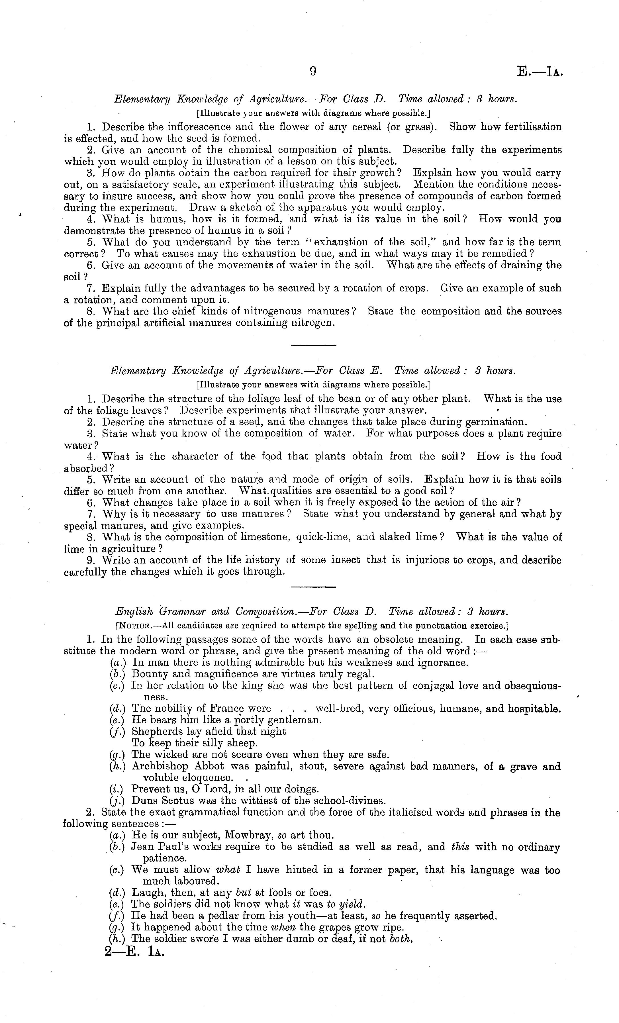 Elementary Knowledge of Agriculture. — For Glass E. Time allowed : 3 hours. [Illustrate your answers with diagrams where possible.] 1. Describe the structure of the foliage leaf of the bean or of any other plant. What is the use of the foliage leaves ? Describe experiments that illustrate your answer. 2. Describe the structure of a seed, and the changes that take place during germination. 3. State what you know of the composition of water. For what purposes does a plant require water ? 4. What is the character of the food that plants obtain from the soil? How is the food absorbed ? 5. Write an account of the nature and mode of origin of soils. Explain how it is that soils differ so much from one another. What, qualities are essential to a good soil ? 6. What changes take place in a soil when it is freely exposed to the action of the air? 7. Why is it necessary to use manures ? State what you understand by general and what by special manures, and give examples. 8. What is the composition of limestone, quick-lime, and slaked lime ? What is the value of lime in agriculture ? 9. Write an account of the life history of some insect that is injurious to crops, and describe carefully the changes which it goes through.