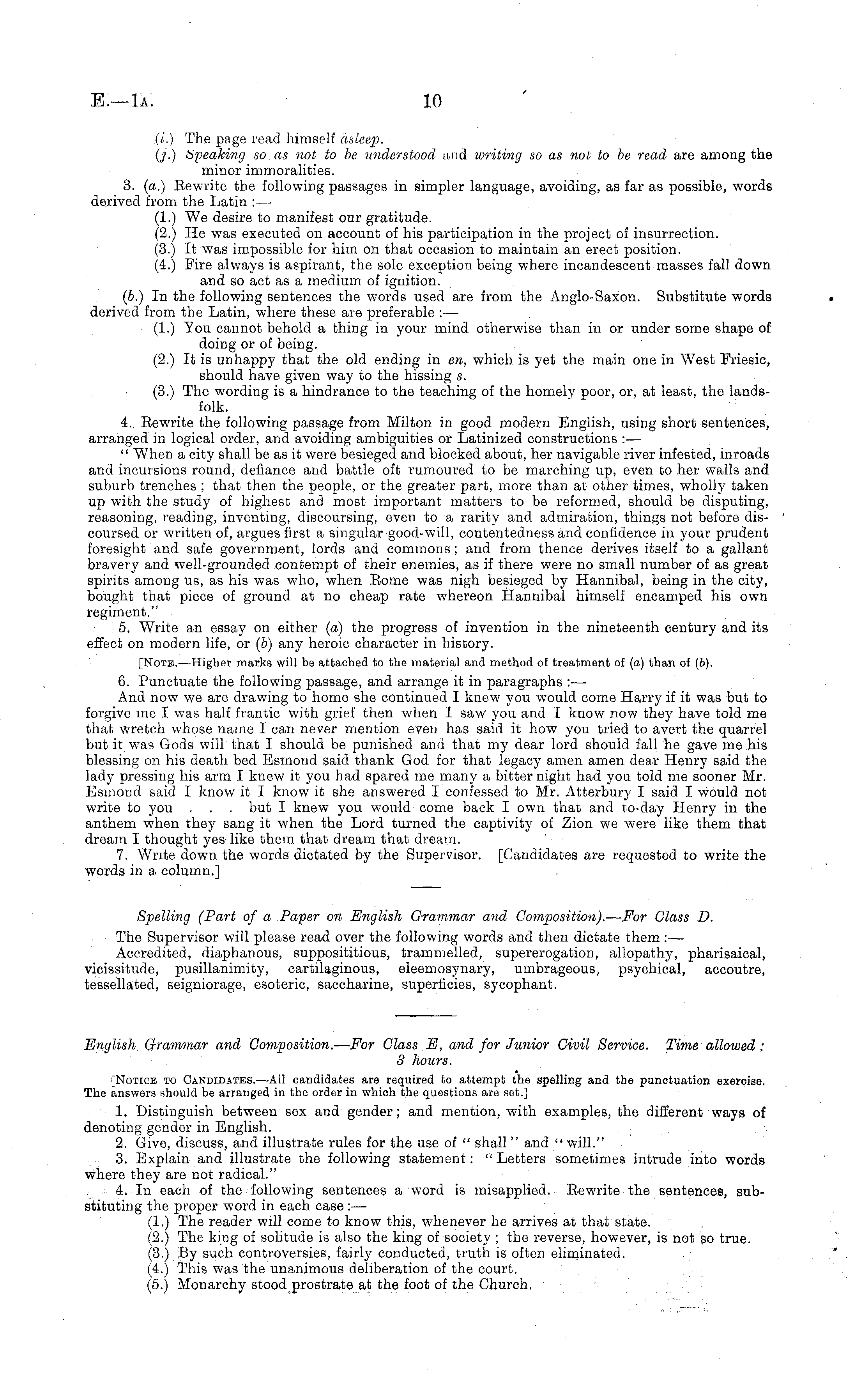 (i.) The page read himself asleep. (j.) Speaking so as not to be understood and writing so as not to be read are among the minor immoralities. 3. (a.) Eewrite the following passages in simpler language, avoiding, as far as possible, words derived from the Latin :— (1.) We desire to manifest our gratitude. (2.) He was executed on account of his participation in the project of insurrection. (3.) It was impossible for him on that occasion to maintain an erect position. (4.) Fire always is aspirant, the sole exception being where incandescent masses fall down and so act as a medium of ignition. (b.) In the following sentences the words used are from the Anglo-Saxon. Substitute words derived from the Latin, where these are preferable : — (1.) You cannot behold a thing in your mind otherwise than in or under some shape of doing or of being. (2.) It is unhappy that the old ending in en, which is yet the main one in West Friesic, should have given way to the hissing s. (3.) The wording is a hindrance to the teaching of the homely poor, or, at least, the landsfolk. 4. Eewrite the following passage from Milton in good modern English, using short sentences, arranged in logical order, and avoiding ambiguities or Latinized constructions : — " When a city shall be as it were besieged and blocked about, her navigable river infested, inroads and incursions round, defiance and battle oft rumoured to be marching up, even to her walls and suburb trenches ; that then the people, or the greater part, more than at other times, wholly taken up with the study of highest and most important matters to be reformed, should be disputing, reasoning, reading, inventing, discoursing, even to a rarity and admiration, things not before discoursed or written of, argues first a singular good-will, contentedness and confidence in your prudent foresight and safe government, lords and commons; and from thence derives itself to a gallant bravery and well-grounded contempt of their enemies, as if there were no small number of as great spirits among us, as his was who, when Eome was nigh besieged by Hannibal, being in the city, bought that piece of ground at no cheap rate whereon Hannibal himself encamped his own regiment." 5. Write an essay on either (a) the progress of invention in the nineteenth century and its effect on modern life, or (b) any heroic character in history. [Note. —Higher marks will be attached to the material and method of treatment of (a) than of (6). 6. Punctuate the following passage, and arrange it in paragraphs : — And now we are drawing to home she continued I knew you would come Harry if it was but to forgive me I was half frantic with grief then when I saw you and I know now they have told me that wretch whose name I can never mention even has said it how you tried to avert the quarrel but it was Gods will that I should be punished and that my dear lord should fall he gave me his blessing on his death bed Esmond said thank God for that legacy amen amen dea,r Henry said the lady pressing his arm I knew it you had spared me many a bitter night had you told me sooner Mr. Esmond said I know it I know it she answered I confessed to Mr. Atterbury I said I would not write to you . . . but I knew you would come back I own that and to-day Henry in the anthem when they sang it when the Lord turned the captivity of Zion we were like them that dream I thought yes like them that dream that dream. 7. Write down the words dictated by the Supervisor. [Candidates are requested to write the words in a column.]