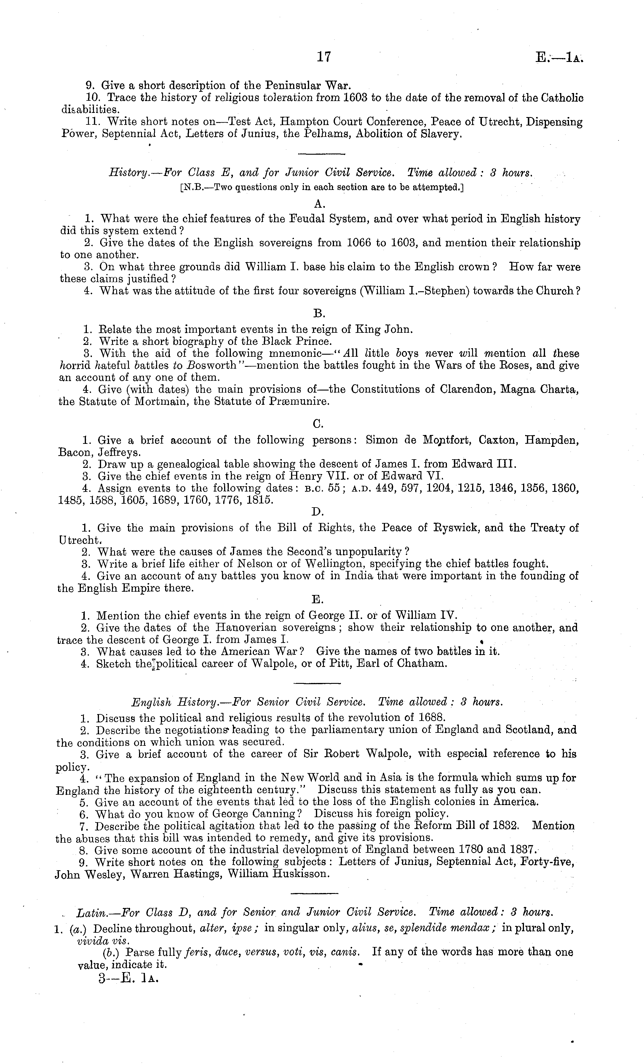History. — For Class E, and for Junior Civil Service. Time allowed : 3 hours. [N.B. —Two questions only in each section are to be attempted.] A. 1. What were the chief features of the Feudal System, and over what period in English history did this system extend ? 2. Give the dates of the English sovereigns from 1066 to 1603, and mention their relationship to one another. 3. On what three grounds did William I. base his claim to the English crown ? How far were these claims justified ? 4. What was the attitude of the first four sovereigns (William 1.-Stephen) towards the Church ? B. 1. Eelate the most important events in the reign of King John. 2. Write a short biography of the Black Prince. 3. With the aid of the following mnemonic— "All Zittle &oys wever will mention all iShese /torrid fateful battles to JBosworth"—mention the battles fought in the Wars of the Eoses, and give an account of any one of them. 4. Give (with dates) the main provisions of—the Constitutions of Clarendon, Magna Charta, the Statute of Mortmain, the Statute of Praemunire. C. 1. Give a brief account of the following persons: Simon de Mqptfort, Caxton, Hampden, Bacon, Jeffreys. 2. Draw up a genealogical table showing the descent of James I. from Edward 111. 3. Give the chief events in the reign of Henry VII. or of Edward VI. 4. Assign events to the following dates: b.c. 55; a.d. 449, 597, 1204, 1215, 1346, 1356, 1360, 1485, 1588, 1605, 1689, 1760, 1776, 1815. D. 1. Give the main provisions of the Bill of Eights, the Peace of Eyswick, and the Treaty of Utrecht. 2. What were the causes of James the Second's unpopularity ? 3. Write a brief life either of Nelson or of Wellington, specifying the chief battles fought. 4. Give an account of any battles you know of in India that were important in the founding of the English Empire there. B. 1. Mention the chief events in the reign of George 11. of of William IV. 2. Give the dates of the Hanoverian sovereigns; show their relationship to one another, and trace the descent of George I. from James I. , 3. What causes led to the American War? Give the names of two battles in it. 4. Sketch thejpolitical career of Walpole, or of Pitt, Earl of Chatham.