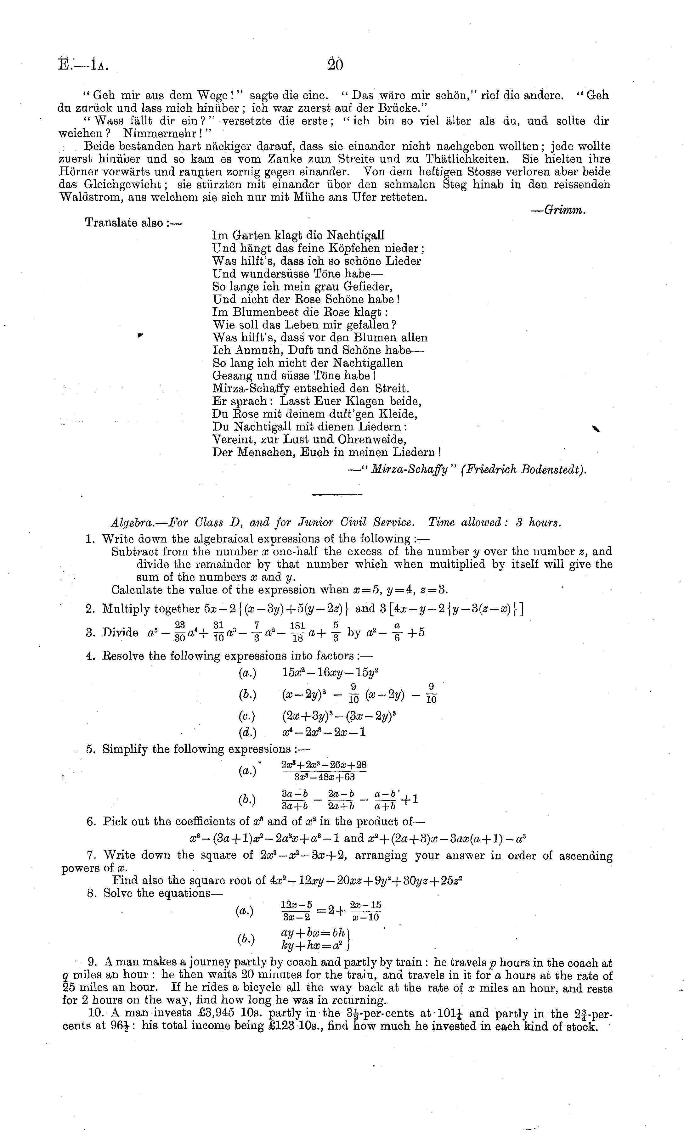 Algebra. — For Glass D, and for Junior Civil Service. Time allowed: 3 hours. 1. Write down the algebraical expressions of the following : — Subtract from the number x one-half the excess of the number y over the number z, and divide the remainder by that number which when multiplied by itself will give the sum of the numbers x and y. Calculate the value of the expression when x=s, y = i, z = 3. 2. Multiply together sa-2{(rr-3?/) + s(y-20)} and 3 [ix-y-2{y-3(z-x)\] a TV "J 5 23 4I 31 3 7 2 181 , 5 1 2 a, X 3. Divide a 6 — *+ j^a — j« — a+ -g- by a 2 — -g- +5 4. Eesolve the following expressions into factors: — (a.) 15a; 2 — Wxy — 15y 2 (b.) (x-2yf -^ {x -2y)-^ (c.) (2x+3y) 3 -(3x~2yY (d.) x i -2x s -2x-l 5. Simplify the following expressions : — , >* 2x 3 +2x i -26x+28 \ a '> 3;z s -48:r,+63 ,-,■. 3a — b_2a — b_a—b'.-, *>■ ' Sa+"b 2a + b a+b + 6. Pick out the coefficients of x s and of * 2 in the product of— a; 3 -(3a+L> 2 -2a 2 a:+a 3 -l and x i +(2a+3)x~3ax(a+l) -a 3 7. Write down the square of 2x s —x 2 — 3x+2, arranging your answer in order of ascending powers of x. Find also the square root of — 20xz-\-9y 2 -j-30yz-\-25z 2 8. Solve the equations— //v \ 12rc — 5 c) I2x— 15 (°-> ~ A+ 7^lo (I) ay+bx=bh\ ■' ky +hx= a 2 J 9. A man makes a journey partly by coach and partly by train : he travels p hours in the coach at q miles an hour : he then waits 20 minutes for the train, and travels in it for a hours at the rate of 25 miles an hour. If he rides a bicycle all the way back at the rate of x miles an hour, and rests for 2 hours on the way, find how long he was in returning. 10. A man invests £3,945 10s. partly in the at 101J and partly in the 2f-per-cents at 96J: his total income being £123 10s., find how much he invested in each kind of stock.