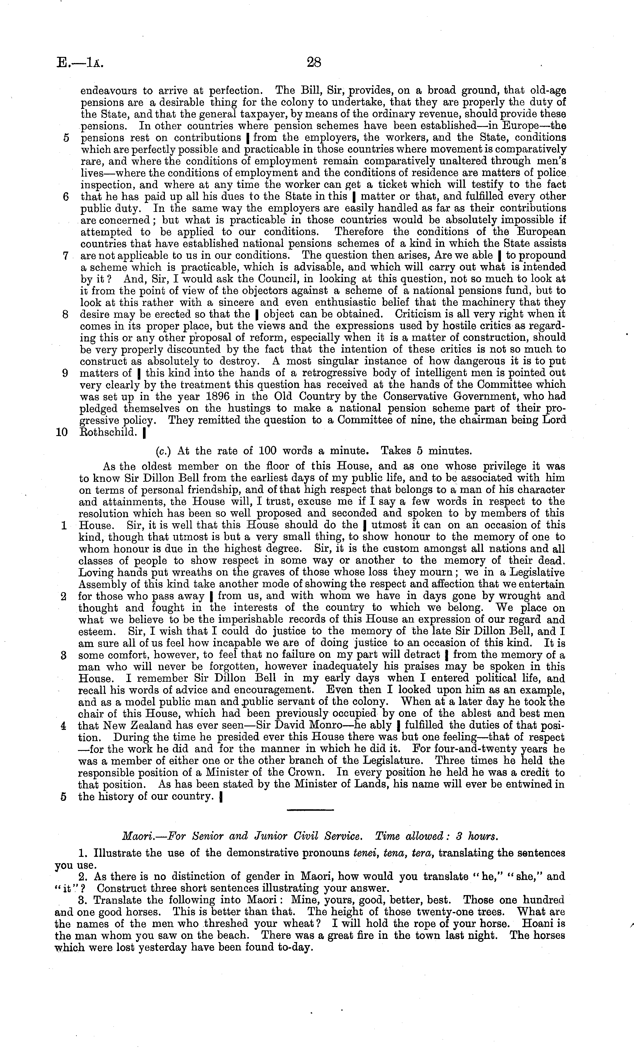 endeavours to arrive at perfection. The Bill, Sir, provides, on a broad ground, that old-age pensions are a desirable thing for the colony to undertake, that they are properly the duty of the State, and that the general taxpayer, by means of the ordinary revenue, should provide these pensions. In other countries where pension schemes have been established—in Europe—-the 5 pensions rest on contributions | from the employers, the workers, and the State, conditions which are perfectly possible and practicable in those countries where movement is comparativelyrare, and where the conditions of employment remain comparatively unaltered through men's lives—where the conditions of employment and the conditions of residence are matters of police inspection, and where at any time the worker can get a ticket which will testify to the fact 6 that he has paid up all his dues to the State in this | matter or that, and fulfilled every other public duty. In the same way the employers are easily handled as far as their contributions are concerned; but what is practicable in those countries would be absolutely impossible if attempted to be applied to our conditions. Therefore the conditions of the European countries that have established national pensions schemes of a kind in which the State assists 7 are not applicable to us in our conditions. The question then arises, Are we able |to propound a scheme which is practicable, which is advisable, and which will carry out what is intended by it ? And, Sir, I would ask the Council, in looking at this question, not so much to look at it from the point of view of the objectors against a scheme of a national pensions fund, but to look at this rather with a sincere and even enthusiastic belief that the machinery that they 8 desire may be erected so that the ) object can be obtained. Criticism is all very right when it comes in its proper place, but the views and the expressions used by hostile critics as regarding this or any other proposal of reform, especially when it is a matter of construction, should be very properly discounted by the fact that the intention of these critics is not so much to construct as absolutely to destroy. A most singular instance of how dangerous it is to put 9 matters of | this kind into the hands of a retrogressive body of intelligent men is pointed out very clearly by the treatment this question has received at the hands of the Committee which was set up in the year 1896 in the Old Country by the Conservative Government, who had pledged themselves on the hustings to make a national pension scheme part of their progressive policy. They remitted the question to a Committee of nine, the chairman being Lord 10 Eothschild. | (c.) At the rate of 100 words a minute. Takes 5 minutes. As the oldest member on the floor of this House, and as one whose privilege it was to know Sir Dillon Bell from the earliest days of my public life, and to be associated with him on terms of personal friendship, and of that high respect that belongs to a man of his character and attainments, the House will, I trust, excuse me if I say a few words in respect to the resolution which has been so well proposed and seconded and spoken to by members of this 1 House. Sir, it is well that this House should do the | utmost it can on an occasion of this kind, though that utmost is but a very small thing, to show honour to the memory of one to whom honour is due in the highest degree. Sir, it is the custom amongst all nations and all classes of people to show respect in some way or another to the memory of their dead. Loving hands put wreaths on the graves of those whose loss they mourn; we in a Legislative Assembly of this kind take another mode of showing the respect and affection that we entertain 2 for those who pass away | from us, and with whom we have in days gone by wrought and thought and fought in the interests of the country to which we belong. We place on what we believe to be the imperishable records of this House an expression of our regard and esteem. Sir, I wish that I could do justice to the memory of the late Sir Dillon Bell, and I am sure all of us feel how incapable we are of doing justice to an occasion of this kind. It is 3 some comfort, however, to feel that no failure on my part will detract | from the memory of a man who will never be forgotten, however inadequately his praises may be spoken in this House. I remember Sir Dillon Bell in my early days when I entered political life, and recall his words of advice and encouragement. Even then I looked upon him as an example, and as a model public man and .public servant of the colony. When at a later day he took the chair of this House, which had been previously occupied by one of the ablest and best men 4 that New Zealand has ever seen—Sir David Monro—he ably | fulfilled the duties of that position. During the time he presided ever this House there was but one feeling—that of respect —for the work he did and for the manner in which he did it. For four-and-twenty years he was a member of either one or the other branch of the Legislature. Three times he held the responsible position of a Minister of the Crown. In every position he held he was a credit to that position. As has been stated by the Minister of Lands, his name will ever be entwined in 5 the history of our country. |