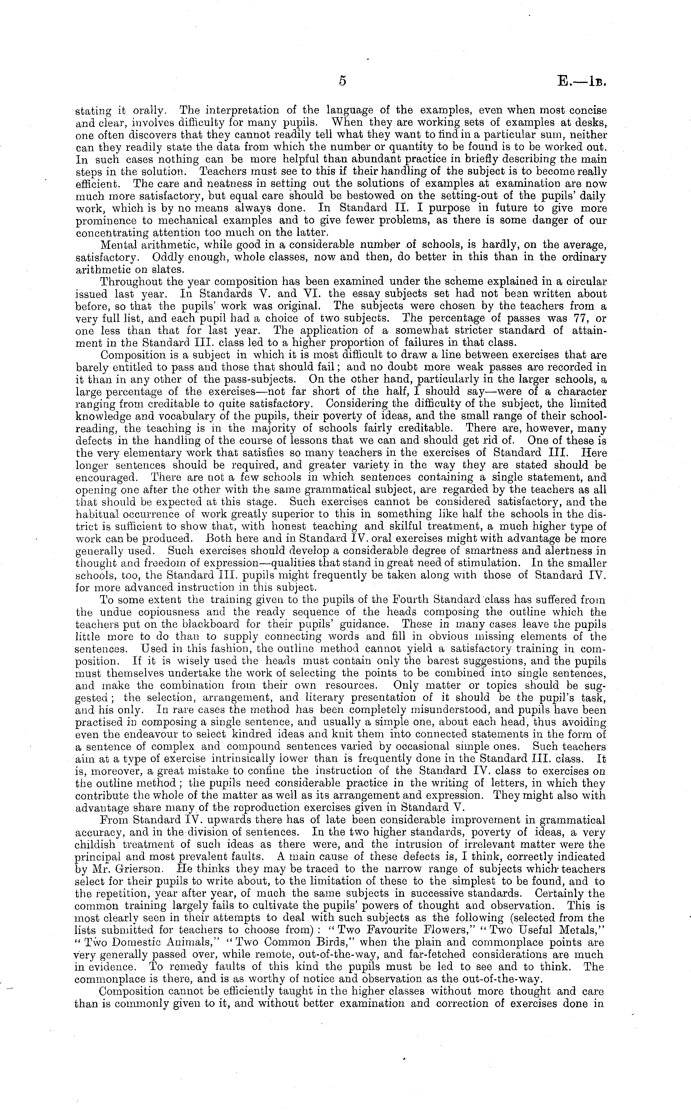 stating it orally. The interpretation of the language of the examples, even when most concise and clear, involves difficulty for many pupils. When they are working sets of examples at desks, one often discovers that they cannot readily tell what they want to find in a particular sum, neither can they readily state the data from which the number or quantity to be found is to be worked out. In such cases nothing can be more helpful than abundant practice in briefly describing the main steps in the solution. Teachers must see to this if their handling of the subject is to become really efficient. The care and neatness in setting out the solutions of examples at examination are now much more satisfactory, but equal care should be bestowed on the setting-out of the pupils' daily work, which is by no means always done. In Standard 11. I purpose in future to give more prominence to mechanical examples and to give fewer problems, as there is some danger of our concentrating attention too much on the latter. Mental arithmetic, while good in a considerable number of schools, is hardly, on the average, satisfactory. Oddly enough, whole classes, now and then, do better in this than in the ordinary arithmetic on slates. Throughout the year composition has been examined under the scheme explained in a circular issued last year. In Standards V. and VI. the essay subjects set had not been written about before, so that the pupils' work was original. The subjects were chosen by the teachers from a very full list, and each pupil had a choice of two subjects. The percentage of passes was 77, or one less than that for last year. The application of a somewhat stricter standard of attainment in the Standard 111. class led to a higher proportion of failures in that class. Composition is a subject in which it is most difficult to draw a line between exercises that are barely entitled to pass and those that should fail; and no doubt more weak passes are recorded in it than in any other of the pass-subjects. On the other hand, particularly in the larger schools, a large percentage of the exercises—not far short of the half, I should say—were of a character ranging from creditable to quite satisfactory. Considering the difficulty of the subject, the limited knowledge and vocabulary of the pupils, their poverty of ideas, and the small range of their schoolreading, the teaching is in the majority of schools fairly creditable. There are, however, many defects in the handling of the course of lessons that we can and should get rid of. One of these is the very elementary work that satisfies so many teachers in the exercises of Standard 111. Here longer sentences should be required, and greater variety in the way they are stated should be encouraged. There are not a few schools in which sentences containing a single statement, and opening one after the other with the same grammatical subject, are regarded by the teachers as all that should be expected at this stage. Such exercises cannot be considered satisfactory, and the habitual occurrence of work greatly superior to this in something like half the schools in the district is sufficient to show that, with honest teaching and skilful treatment, a much higher type of work can be produced. Both here and in Standard IV. oral exercises might with advantage be more generally used. Such exercises should develop a considerable degree of smartness and alertness in thought and freedom of expression—qualities that stand in great need of stimulation. In the smaller schools, too, the Standard 111. pupils might frequently be taken along with those of Standard IV. for more advanced instruction in this subject. To some extent the training given to the pupils of the Fourth Standard class has suffered from the undue copiousness and the ready sequence of the heads composing the outline which the teachers put on the blackboard for their pupils' guidance. These in many cases leave the pupils little more to do than to supply connecting words and fill in obvious missing elements of the sentences. Used in this fashion, the outline method cannot yield a satisfactory training in composition. If it is wisely used the heads must contain only the barest suggestions, and the pupils must themselves undertake the work of selecting the points to be combined into single sentences, and make the combination from their own resources. Only matter or topics should be suggested; the selection, arrangement, and literary presentation of it should be the pupil's task, and his only. In rare cases the method has been completely misunderstood, and pupils have been practised in composing a single sentence, and usually a simple one, about each head, thus avoiding even the endeavour to select kindred ideas and knit them into connected statements in the form of a sentence of complex and compound sentences varied by occasional simple ones. Such teachers aim at a type of exercise intrinsically lower than is frequently done in the Standard 111. class. It is, moreover, a great mistake to confine the instruction of the Standard IV. class to exercises on the outline method ; the pupils need considerable practice in the writing of letters, in which they contribute the whole of the matter as well as its arrangement and expression. They might also with advantage share many of the reproduction exercises given in Standard V. From Standard IV. upwards there has of late been considerable improvement in grammatical accuracy, and in the division of sentences. In the two higher standards, poverty of ideas, a very childish treatment of such ideas as there were, and the intrusion of irrelevant matter were the principal and most prevalent faults. A main cause of these defects is, I think, correctly indicated by Mr. Grierson. He thinks they may be traced to the narrow range of subjects which teachers select for their pupils to write about, to the limitation of these to the simplest to be found, and to the repetition, year after yea