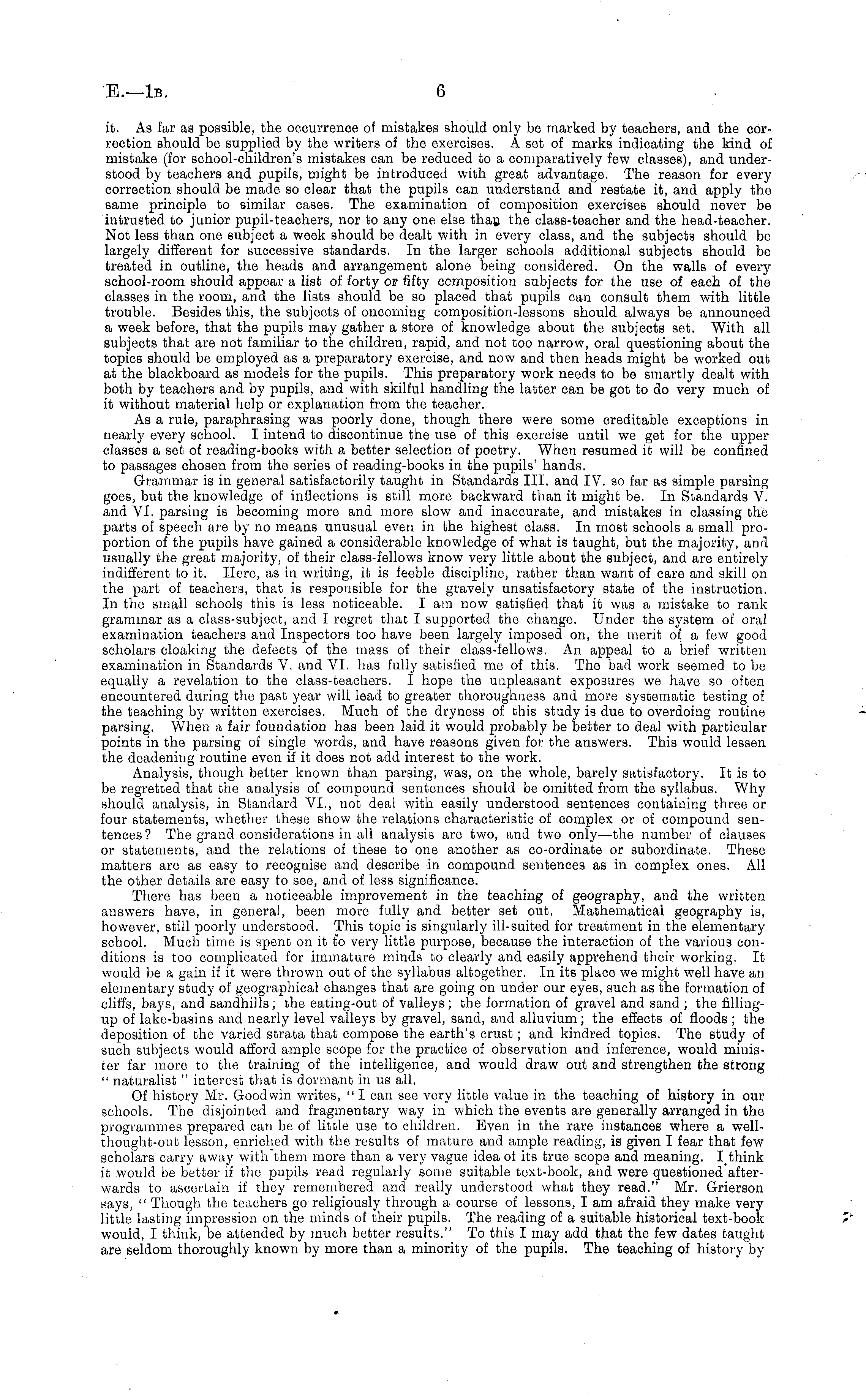 it. As far as possible, the occurrence of mistakes should only be marked by teachers, and the correction should be supplied by the writers of the exercises. A set of marks indicating the kind of mistake (for school-children's mistakes can be reduced to a comparatively few classes), and understood by teachers and pupils, might be introduced with great advantage. The reason for every correction should be made so clear that the pupils can understand and restate it, and apply the same principle to similar cases. The examination of composition exercises should never be intrusted to junior pupil-teachers, nor to any one else thao the class-teacher and the head-teacher. Not less than one subject a week should be dealt with in every class, and the subjects should be largely different for successive standards. In the larger schools additional subjects should be treated in outline, the heads and arrangement alone being considered. On the walls of every school-room should appear a list of forty or fifty composition subjects for the use of each of the classes in the room, and the lists should be so placed that pupils can consult them with little trouble. Besides this, the subjects of oncoming composition-lessons should always be announced a week before, that the pupils may gather a store of knowledge about the subjects set. With all subjects that are not familiar to the children, rapid, and not too narrow, oral questioning about the topics should be employed as a preparatory exercise, and now and then heads might be worked out at the blackboard as models for the pupils. This preparatory work needs to be smartly dealt with both by teachers and by pupils, and with skilful handling the latter can be got to do very much of it without material help or explanation from the teacher. As a rule, paraphrasing was poorly done, though there were some creditable exceptions in nearly every school. I intend to discontinue the use of this exercise until we get for the upper classes a set of reading-books with a better selection of poetry. When resumed it will be confined to passages chosen from the series of reading-books in the pupils' hands. Grammar is in general satisfactorily taught in Standards 111. and IV. so far as simple parsing goes, but the knowledge of inflections is still more backward than it might be. In Standards V. and VI. parsing is becoming more and more slow and inaccurate, and mistakes in classing the parts of speech are by no means unusual even in the highest class. In most schools a small proportion of the pupils have gained a considerable knowledge of what is taught, but the majority, and usually the great majority, of their class-fellows know very little about the subject, and are entirely indifferent to it. Here, as in writing, it is feeble discipline, rather than want of care and skill on the part of teachers, that is responsible for the gravely unsatisfactory state of the instruction. In the small schools this is less noticeable. I am now satisfied that it was a mistake to rank grammar as a class-subject, and I regret that I supported the change. Under the system of oral examination teachers and Inspectors too have been largely imposed on, the merit of a few good scholars cloaking the defects of the mass of their class-fellows. An appeal to a brief written examination in Standards V. and VI. has fully satisfied me of this. The bad work seemed to be equally a revelation to the class-teachers. I hope the unpleasant exposures we have so often encountered during the past year will lead to greater thoroughness and more systematic testing of the teaching by written exercises. Much of the dryness of this study is due to overdoing routine parsing. When a fair foundation has been laid it would probably be better to deal with particular points in the parsing of single words, and have reasons given for the answers. This would lessen the deadening routine even if it does not add interest to the work. Analysis, though better known than parsing, was, on the whole, barely satisfactory. It is to be regretted that the analysis of compound sentences should be omitted from the syllabus. Why should analysis, in Standard VI., not deal with easily understood sentences containing three or four statements, whether these show the relations characteristic of complex or of compound sentences? The grand considerations in all analysis are two, and two only—the number of clauses or statements, and the relations of these to one another as co-ordinate or subordinate. These matters are as easy to recognise and describe in compound sentences as in complex ones. All the other details are easy to see, and of less significance. There has been a noticeable improvement in the teaching of geography, and the written answers have, in general, been more fully and better set out. Mathematical geography is, however, still poorly understood. This topic is singularly ill-suited for treatment in the elementary school. Much time is spent on it to very little purpose, because the interaction of the various conditions is too complicated for immature minds to clearly and easily apprehend their working. It would be a gain if it were thrown out of the syllabus altogether. In its place we might well have an elementary study of geographical changes that are going on under our eyes, such as the formation of cliffs, bays, and sandhills; the eating-out of valleys; the formation of gravel and sand ; the fillingup of lake-basins and nearly level valleys by gravel, sand, and alluvium; the effects of floods ; the deposition of the varied strata that compose the earth's crust; and kindred topics. The study of such subjects would afford ample scope for the practice of observation and inference, would minister far more to the training of the intelligence, and would draw out and strengthen the strong " naturalist " interest that is dormant in us all. Of history Mr. Goodwin writes, " I can see very little value in the teaching of history in our schools.