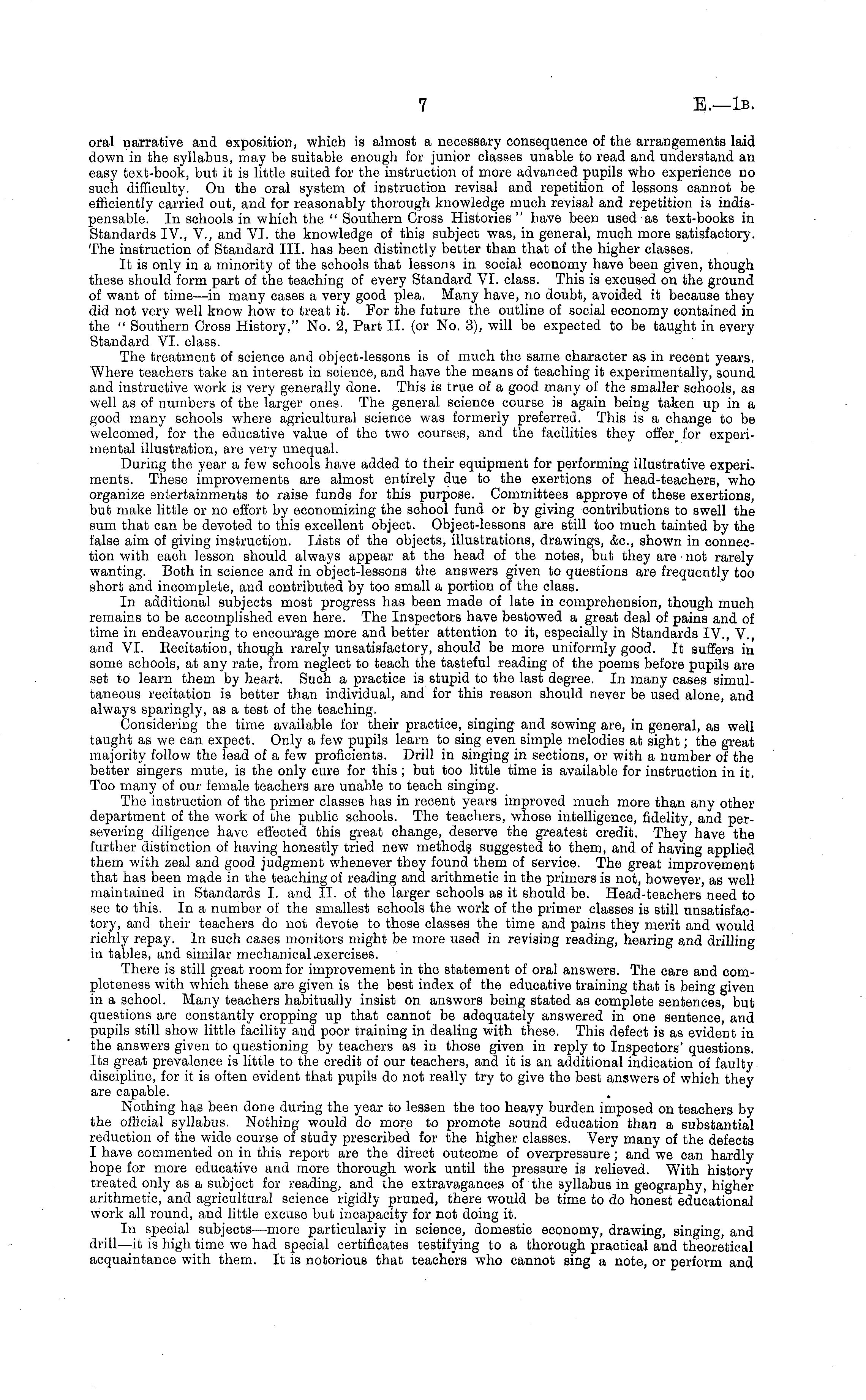 oral narrative and exposition, which is almost a necessary consequence of the arrangements laid down in the syllabus, may be suitable enough for junior classes unable to read and understand an easy text-book, but it is little suited for the instruction of more advanced pupils who experience no such difficulty. On the oral system of instruction revisal and repetition of lessons cannot be efficiently carried out, and for reasonably thorough knowledge much revisal and repetition is indispensable. In schools in which the " Southern Cross Histories " have been used as text-books in Standards IV., V., and VI. the knowledge of this subject was, in general, much more satisfactory. The instruction of Standard 111. has been distinctly better than that of the higher classes. It is only in a minority of the schools that lessons in social economy have been given, though these should form part of the teaching of every Standard VI. class. This is excused on the ground of want of time—in many cases a very good plea. Many have, no doubt, avoided it because they did not very well know how to treat it. For the future the outline of social economy contained in the " Southern Cross History," No. 2, Part 11. (or No. 3), will be expected to be taught in every Standard VI. class. The treatment of science and object-lessons is of much the same character as in recent years. Where teachers take an interest in science, and have the means of teaching it experimentally, sound and instructive work is very generally done. This is true of a good many of the smaller schools, as well as of numbers of the larger ones. The general science course is again being taken up in a good many schools where agricultural science was formerly preferred. This is a change to be welcomed, for the educative value of the two courses, and the facilities they offer_ for experimental illustration, are very unequal. During the year a few schools have added to their equipment for performing illustrative experiments. These improvements are almost entirely due to the exertions of head-teachers, who organize entertainments to raise funds for this purpose. Committees approve of these exertions, but make little or no effort by economizing the school fund or by giving contributions to swell the sum that can be devoted to this excellent object. Object-lessons are still too much tainted by the false aim of giving instruction. Lists of the objects, illustrations, drawings, &c, shown in connection with each lesson should always appear at the head of the notes, but they are ■ not rarely wanting. Both in science and in object-lessons the answers given to questions are frequently too short and incomplete, and contributed by too small a portion of the class. In additional subjects most progress has been made of late in comprehension, though much remains to be accomplished even here. The Inspectors have bestowed a great deal of pains and of time in endeavouring to encourage more and better attention to it, especially in Standards IV., V., and VI. Becitation, though rarely unsatisfactory, should be more uniformly good. It suffers in some schools, at any rate, from neglect to teach the tasteful reading of the poems before pupils are set to learn them by heart. Such a practice is stupid to the last degree. In many cases simultaneous recitation is better than individual, and for this reason should never be used alone, and always sparingly, as a test of the teaching. Considering the time available for their practice, singing and sewing are, in general, as well taught as we can expect. Only a few pupils learn to sing even simple melodies at sight; the great majority follow the lead of a few proficients. Drill in singing in sections, or with a number of the better singers mute, is the only cure for this; but too little time is available for instruction in it. Too many of our female teachers are unable to teach singing. The instruction of the primer classes has in recent years improved much more than any other department of the work of the public schools. The teachers, whose intelligence, fidelity, and persevering diligence have effected this great change, deserve the greatest credit. They have the further distinction of having honestly tried new methods suggested to them, and of having applied them with zeal and good judgment whenever they found them of Service. The great improvement that has been made in the teaching of reading and arithmetic in the primers is not, however, as well maintained in Standards I. and 11. of the larger schools as it should be. Head-teachers need to see to this. In a number of the smallest schools the work of the primer classes is still unsatisfactory, and their teachers do not devote to these classes the time and pains they merit and would richly repay. In such cases monitors might be more used in revising reading, hearing and drilling in tables, and similar mechanical .exercises. There is still great room for improvement in the statement of oral answers. The care and completeness with which these are given is the best index of the educative training that is being given in a school. Many teachers habitually insist on answers being stated as complete sentences, but questions are constantly cropping up that cannot be adequately answered in one sentence, and pupils still show little facility and poor training in dealing with these. This defect is as evident in the answers given to questioning by teachers as in those given in reply to Inspectors' questions. Its great prevalence is little to the credit of our teachers, ana it is an additional indication of faulty discipline, for it is often evident that pupils do not really try to give the best answers of which they are capable. Nothing has been done during the year to lessen the too heavy burden imposed on teachers by the official syllabus. Nothing would do more to promote sound education than a substantial reduction of the wide course of study prescribed for the higher classes. Very many