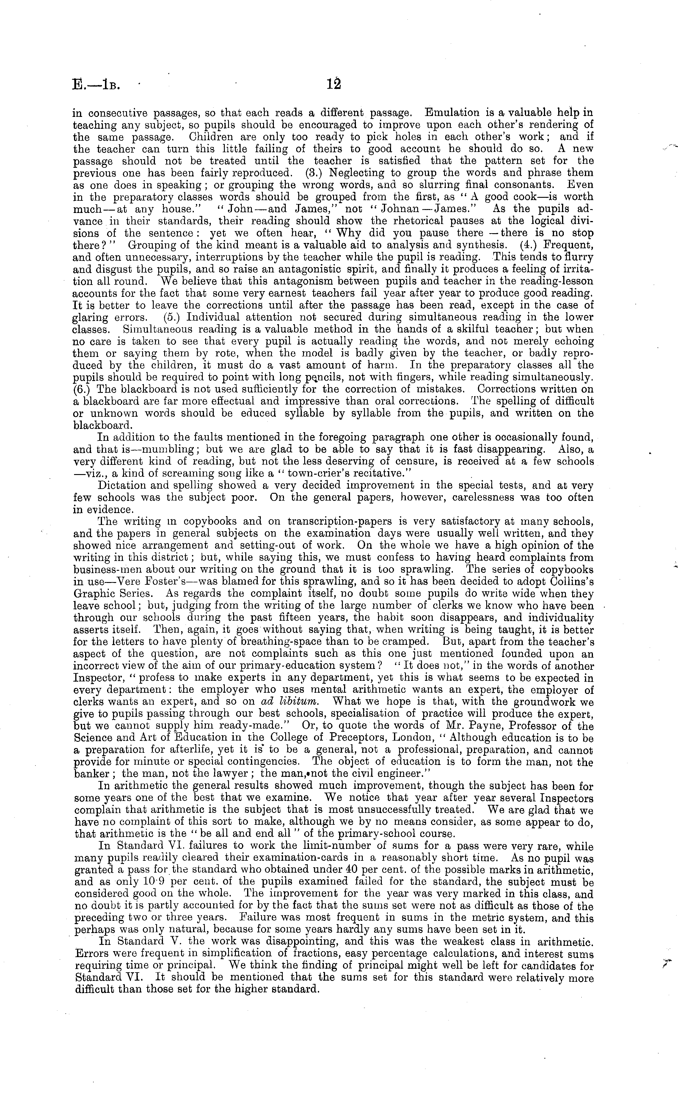 in consecutive passages, so that each reads a different passage. Emulation is a valuable help in teaching any subject, so pupils should be encouraged to improve upon each other's rendering of the same passage. Children are only too ready to pick holes in each other's work; and if the teacher can turn this little failing of theirs to good account he should do so. A new passage should not be treated until the teacher is satisfied that the pattern set for the previous one has been fairly reproduced. (3.) Neglecting to group the words and phrase them as one does in speaking ; or grouping the wrong words, and so slurring final consonants. Even in the preparatory classes words should be grouped from the first, as " A good cook—is worth much—at any house." "John—and James," not " Johnan —James." As the pupils advance in their standards, their reading should show the rhetorical pauses at the logical divisions of the sentence: yet we often hear, '' Why did you pause there — there is no stop there? " Grouping of the kind meant is a valuable aid to analysis and synthesis. (4.) Frequent, and often unnecessary, interruptions by the teacher while the pupil is reading. This tends to flurry and disgust the pupils, and so raise an antagonistic spirit, and finally it produces a feeling of irritation all round. We believe that this antagonism between pupils and teacher in the reading-lesson accounts for the fact that some very earnest teachers fail year after year to produce good reading. It is better to leave the corrections until after the passage has been read, except in the case of glaring errors. (5.) Individual attention not secured during simultaneous reading in the lower classes. Simultaneous reading is a valuable method in the hands of a skilful teacher; but when no care is taken to see that every pupil is actually reading the words, and not merely echoing them or saying them by rote, when the model is badly given by the teacher, or badly reproduced by the children, it must do a vast amount of harm. In the preparatory classes all the pupils should be required to point with long pencils, not with fingers, while reading simultaneously. (6.) The blackboard is not used sufficiently for the correction of mistakes. Corrections written on a blackboard are far more effectual and impressive than oral corrections. The spelling of difficult or unknown words should be educed syllable by syllable from the pupils, and written on the blackboard. In addition to the faults mentioned in the foregoing paragraph one other is occasionally found, and that is—mumbling; but we are glad to be able to say that it is fast disappearing. Also, a very different kind of reading, but not the less deserving of censure, is received at a few schools —viz., a kind of screaming song like a " town-crier's recitative." Dictation and spelling showed a very decided improvement in the special tests, and at very few schools was the subject poor. On the general papers, however, carelessness was too often in evidence. The writing in copybooks and on transcription-papers is very satisfactory at many schools, and the papers in general subjects on the examination days were usually well written, and they showed nice arrangement and setting-out of work. On the whole we have a high opinion of the writing in this district; but, while saying this, we must confess to having heard complaints from business-men about our writing on the ground that it is too sprawling. The series of copybooks in use —Vere Foster's —was blamed for this sprawling, and so it has been decided to adopt Collins's Graphic Series. As regards the complaint itself, no doubt some pupils do write wide when they leave school; but, judging from the writing of the large number of clerks we know who have been through our schools during the past fifteen years, the habit soon disappears, and individuality asserts itself. Then, again, it goes without saying that, when writing is being taught, it is better for the letters to have plenty of breathing-space than to be cramped. But, apart from the teacher's aspect of the question, are not complaints such as this one just mentioned founded upon an incorrect view of the aim of our primary-education system? "It does not," in the words of another Inspector, " profess to make experts in any department, yet this is what seems to be expected in every department: the employer who uses mental arithmetic wants an expert, the employer of clerks wants an expert, and so on ad libitum. What we hope is that, with the groundwork we give to pupils passing through our best schools, specialisation of practice will produce the expert, but we cannot supply him ready-made." Or, to quote the words of Mr. Payne, Professor of the Science and Art of Education in the College of Preceptors, London, " Although education is to be a preparation for afterlife, yet it is" to be a general, not a professional, preparation, and cannot provide for minute or special contingencies. The object of education is to form the man, not the Danker ; the man, not the lawyer ; the man,«not the civil engineer." In arithmetic the general results showed much improvement, though the subject has been for some years one of the best that we examine. We notice that year after year several Inspectors complain that arithmetic is the subject that is most unsuccessfully treated. We are glad that we have no complaint of this sort to make, although we by no means consider, as some appear to do, that arithmetic is the " be all and end all " of the primary-school course. In Standard VI. failures to work the limit-number of sums for a pass were very rare, while many pupils readily cleared their examination-cards in a reasonably short time. As no pupil was granted a pass for the standard who obtained under 40 per cent, of the possible marks in arithmetic, and as only 109 per cent, of the pupils examined failed for the standard, the subject must be considered good on the whole. The improveme
