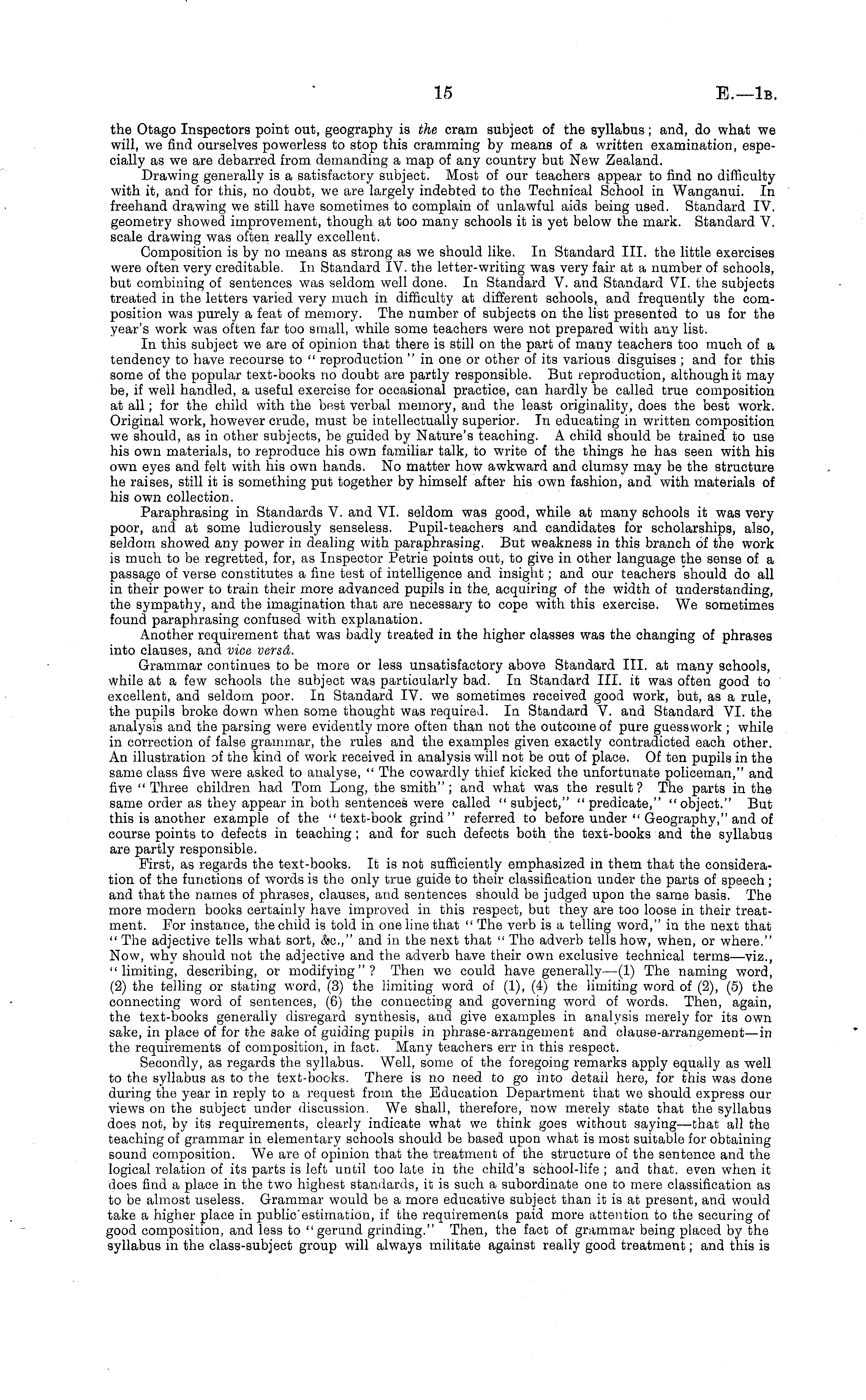 the Otago Inspectors point out, geography is the cram subject of the syllabus; and, do what we will, we find ourselves powerless to stop this cramming by means of a written examination, especially as we are debarred from demanding a map of any country but New Zealand. Drawing generally is a satisfactory subject. Most of our teachers appear to find no difficulty with it, and for this, no doubt, we are largely indebted to the Technical School in Wanganui. In freehand drawing we still have sometimes to complain of unlawful aids being used. Standard IV. geometry showed improvement, though at too many schools it is yet below the mark. Standard V. scale drawing was often really excellent. Composition is by no means as strong as we should like. In Standard 111. the little exercises were often very creditable. In Standard IV. the letter-writing was very fair at a number of schools, but combining of sentences was seldom well done. In Standard V. and Standard VI. the subjects treated in the letters varied very much in difficulty at different schools, and frequently the composition was purely a feat of memory. The number of subjects on the list presented to us for the year's work was often far too small, while some teachers were not prepared with any list. In this subject we are of opinion that there is still on the part of many teachers too much of a tendency to have recourse to " reproduction " in one or other of its various disguises ; and for this some of the popular text-books no doubt are partly responsible. But reproduction, although it may be, if well handled, a useful exercise for occasional practice, can hardly be called true composition at all; for the child with the best verbal memory, and the least originality, does the best work. Original work, however crude, must be intellectually superior. In educating in written composition we should, as in other subjects, be guided by Nature's teaching. A child should be trained to use his own materials, to reproduce his own familiar talk, to write of the things he has seen with his own eyes and felt with his own hands. No matter how awkward and clumsy may be the structure he raises, still it is something put together by himself after his own fashion, and with materials of his own collection. Paraphrasing in Standards V. and VI. seldom was good, while at many schools it was very poor, and at some ludicrously senseless. Pupil-teachers and candidates for scholarships, also, seldom showed any power in dealing with paraphrasing. But weakness in this branch of the work is much to be regretted, for, as Inspector Petrie points out, to give in other language the sense of a passage of verse constitutes a fine test of intelligence and insight; and our teachers should do all in their power to train their more advanced pupils in the. acquiring of the width of understanding, the sympathy, and the imagination that are necessary to cope with this exercise. We sometimes found paraphrasing confused with explanation. Another requirement that was badly treated in the higher classes was the changing of phrases into clauses, and vice versd. Grammar continues to be more or less unsatisfactory above Standard 111. at many schools, while at a few schools the subject was particularly bad. In Standard 111. it was often good to excellent, and seldom poor. In Standard IV. we sometimes received good work, but, as a rule, the pupils broke down when some thought was required. In Standard V. and Standard VI. the analysis and the parsing were evidently more often than not the outcome of pure guesswork ; while in correction of false grammar, the rules and the examples given exactly contradicted each other. An illustration of the kind of work received in analysis will not be out of place. Of ten pupils in the same class five were asked to analyse, " The cowardly thief kicked the unfortunate policeman," and five "Three children had Tom Long, the smith" ; and what was the result? The parts in the same order as they appear in both sentences were called "subject," "predicate," "object." But this is another example of the "text-book grind" referred to before under " Geography," and of course points to defects in teaching; and for such defects both the text-books and the syllabus are partly responsible. First, as regards the text-books. It is not sufficiently emphasized in them that the consideration of the functions of words is the only true guide to their classification under the parts of speech; and that the names of phrases, clauses, and sentences should be judged upon the same basis. The more modern books certainly have improved in this respect, but they are too loose in their treatment. For instance, the child is told in one line that " The verb is a telling word," in the next that " The adjective tells what sort, &c," and in the next that " The adverb tells how, when, or where." Now, why should not the adjective and the adverb have their own exclusive technical terms—viz., "limiting, describing, or modifying"? Then we could have generally —(1) The naming word, (2) the telling or stating word, (3) the limiting word of (1), (4) the limiting word of (2), (5) the connecting word of sentences, (6) the connecting and governing word of words. Then, again, the text-books generally disregard synthesis, and give examples in analysis merely for its own sake, in place of for the sake of guiding pupils in phrase-arrangement and clause-arrangement—in the requirements of composition, in fact. Many teachers err in this respect. Secondly, as regards the syllabus. Well, some of the foregoing remarks apply equally as well to the syllabus as to the text-books. There is no need to go into detail here, for this was done during the year in reply to a request from the Education Department that we should express our views on the subject under discussion. We shall, therefore, now merely state that the syllabus does not, by its requirements, clearly indicate what we think goes without saying—-that al