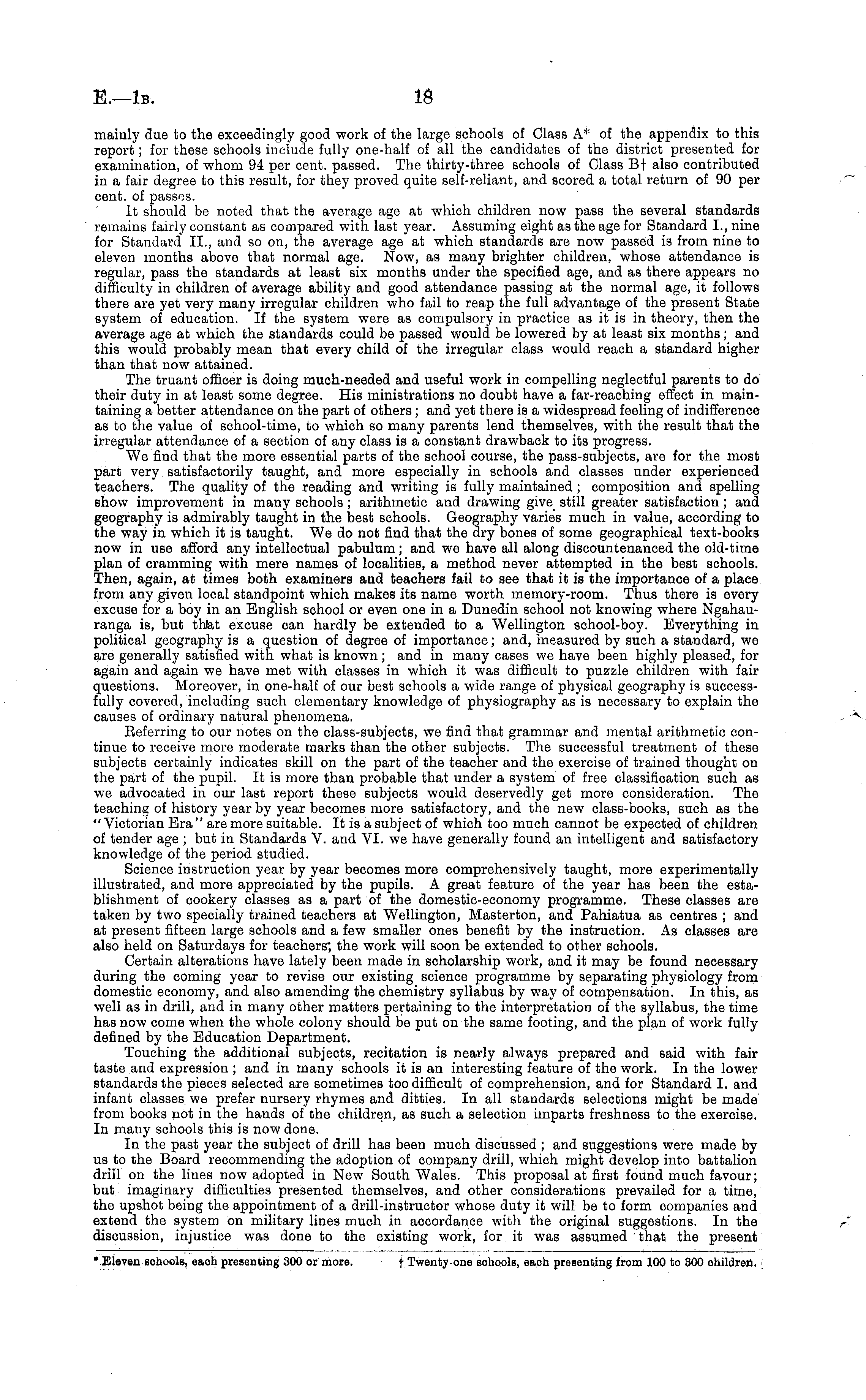 mainly due to the exceedingly good work of the large schools of Class A* of the appendix to this report; for these schools include fully one-half of all the candidates of the district presented for examination, of whom 94 per cent, passed. The thirty-three schools of Class Bf also contributed in a fair degree to this result, for they proved quite self-reliant, and scored a total return of 90 per cent, of passes. It should be noted that the average age at which children now pass the several standards remains fairly constant as compared with last year. Assuming eight as the age for Standard 1., nine for Standard 11., and so on, the average age at which standards are now passed is from nine to eleven months above that normal age. Now, as many brighter children, whose attendance is regular, pass the standards at least six months under the specified age, and as there appears no difficulty in children of average ability and good attendance passing at the normal age, it follows there are yet very many irregular children who fail to reap the full advantage of the present State system of education. If the system were as compulsory in practice as it is in theory, then the average age at which the standards could be passed would be lowered by at least six months; and this would probably mean that every child of the irregular class would reach a standard higher than that now attained. The truant officer is doing much-needed and useful work in compelling neglectful parents to do their duty in at least some degree. His ministrations no doubt have a far-reaching effect in maintaining a better attendance on the part of others; and yet there is a widespread feeling of indifference as to the value of school-time, to which so many parents lend themselves, with the result that the irregular attendance of a section of any class is a constant drawback to its progress. We find that the more essential parts of the school course, the pass-subjects, are for the most part very satisfactorily taught, and more especially in schools and classes under experienced teachers. The quality of the reading and writing is fully maintained ; composition and spelling show improvement in many schools; arithmetic and drawing give still greater satisfaction ; and geography is admirably taught in the best schools. Geography varies much in value, according to the way in which it is taught. We do not find that the dry bones of some geographical text-books now in use afford any intellectual pabulum; and we have all along discountenanced the old-time plan of cramming with mere names of localities, a method never attempted in the best schools. Then, again, at times both examiners and teachers fail to see that it is the importance of a place from any given local standpoint which makes its name worth memory-room. Thus there is every excuse for a boy in an English school or even one in a Dunedin school not knowing where Ngahauranga is, but that excuse can hardly be extended to a Wellington school-boy. Everything in political geography is a question of degree of importance; and, measured by such a standard, we are generally satisfied with what is known ; and in many cases we have been highly pleased, for again and again we have met with classes in which it was difficult to puzzle children with fair questions. Moreover, in one-half of our best schools a wide range of physical geography is successfully covered, including such elementary knowledge of physiography as is necessary to explain the causes of ordinary natural phenomena. Beferring to our notes on the class-subjects, we find that grammar and mental arithmetic continue to receive more moderate marks than the other subjects. The successful treatment of these subjects certainly indicates skill on the part of the teacher and the exercise of trained thought on the part of the pupil. It is more than probable that under a system of free classification such as we advocated in our last report these subjects would deservedly get more consideration. The teaching of history year by year becomes more satisfactory, and the new class-books, such as the "Victorian Era" are more suitable. It is a subject of which too much cannot be expected of children of tender age ; but in Standards V. and VI. we have generally found an intelligent and satisfactory knowledge of the period studied. Science instruction year by year becomes more comprehensively taught, more experimentally illustrated, and more appreciated by the pupils. A great feature of the year has been the establishment of cookery classes as a part of the domestic-economy programme. These classes are taken by two specially trained teachers at Wellington, Masterton, and Pahiatua as centres ; and at present fifteen large schools and a few smaller ones benefit by the instruction. As classes are also held on Saturdays for teachers", the work will soon be extended to other schools. Certain alterations have lately been made in scholarship work, and it may be found necessary during the coming year to revise our existing science programme by separating physiology from domestic economy, and also amending the chemistry syllabus by way of compensation. In this, as well as in drill, and in many other matters pertaining to the interpretation of the syllabus, the time has now come when the whole colony should be put on the same footing, and the plan of work fully defined by the Education Department. Touching the additional subjects, recitation is nearly always prepared and said with fair taste and expression ; and in many schools it is an interesting feature of the work. In the lower standards the pieces selected are sometimes too difficult of comprehension, and for Standard I. and infant classes we prefer nursery rhymes and ditties. In all standards selections might be made from books not in the hands of the children, as such a selection imparts freshness to the exercise. In many schools this is now done. In the past year the subject of drill has been much disc